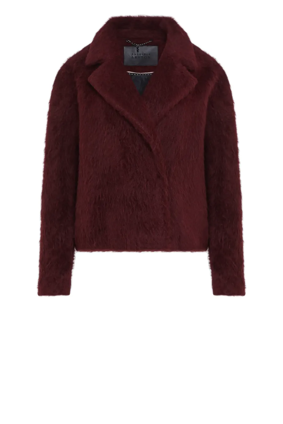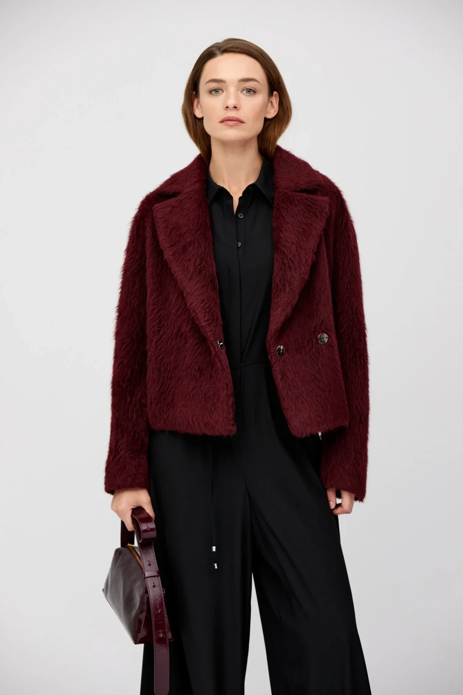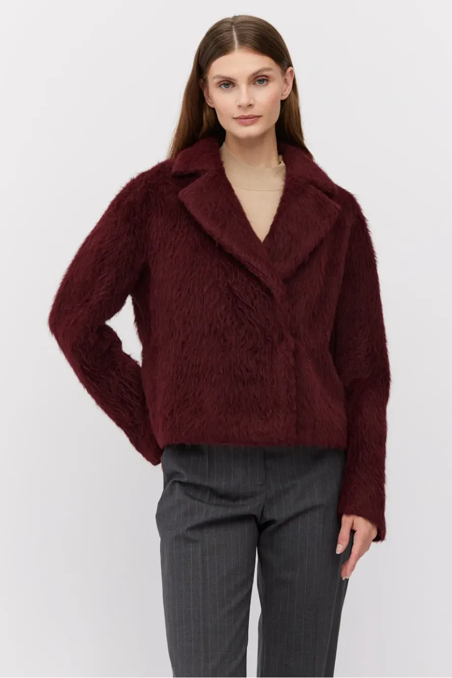 Palton tip sacou din alpaca și lână de miel (virgin). Croială lejeră cu guler. Mâneci lungi. Închidere cu capse. Căptușită cu bordură decorativă. Culoare vișinie.