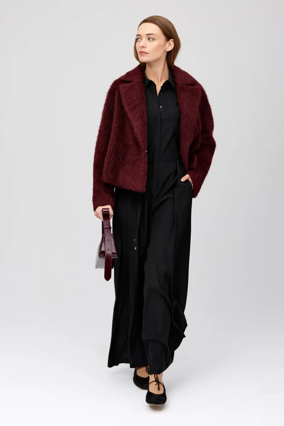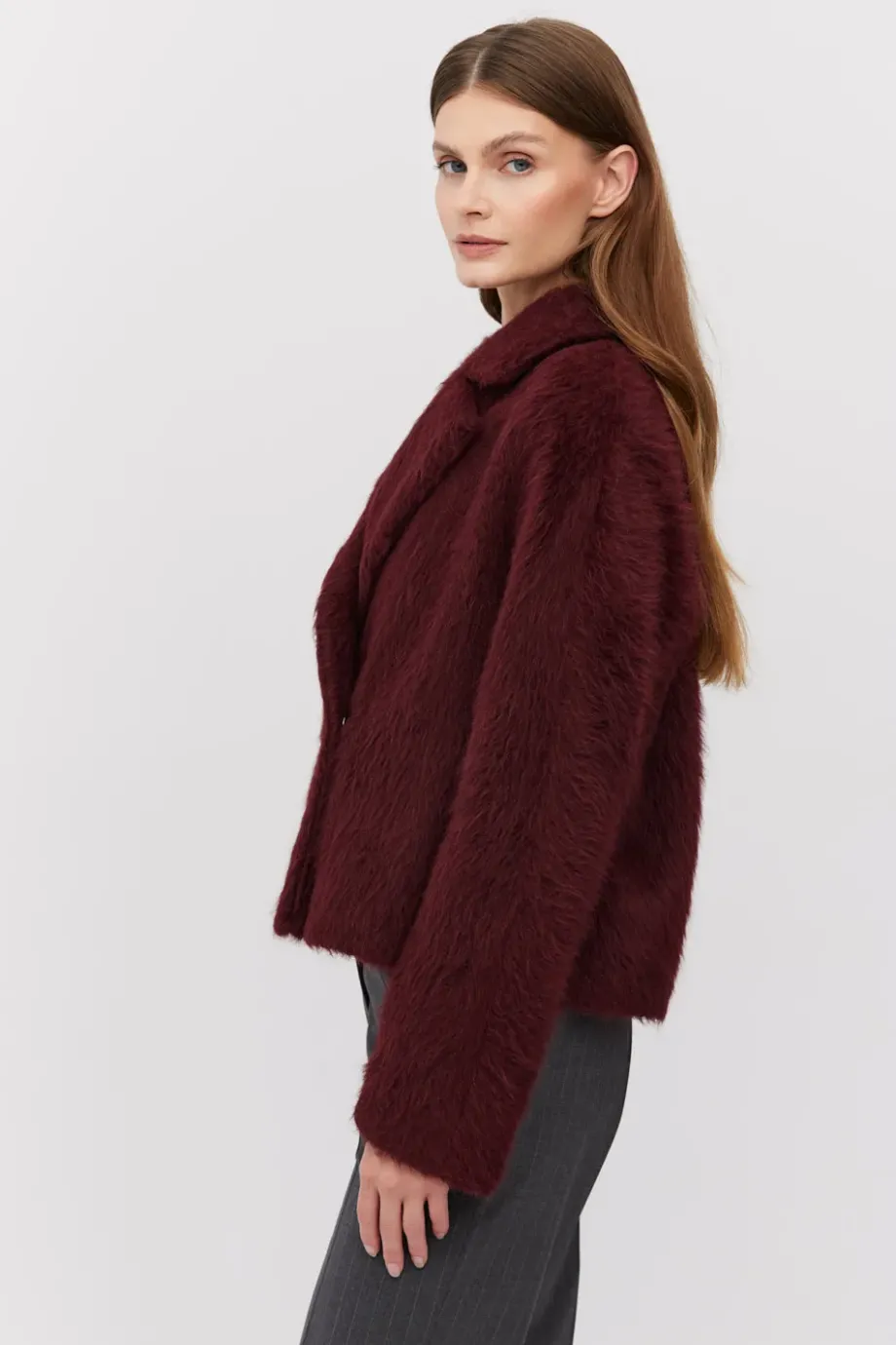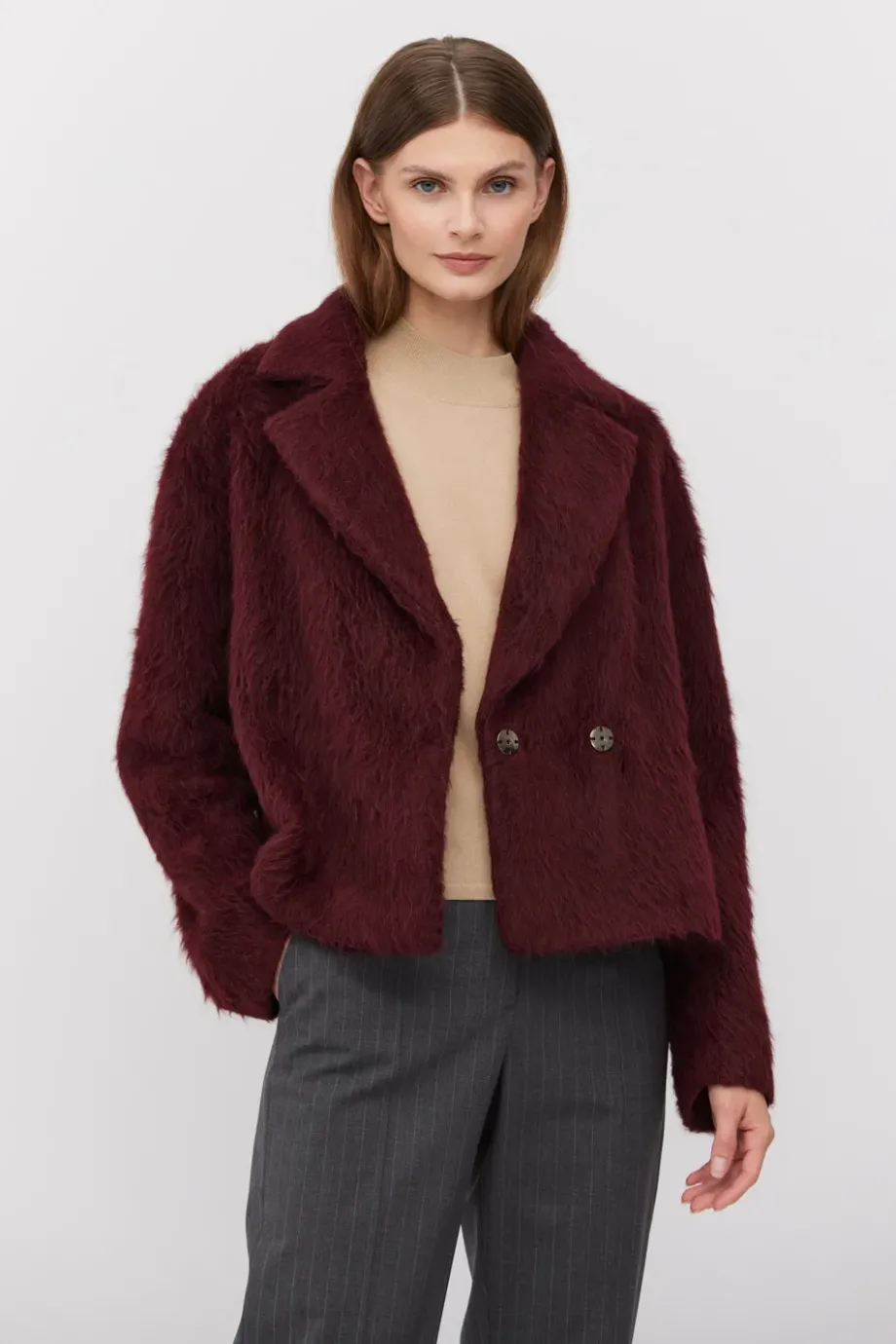 Palton tip sacou din alpaca și lână de miel (virgin). Croială lejeră cu guler. Mâneci lungi. Închidere cu capse. Căptușită cu bordură decorativă. Culoare vișinie.
