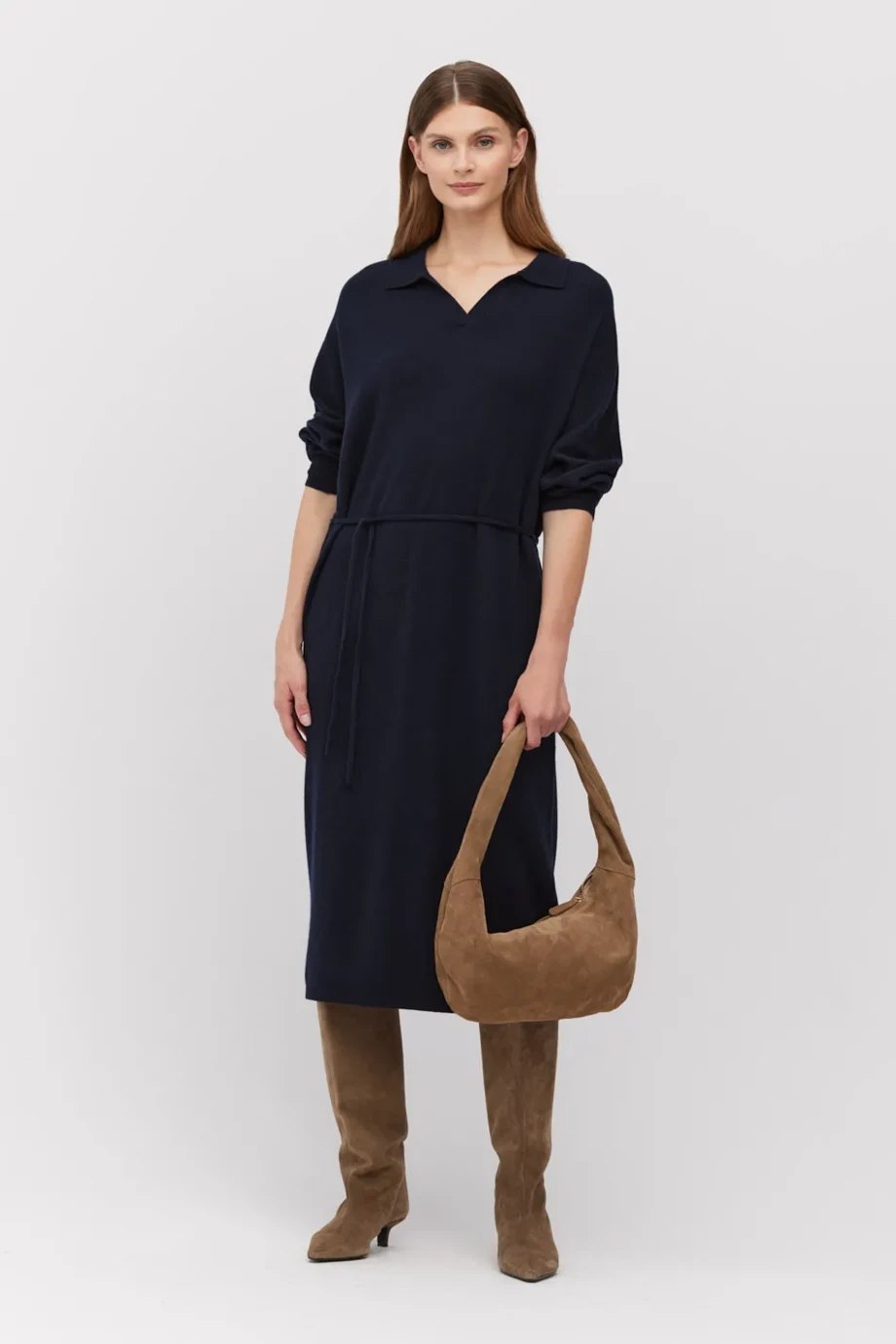Rochie de culoare albastru royal închis, confecționată din lână merinos și cașmir. Croială simplă, lejeră, cu guler polo, mâneci lungi și centură ce subliniază talia. Material tricotat jersey, cu finețea 12 GG.