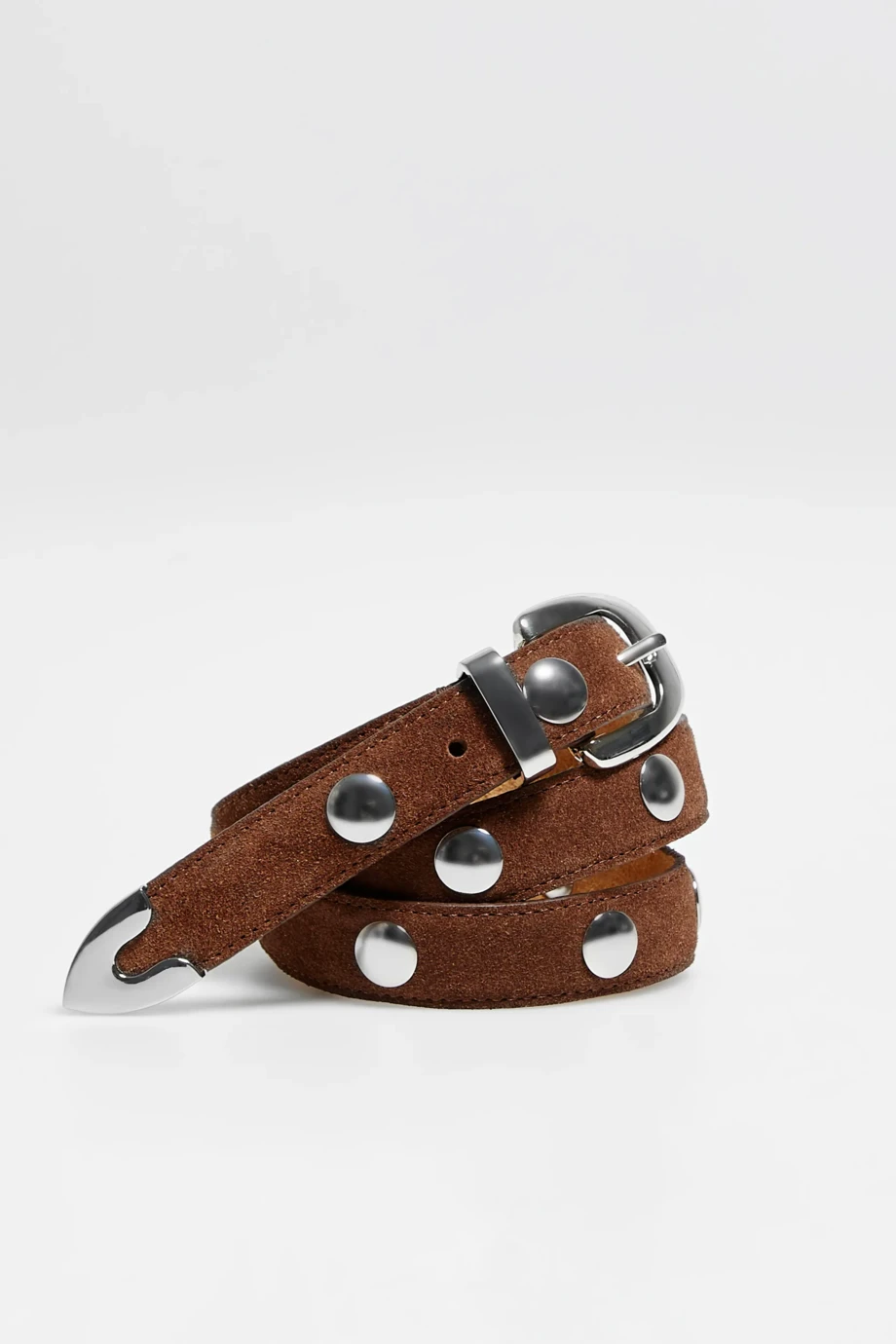 Curea maro din piele întoarsă. Cataramă metalică, ținte decorative. Confecționat manual într-un atelier portughez.