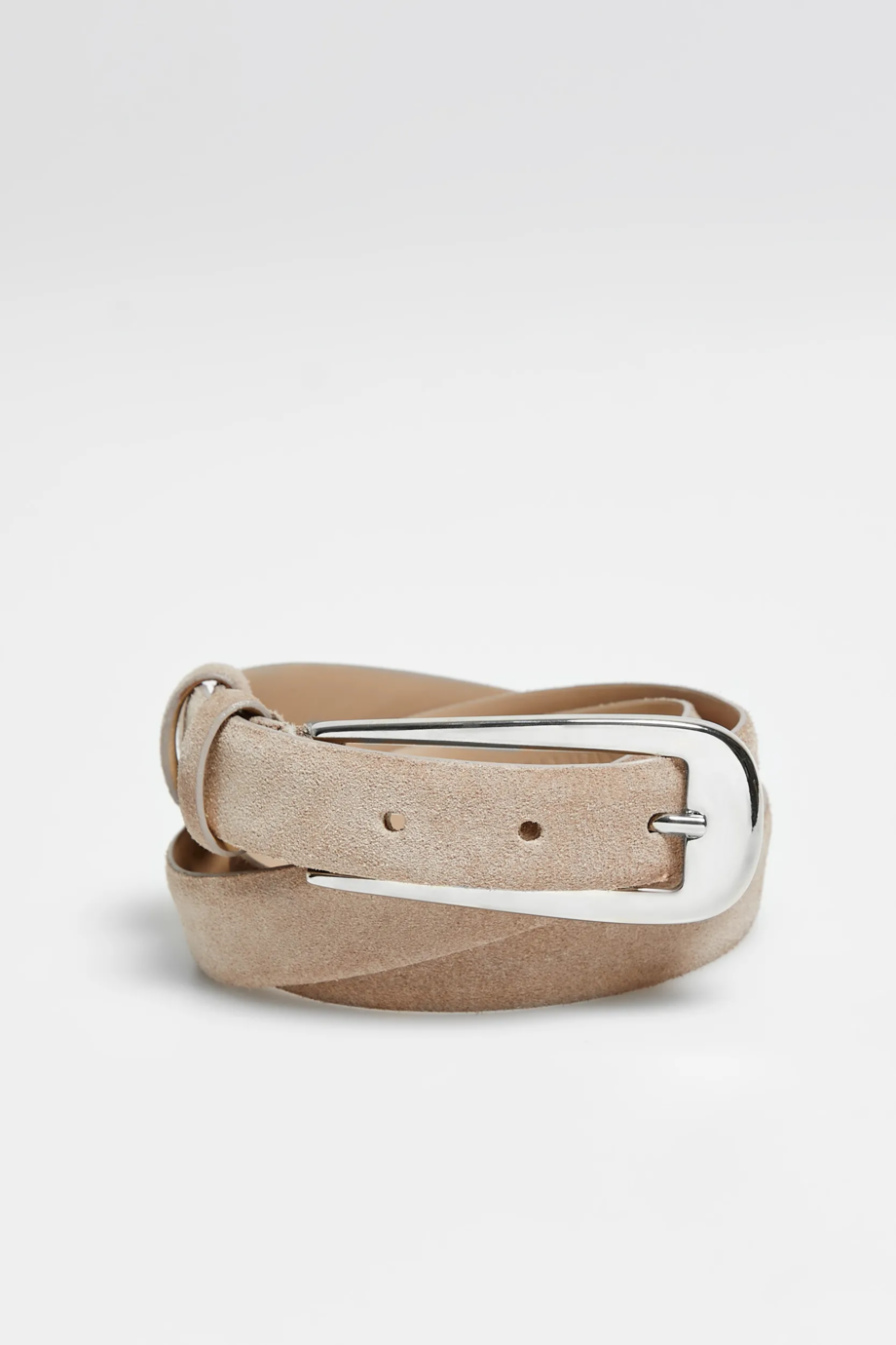 Curea bej din piele întoarsă naturală, cu cataramă argintie. Confecționat manual într-o atelier poloneză.