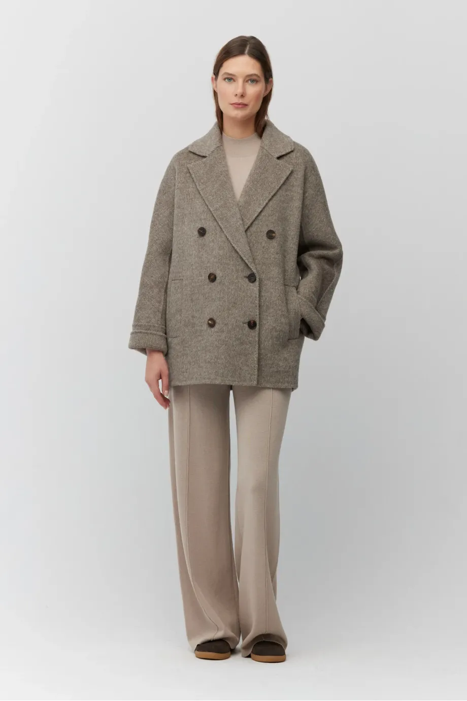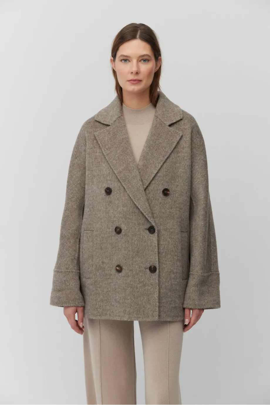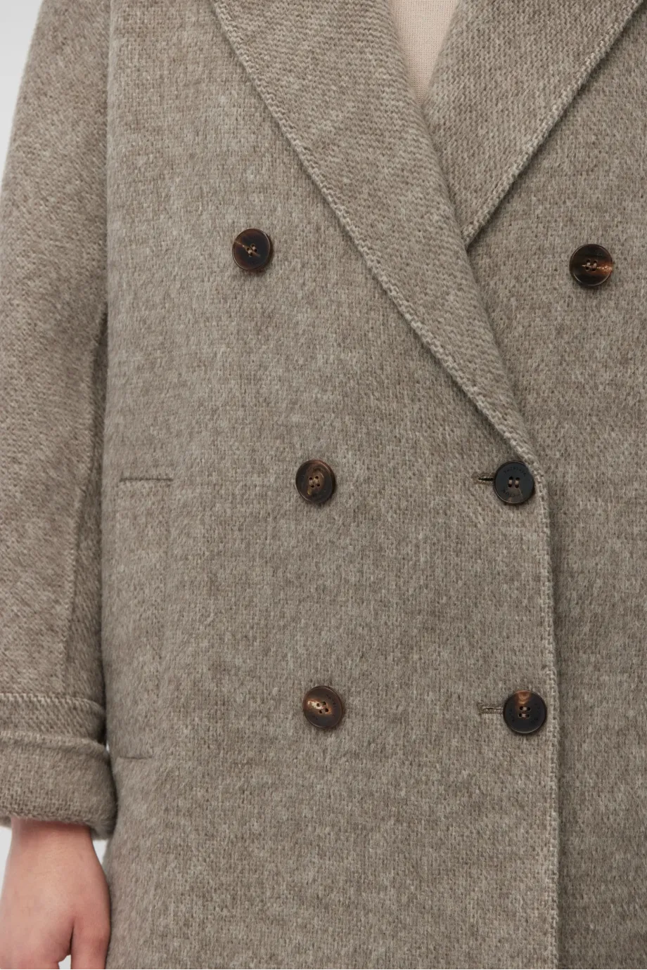 Pardesiu double-face din lână cu adaos de alpaca, culoarea maro, cu model în spic. Croială lejeră, fără căptușeală, cu două rânduri de nasturi, guler și buzunare.