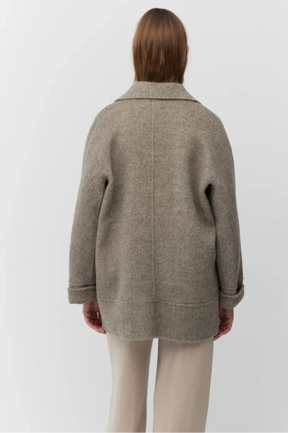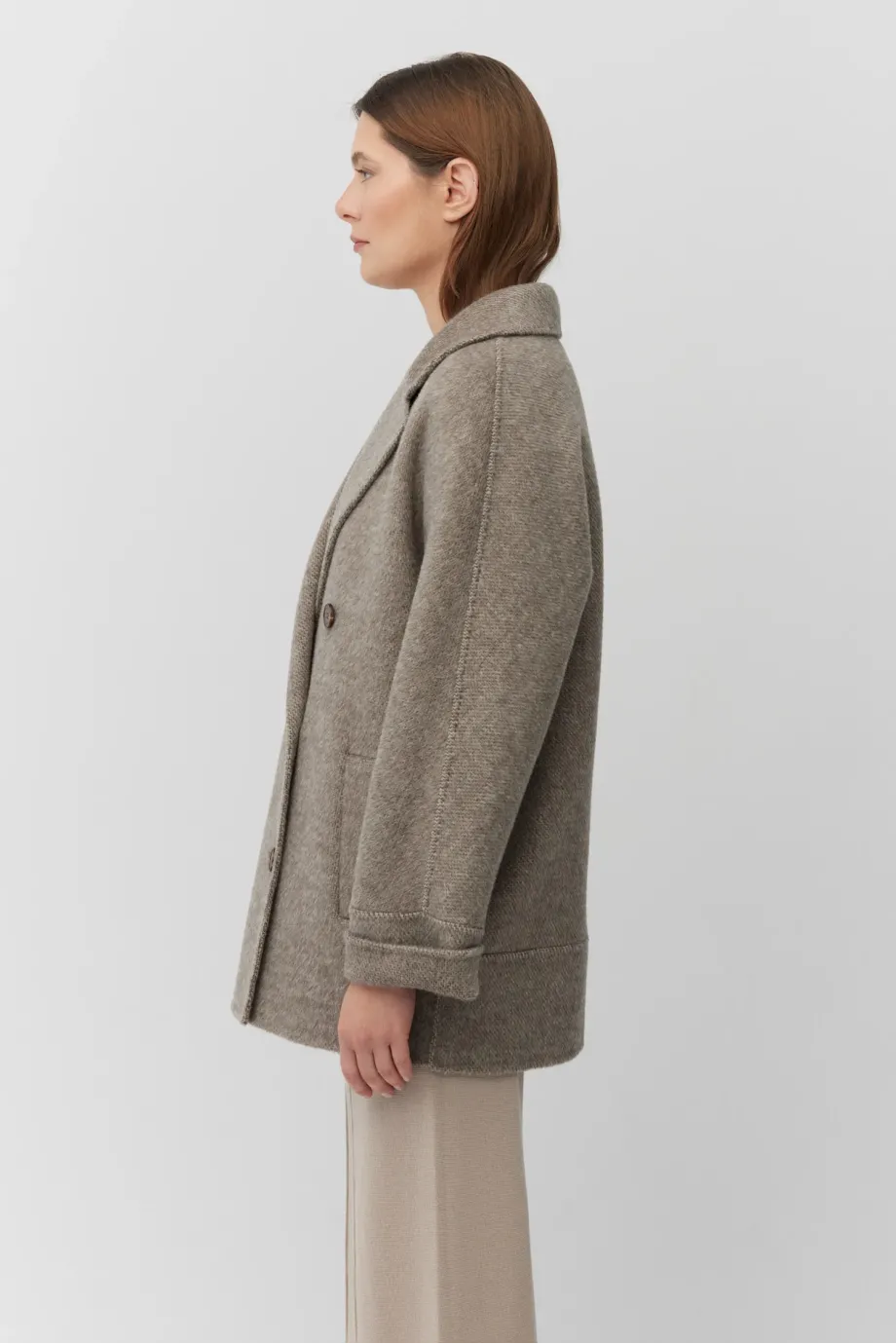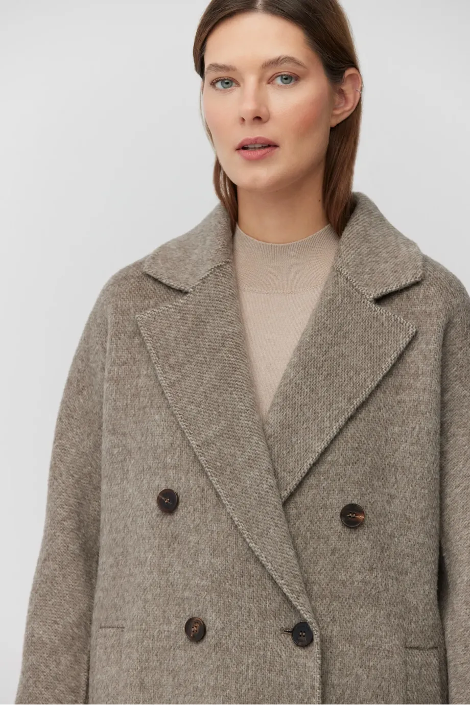 Pardesiu double-face din lână cu adaos de alpaca, culoarea maro, cu model în spic. Croială lejeră, fără căptușeală, cu două rânduri de nasturi, guler și buzunare.