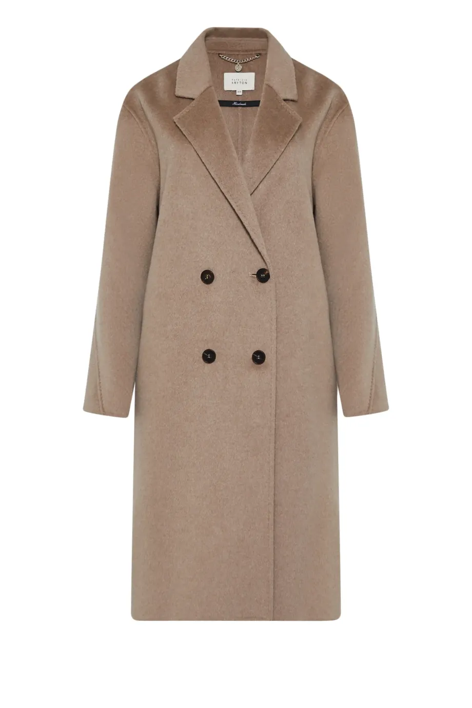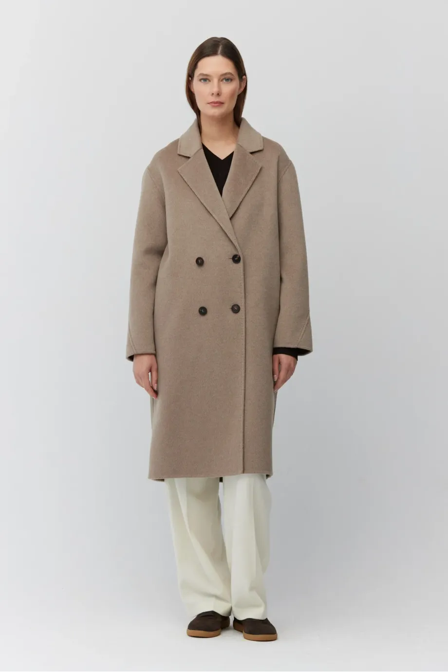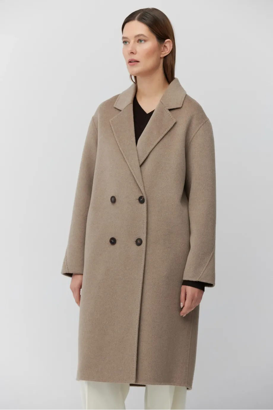 Palton double-face, culoarea maro deschis, din amestec de lână, mătase și cașmir. Dublu rând de nasturi, cu guler și buzunare. Croială dreaptă, lejeră, fără căptușeală.