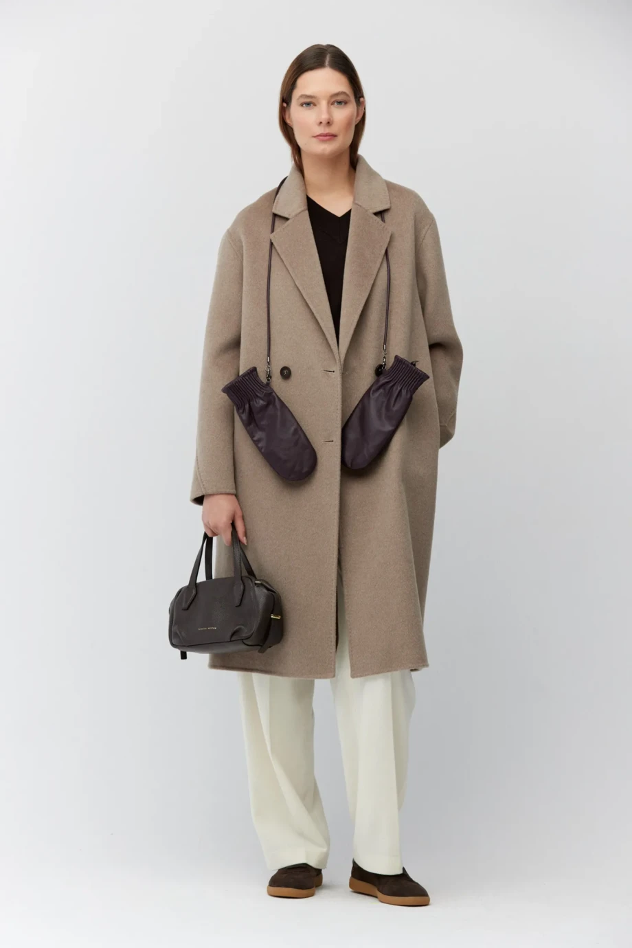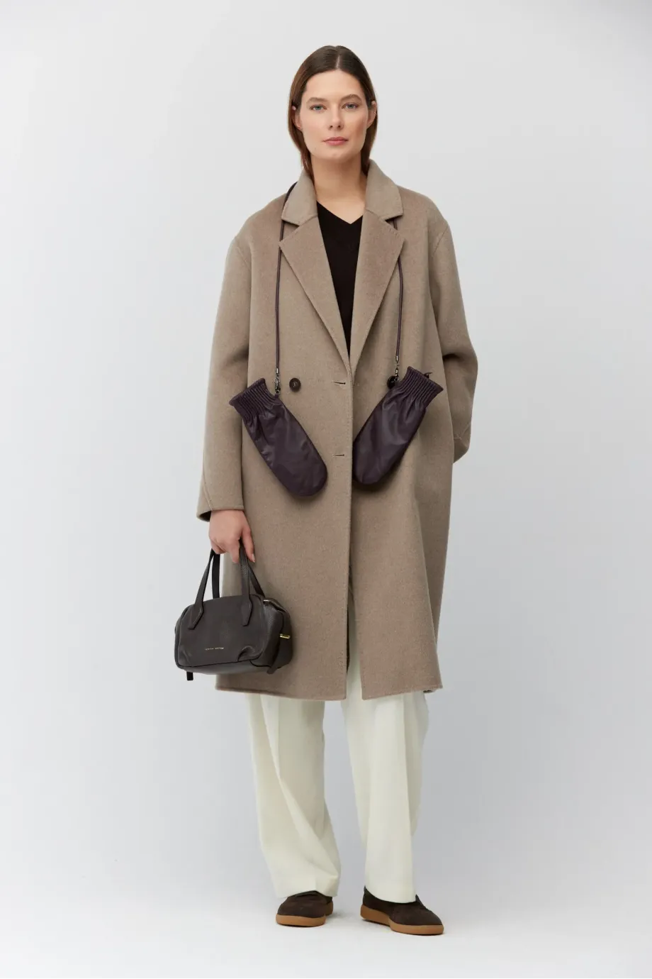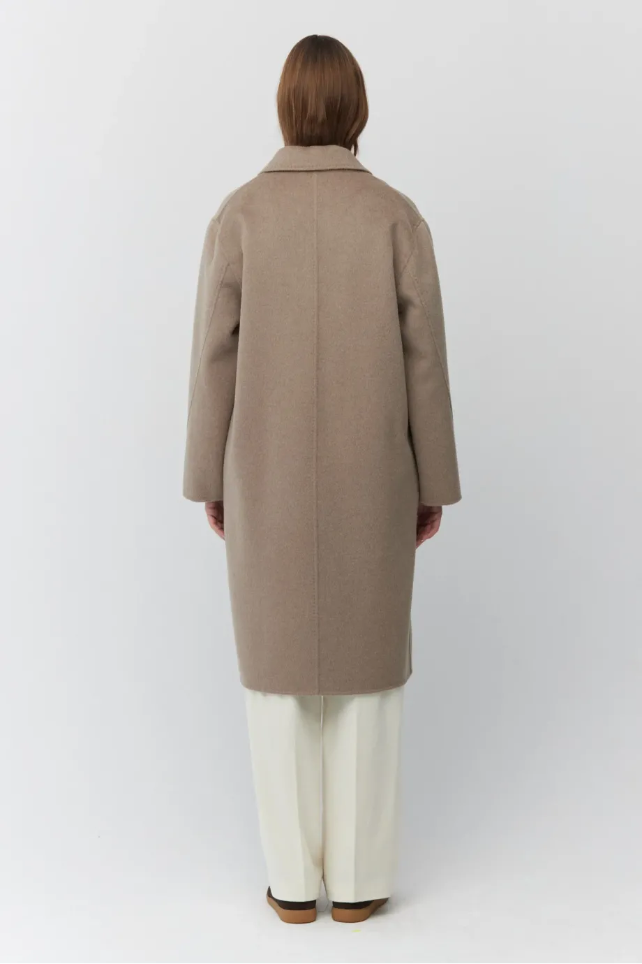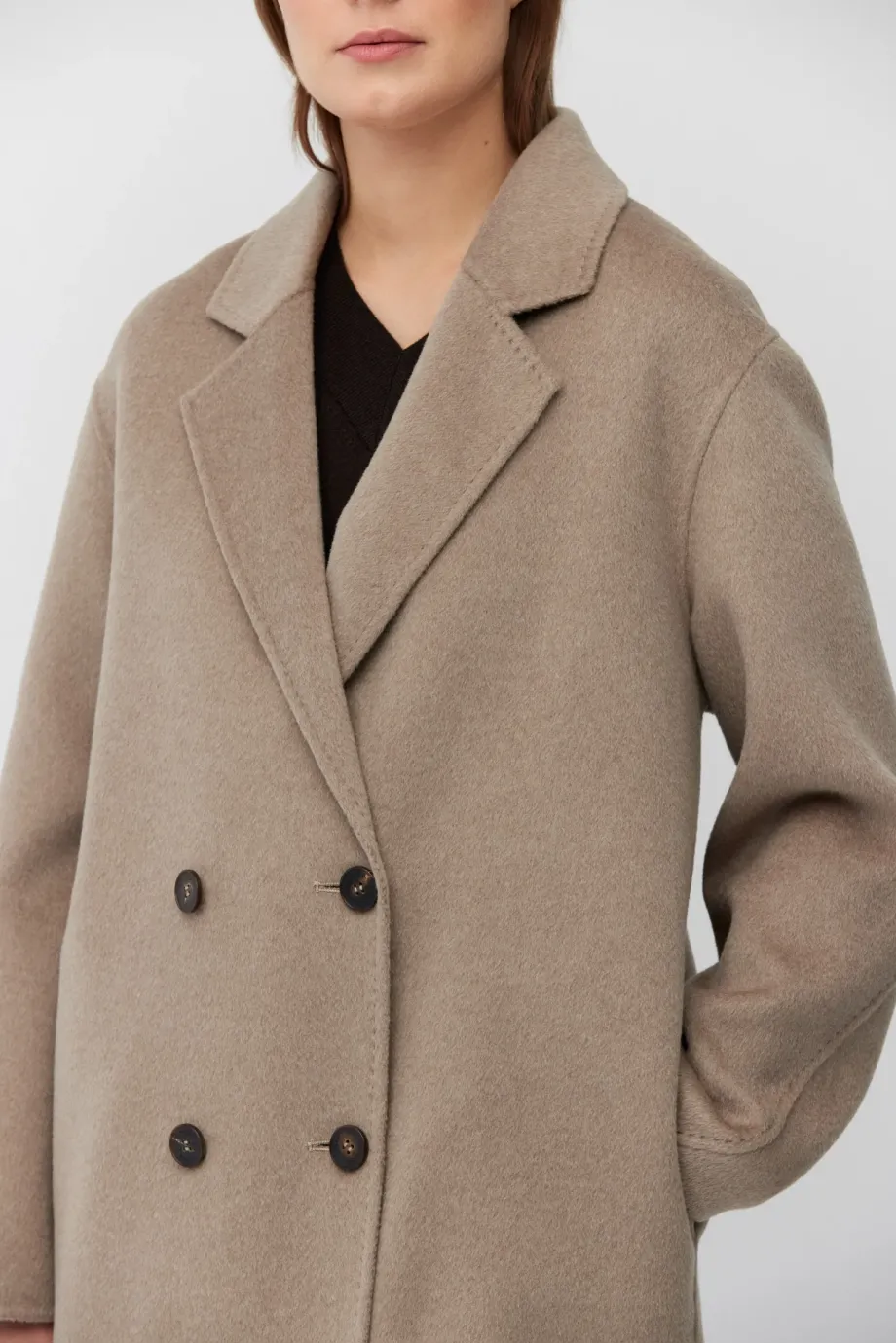 Palton double-face, culoarea maro deschis, din amestec de lână, mătase și cașmir. Dublu rând de nasturi, cu guler și buzunare. Croială dreaptă, lejeră, fără căptușeală.