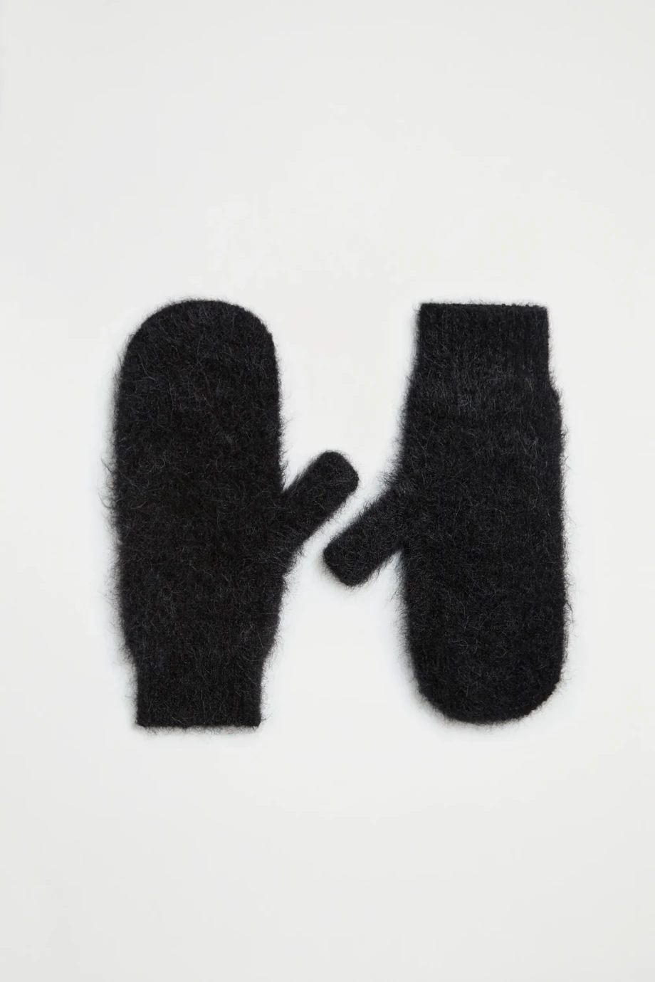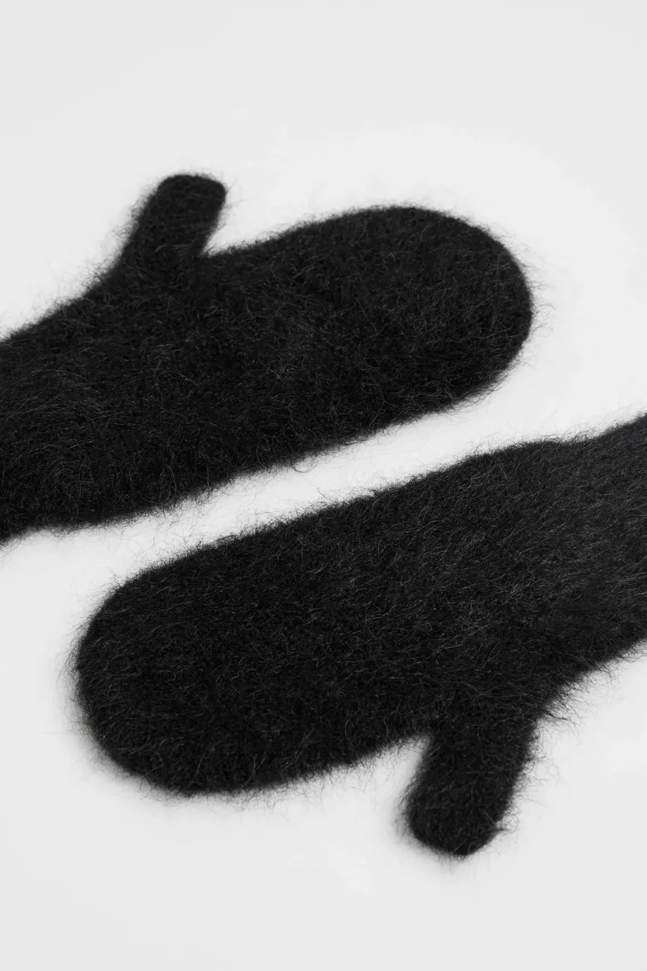 Mănuși negre din lână de alpaca Suri, tricot single-jersey cu fir lung, confecționat la mașină de calibru 3 GG.