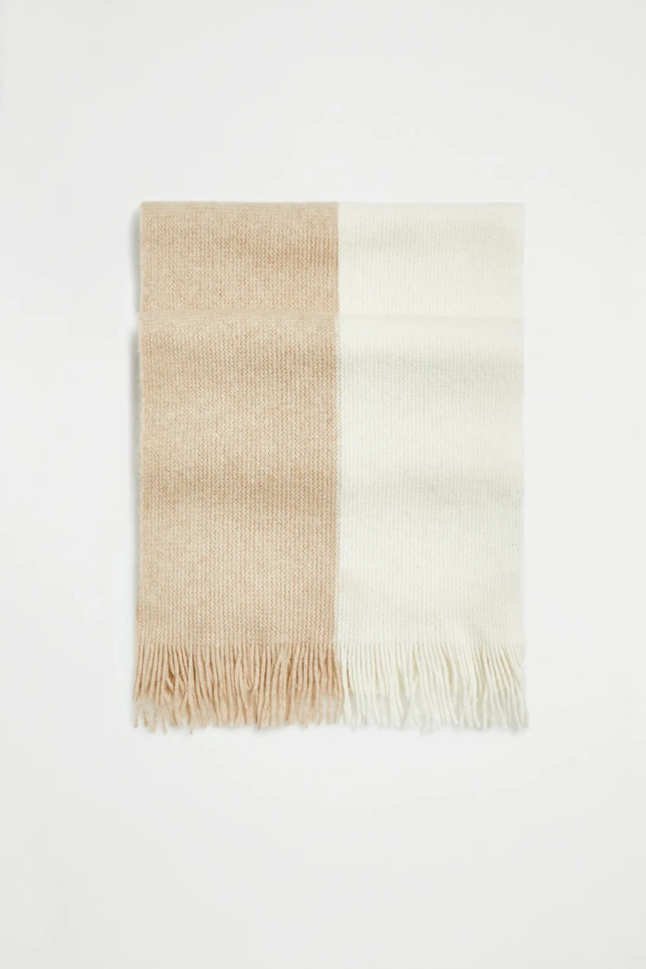 Eșarfă cu franjuri la bază, culoare crem-bej. 100% din cașmir.