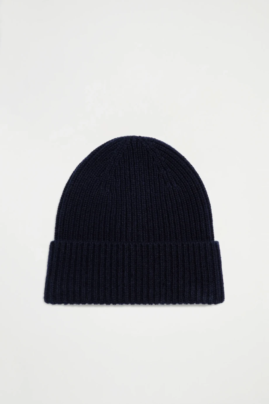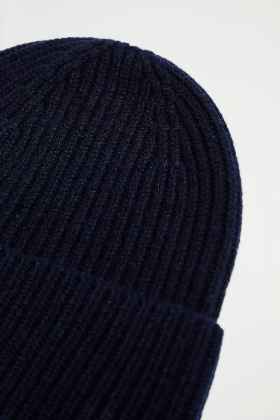 Căciulă din amestec de lână și cașmir, tricot moale în punct rib englezesc. Culoarea albastru royal închis.