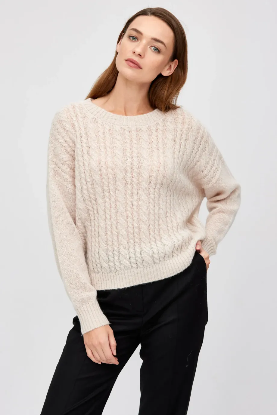 Pulover din lână merinos și mohair. Mâneci lungi, decolteu rotund, croială lejeră, formă scurtă. Tricot moale cu țesătură cable knit, pregătit pe o mașină cu uiglenie 7 GG. Culoare bej.