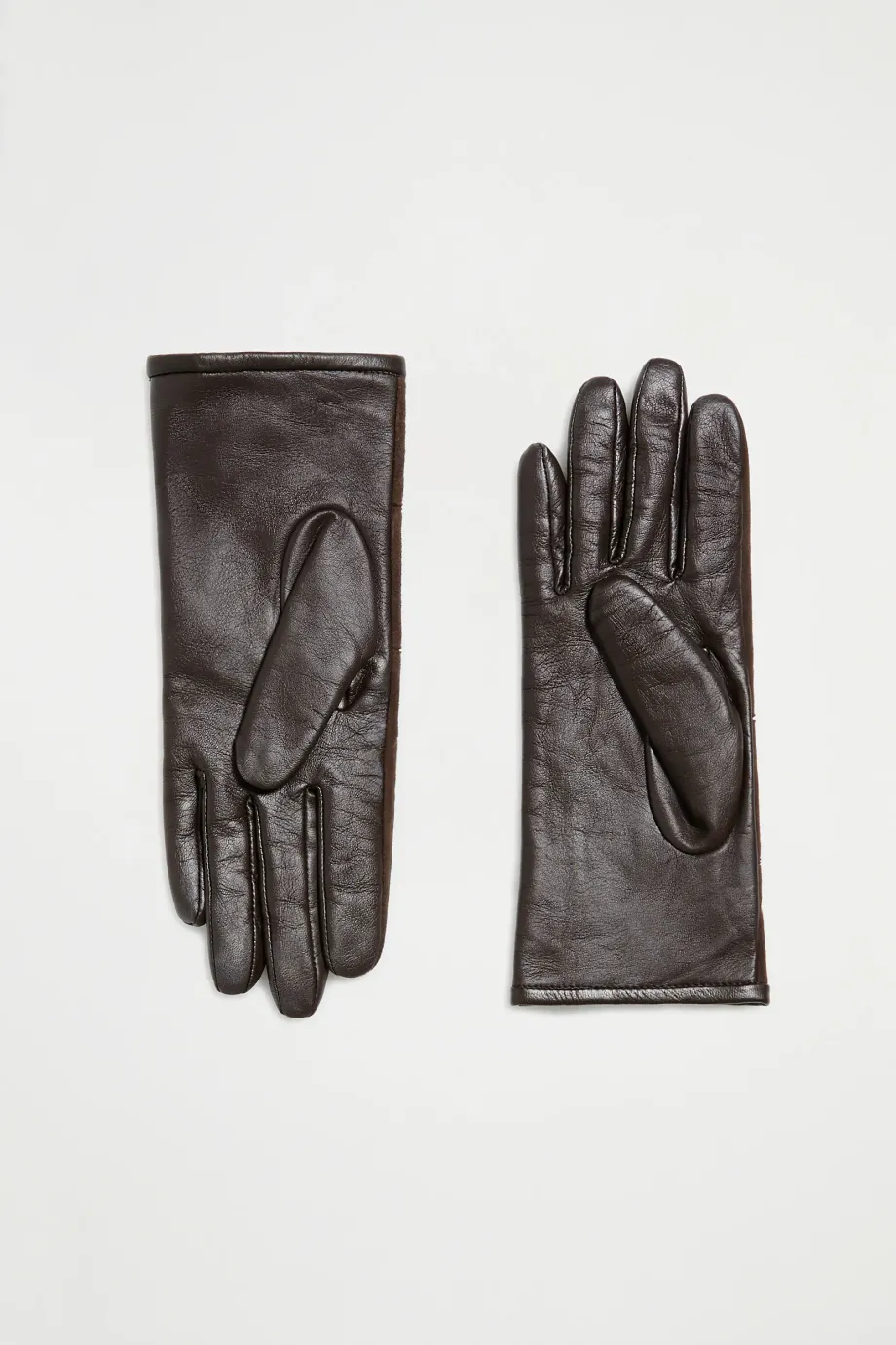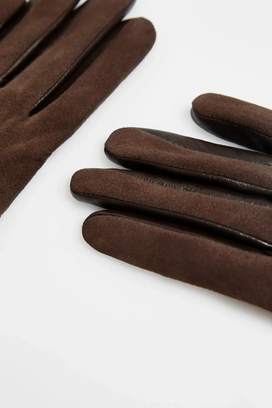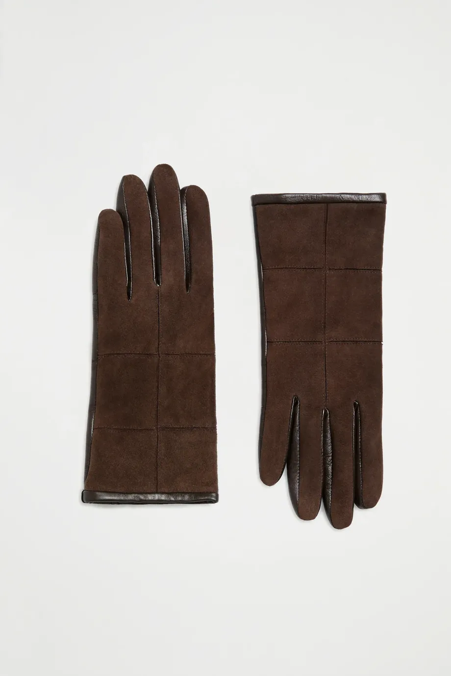 Mănuși din piele întoarsă combinată cu piele nappa, cu căptușeală din cașmir. Culoarea maro.