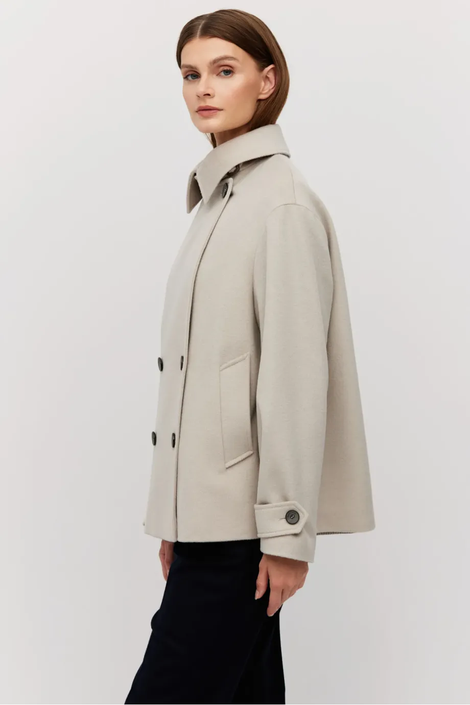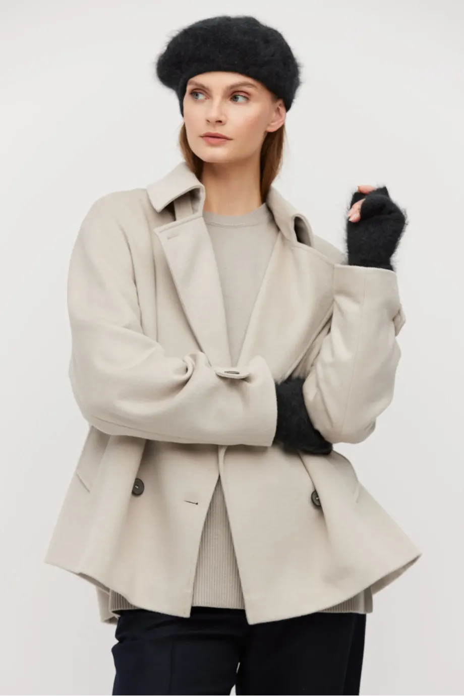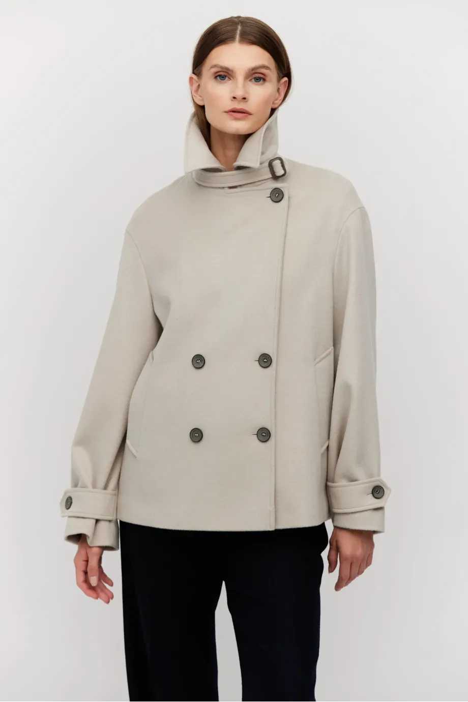 Palton bej din lână, cu croială lejeră. Dublu rând de nasturi, închidere la gât. Căptușită, cu umeri ușor căzuți, pliu la spate și epoleți pe mâneci.