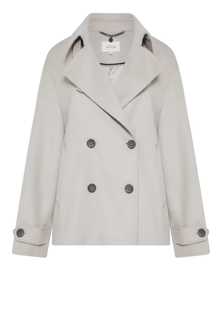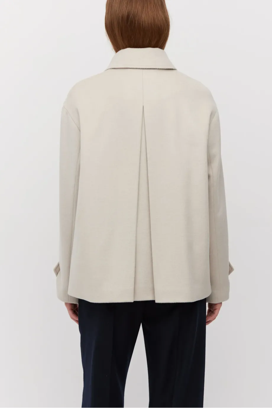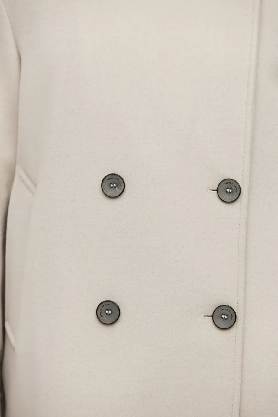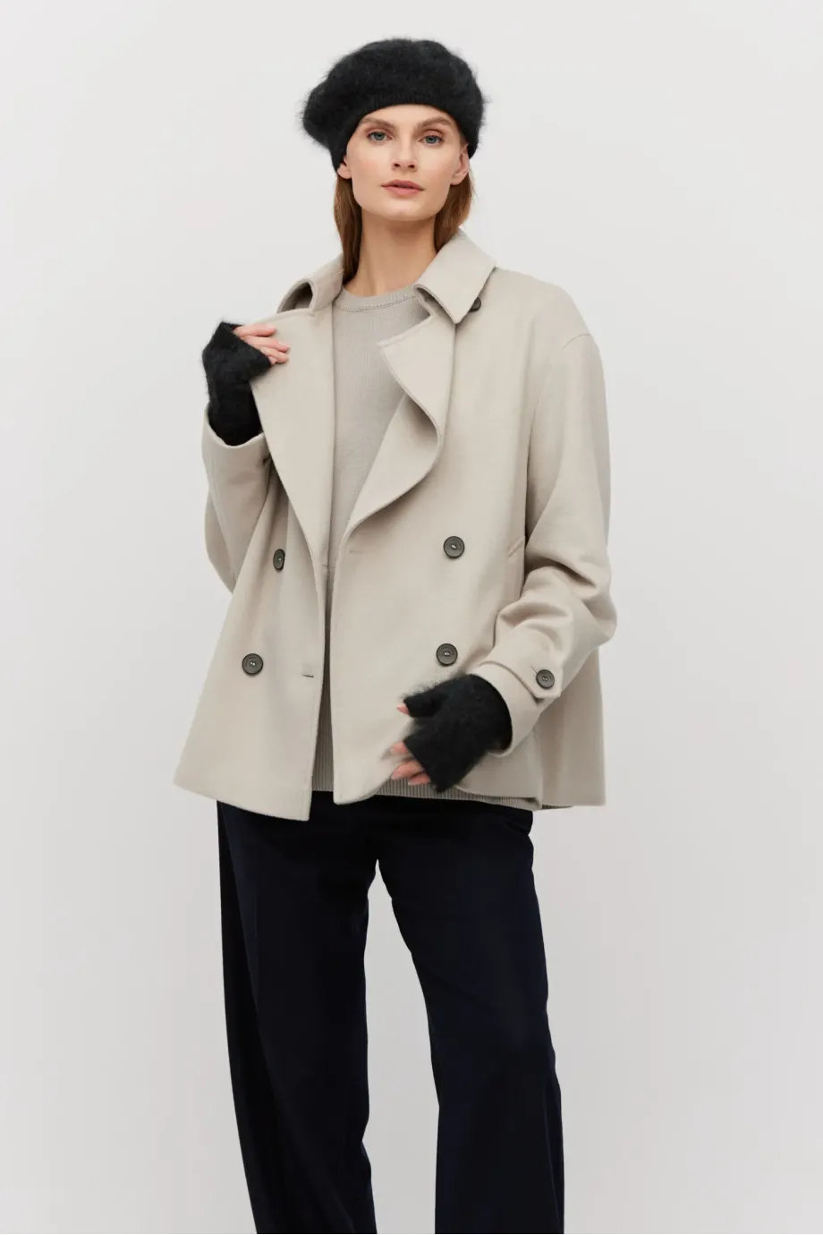 Palton bej din lână, cu croială lejeră. Dublu rând de nasturi, închidere la gât. Căptușită, cu umeri ușor căzuți, pliu la spate și epoleți pe mâneci.