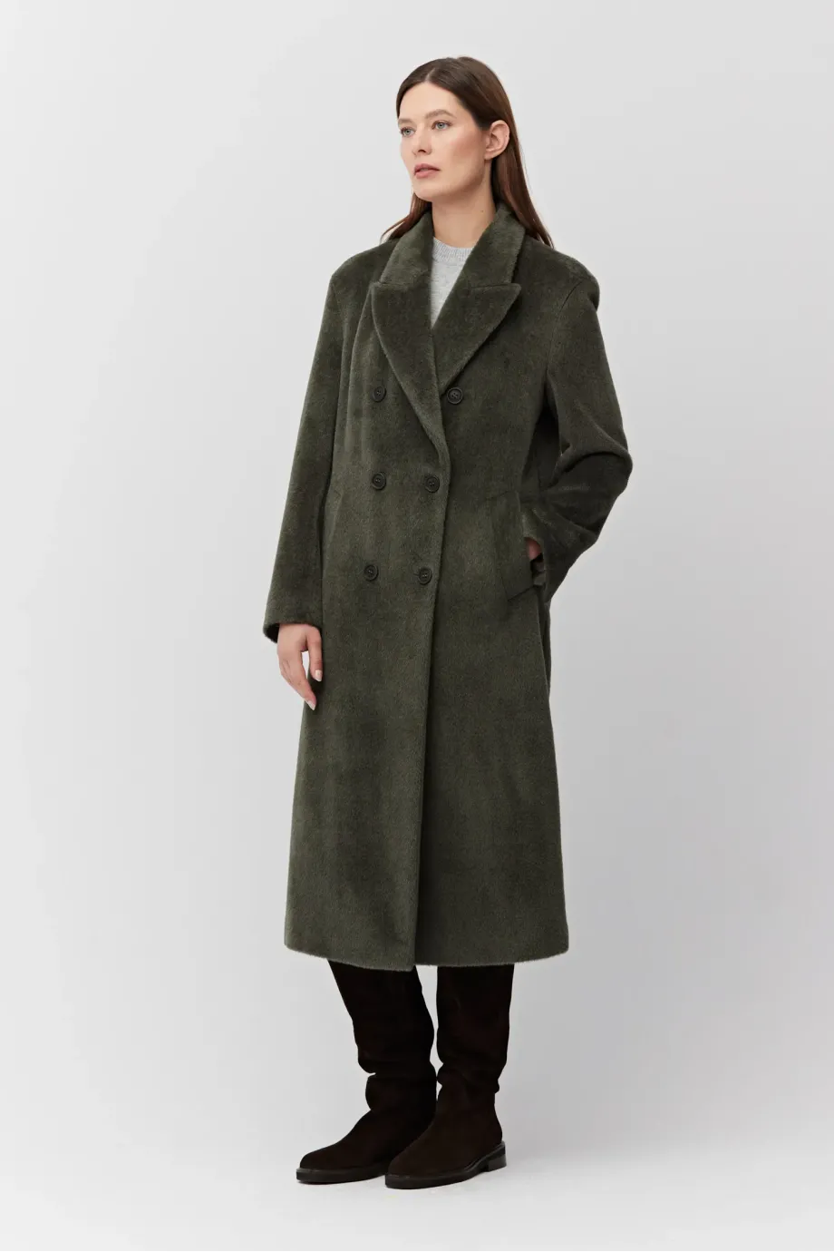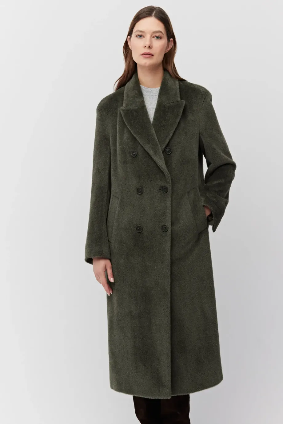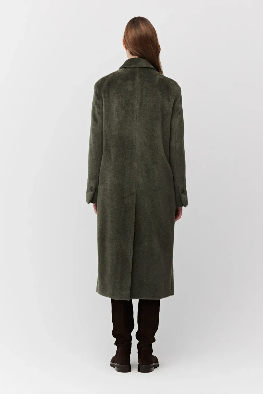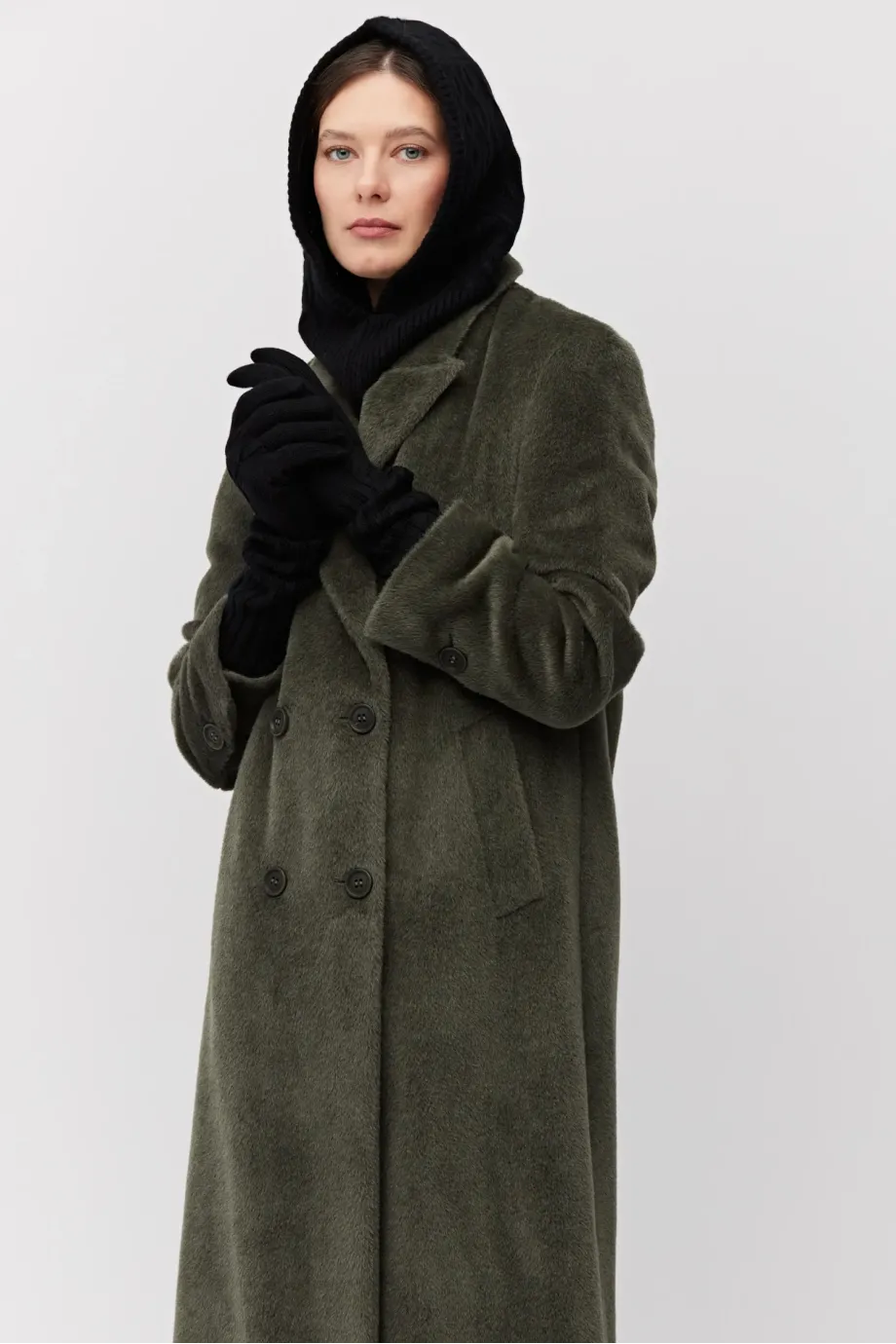 Palton verde militar cu alpaca Suri. Croială lejeră, simplă, cu două rânduri de nasturi naturali. Mâneci kimono, fantă la spate. Căptușit cu paspoal decorativ. Lungime midi.