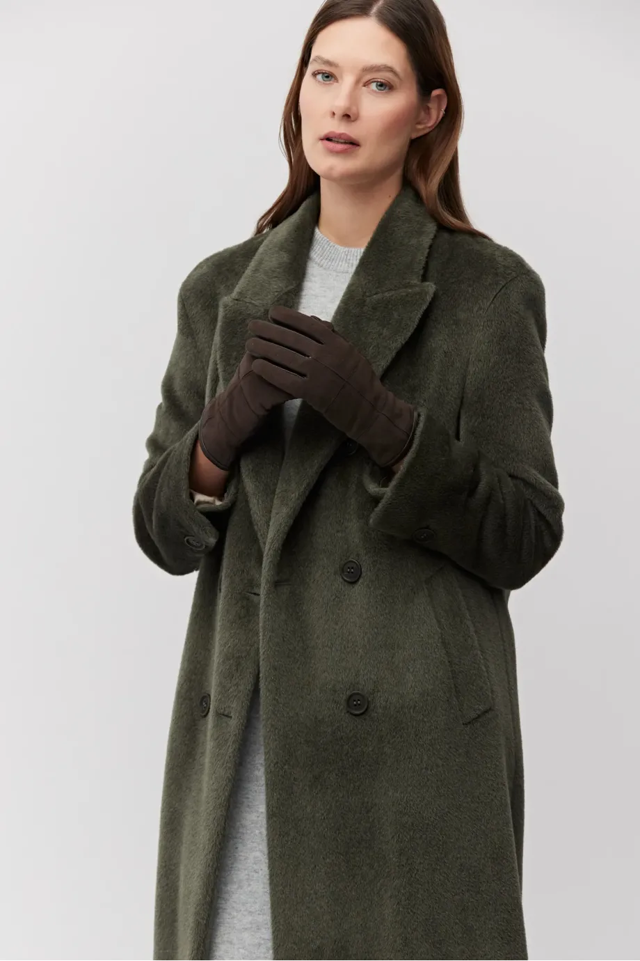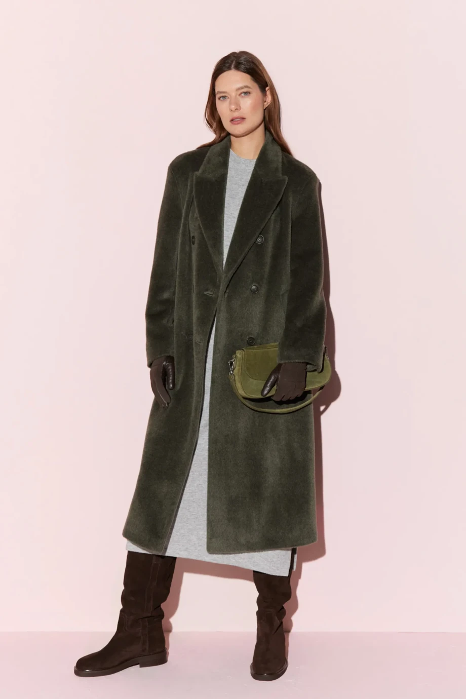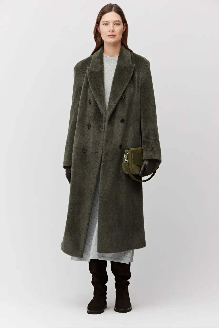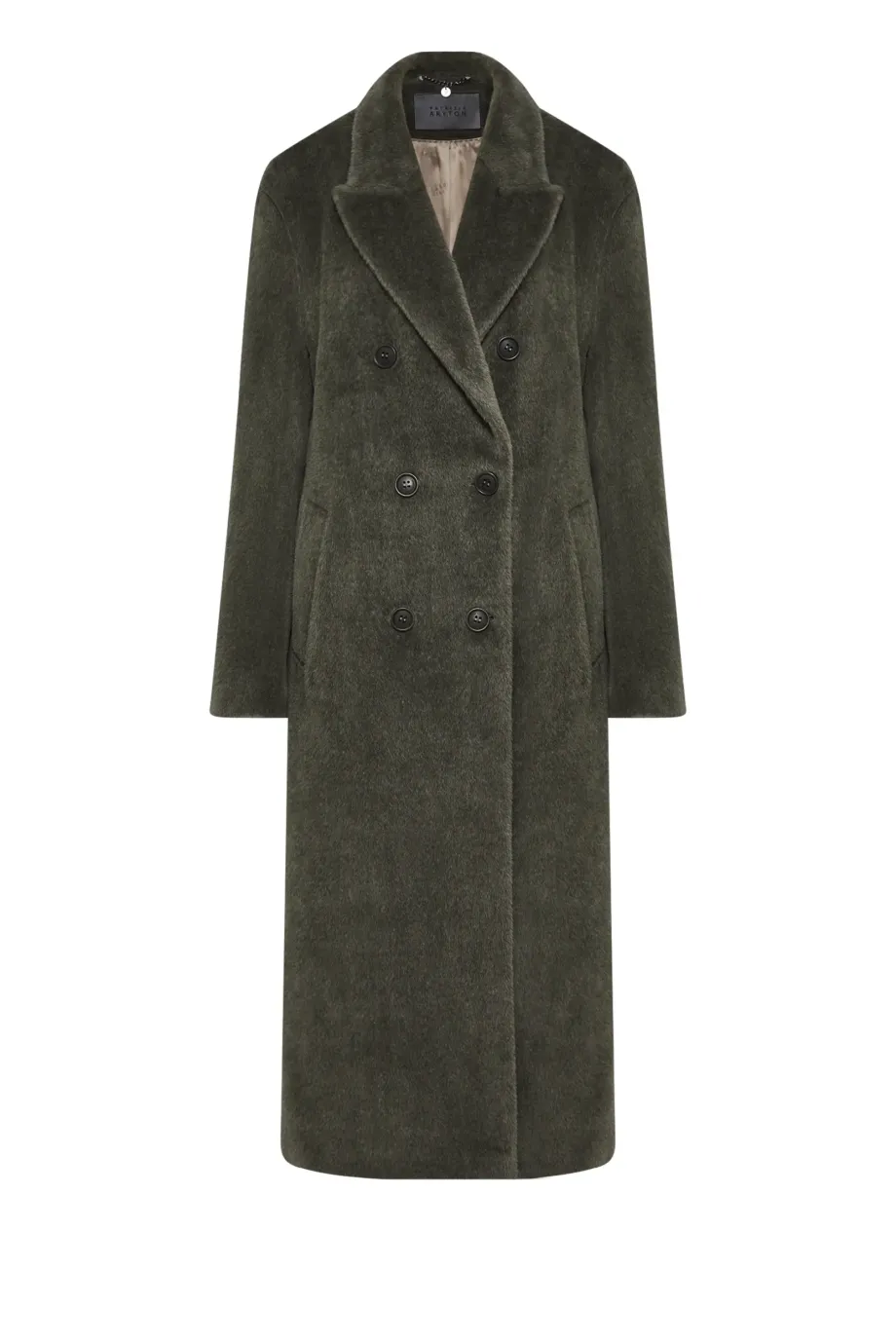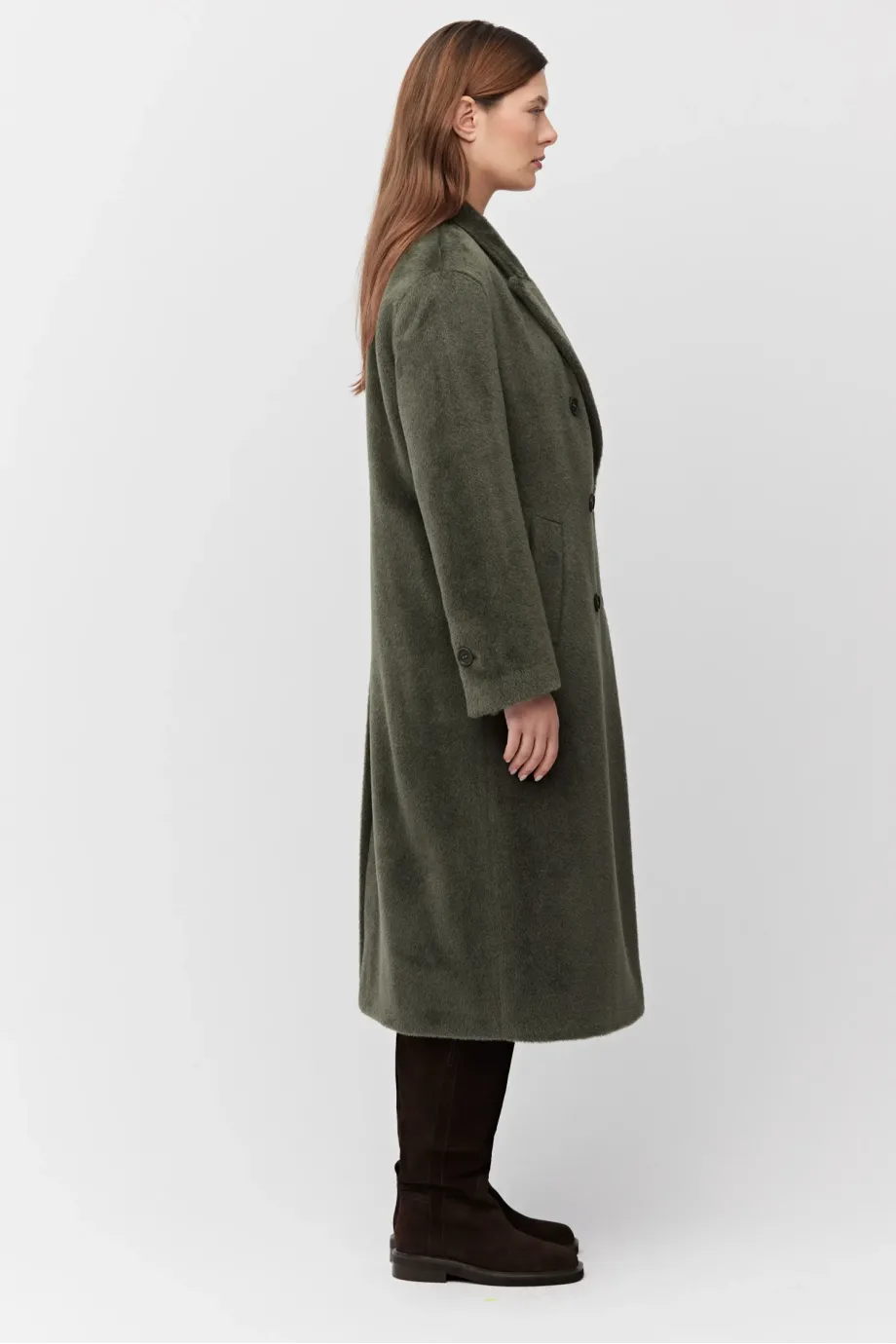 Palton verde militar cu alpaca Suri. Croială lejeră, simplă, cu două rânduri de nasturi naturali. Mâneci kimono, fantă la spate. Căptușit cu paspoal decorativ. Lungime midi.