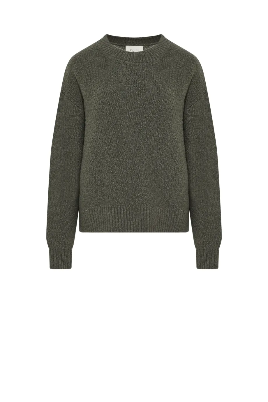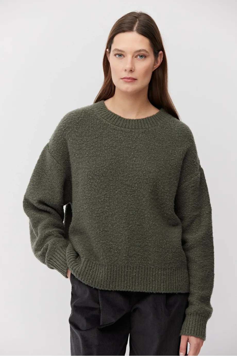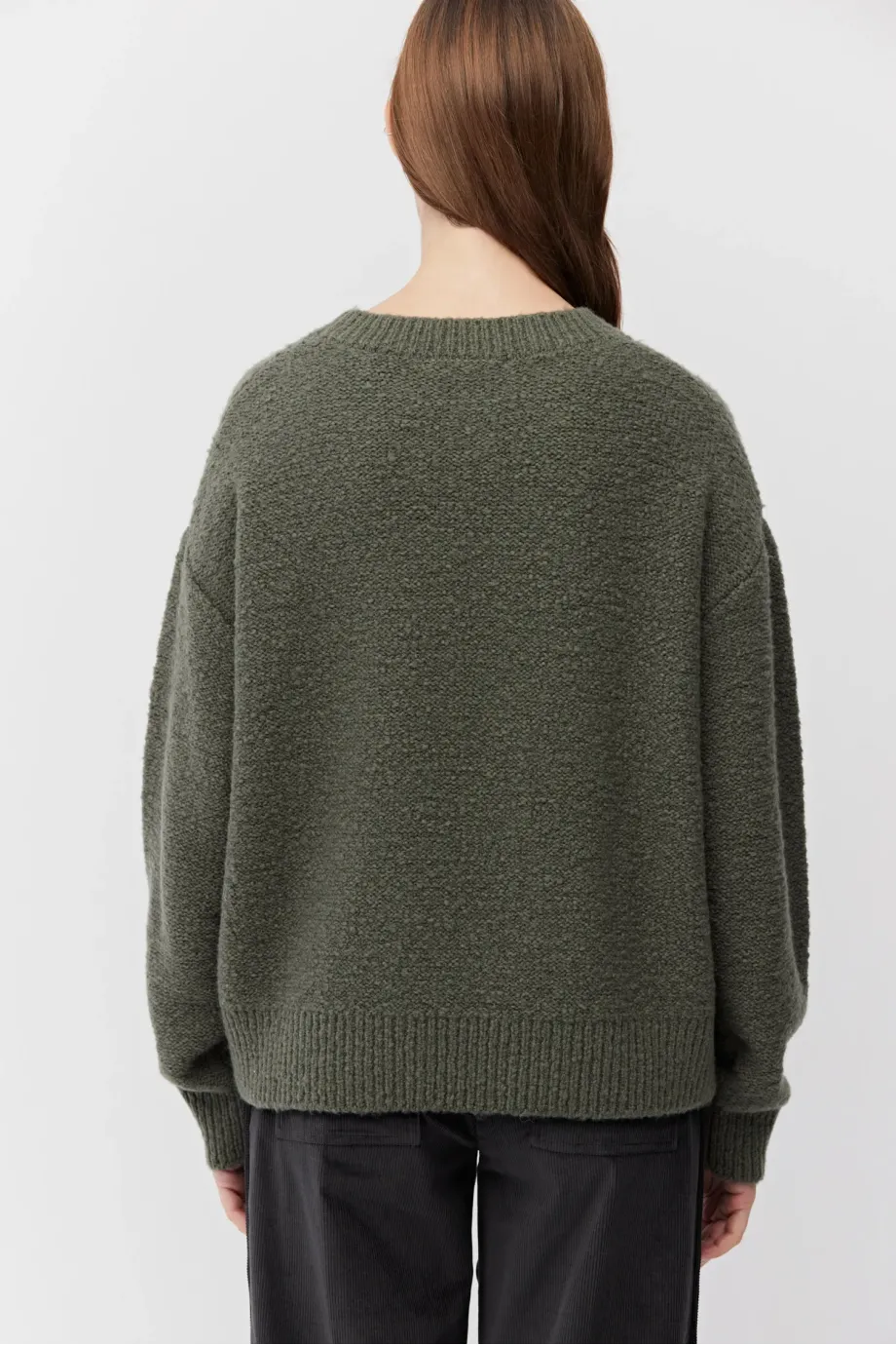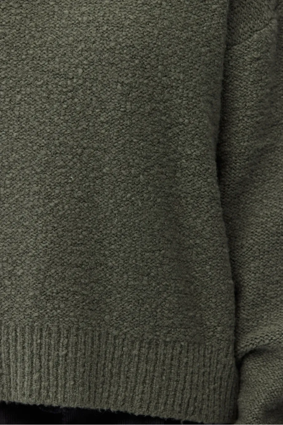 Pulover din lână merinos, culoarea verde. Decolteu rotund, mâneci lungi. Tricot moale, lejer, single-jersey, confecționat la mașină de calibru 7 GG. Croială lejeră.