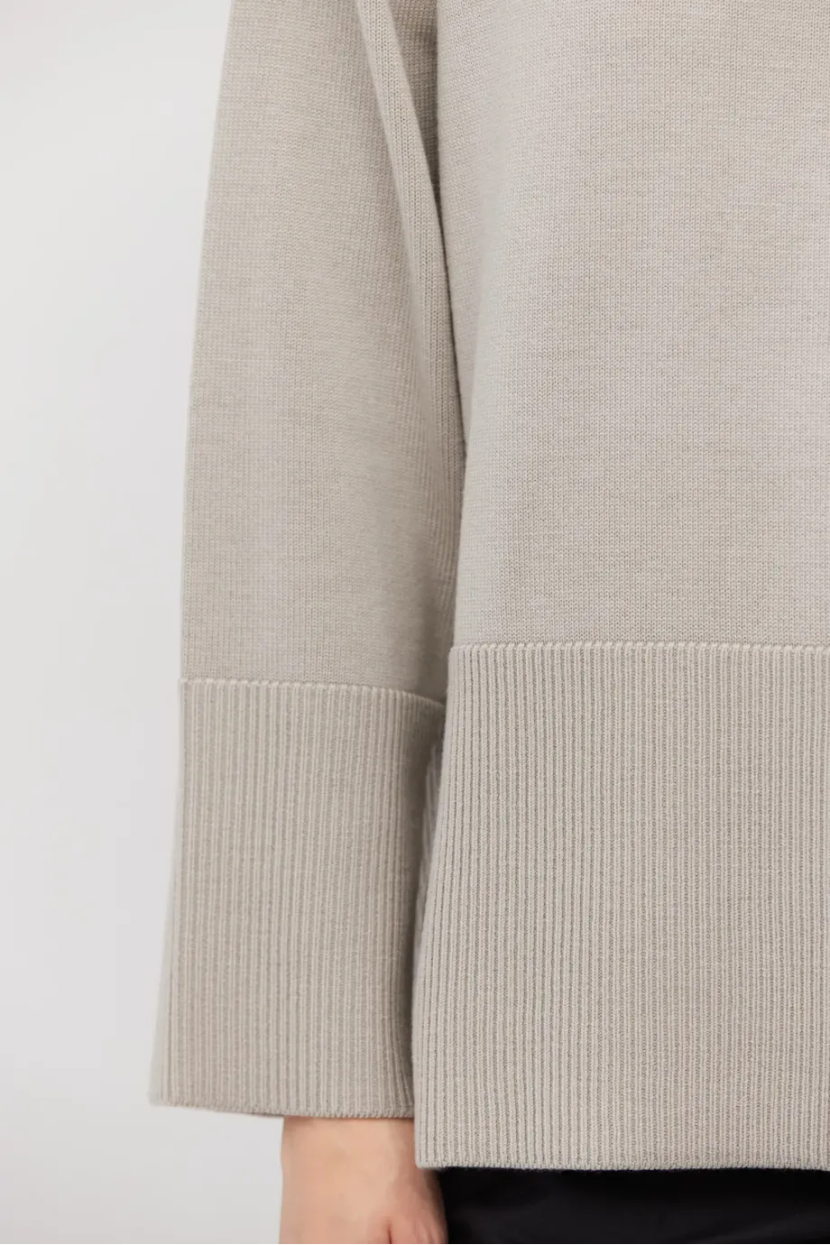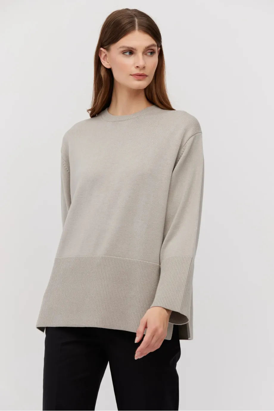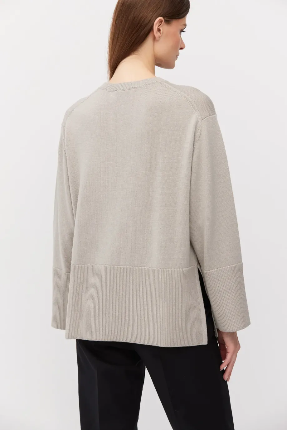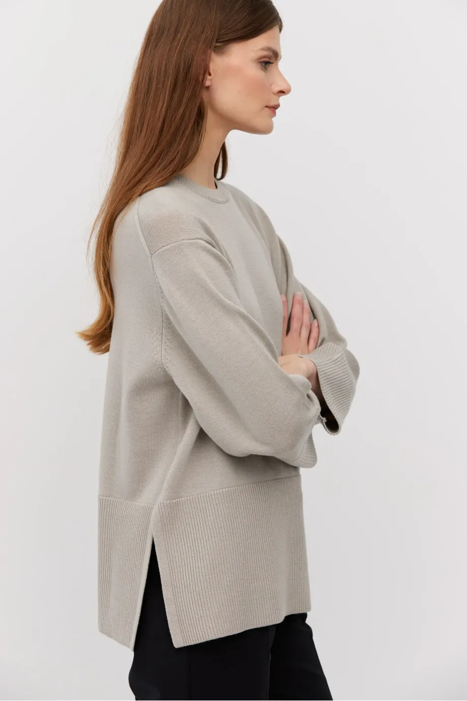 Pulover bej din lână merinos, cu croială lejeră. Mâneci lungi, decolteu rotund și crăpături laterale. Tricot moale, single-jersey, confecționat la mașină de calibru 9 GG.