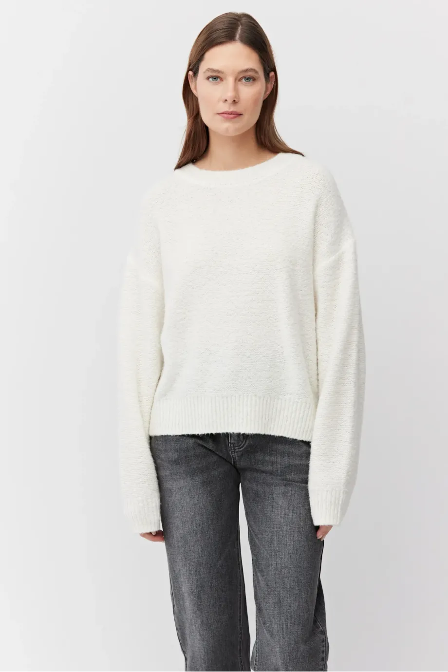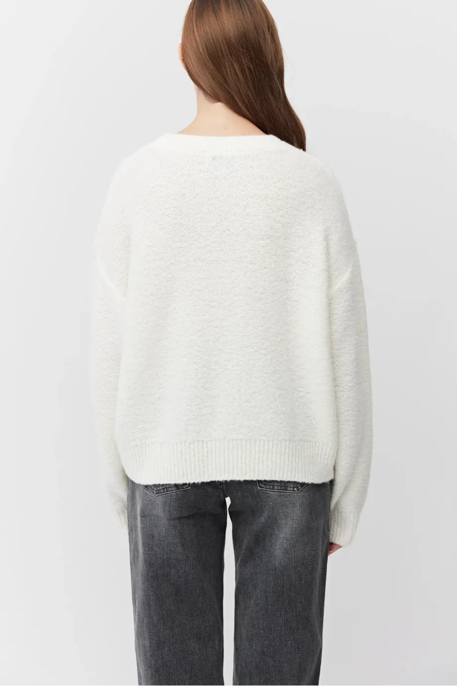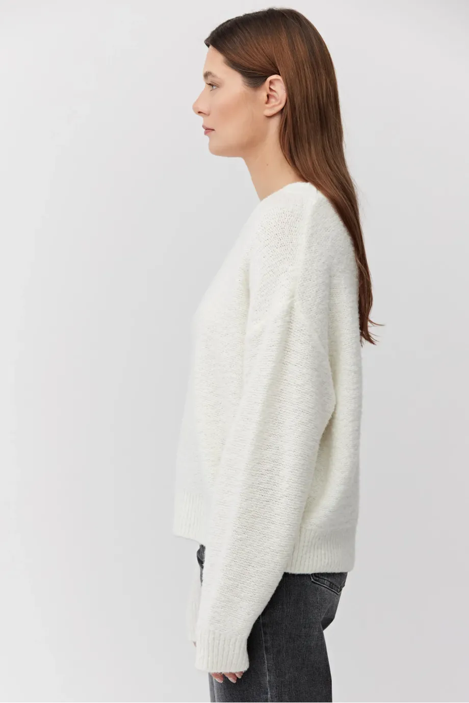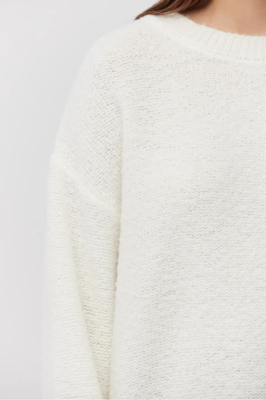 Pulover crem din lână merinos. Decolteu rotund, mâneci lungi. Tricot moale, lejer, single-jersey, confecționat la mașină de calibru 7 GG. Croială lejeră.