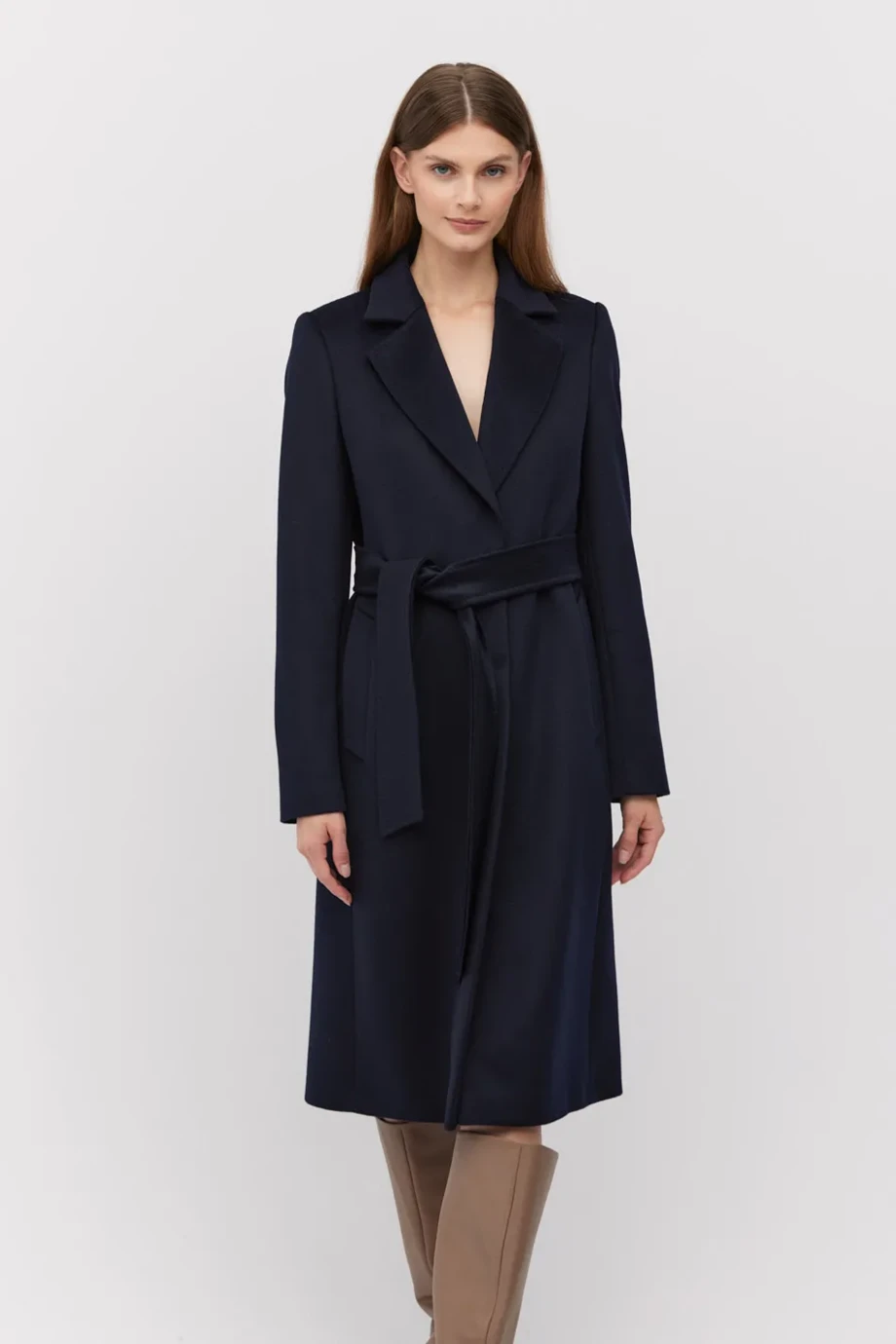 Pardesiu de culoarea albastru royal închis, din lână cu cordon. Croială apropiată de corp, căptușit cu paspoal decorativ. Mâneci montate și buzunare.
