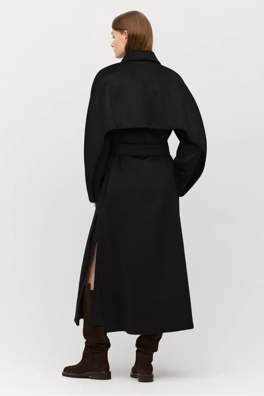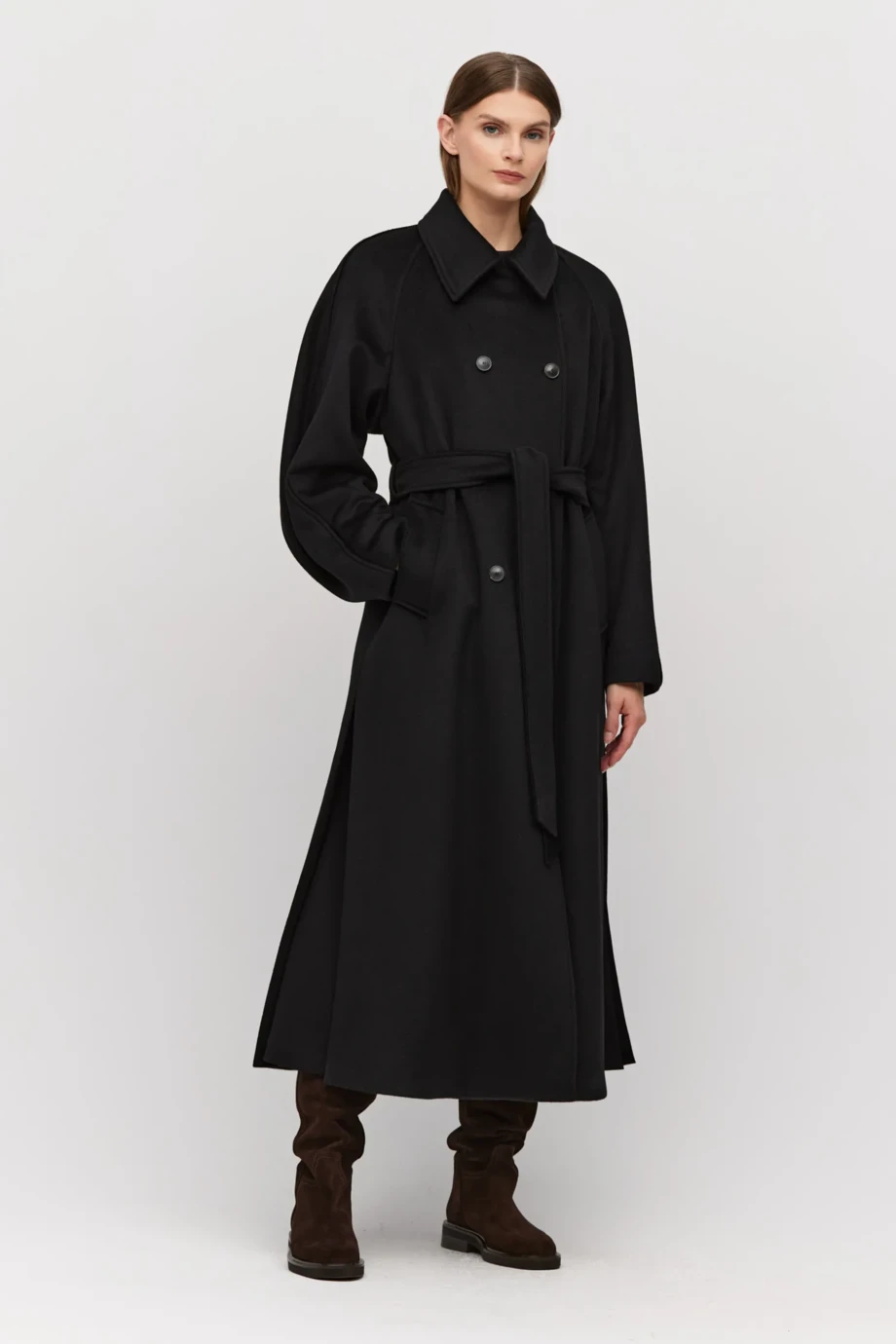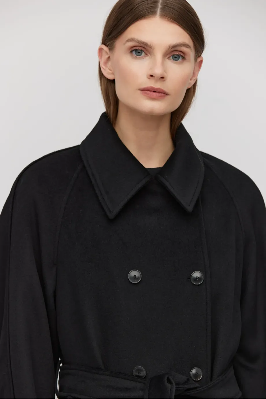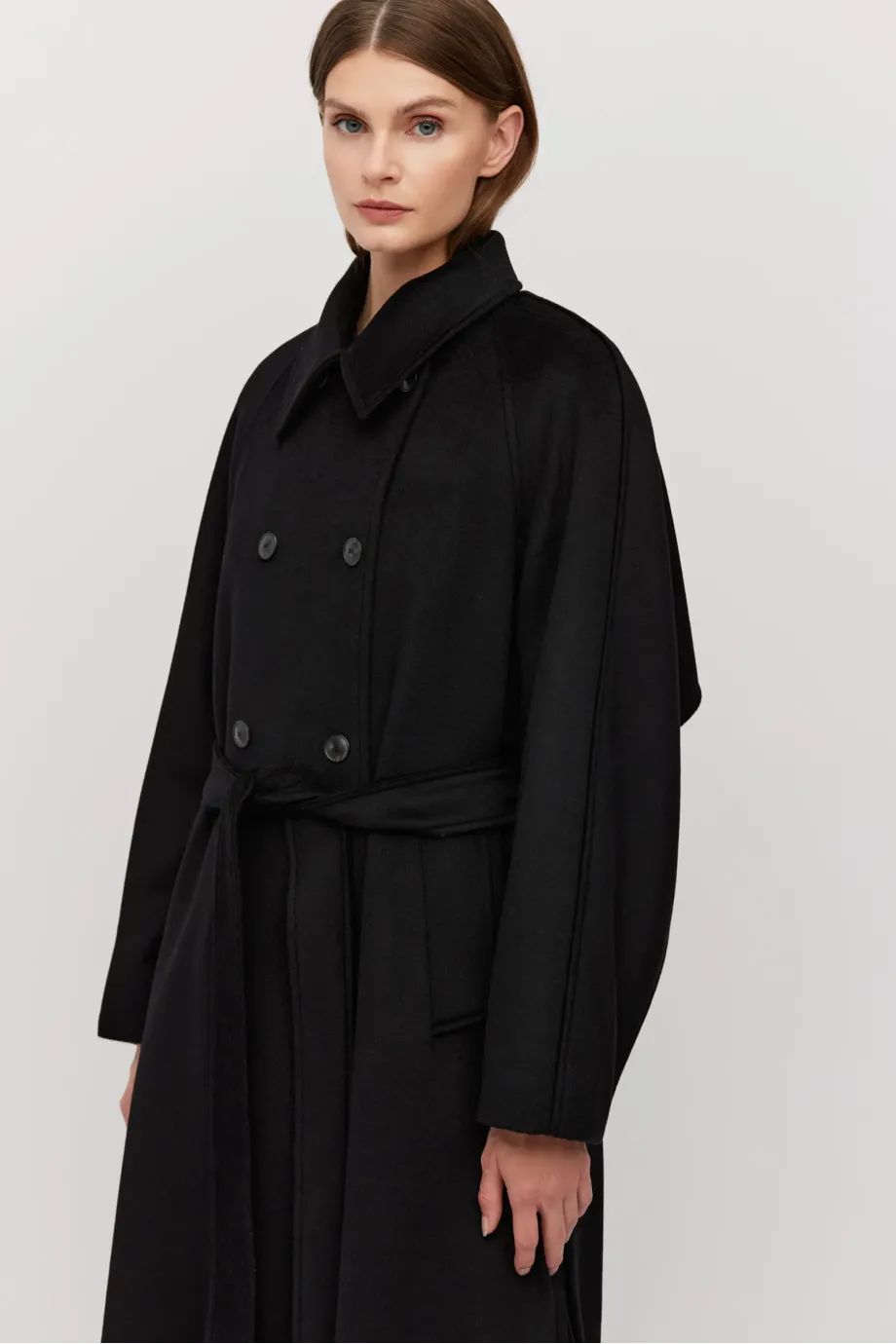 Palton negru, cu două rânduri de nasturi, din amestec de mătase și cașmir. Croială lejeră, cu cordon în talie, mâneci raglan și guler clasic. Nasturi din corn natural și nuc. Căptușit, cu paspoal decorativ.