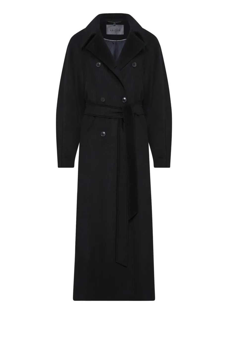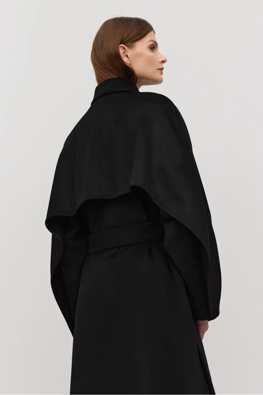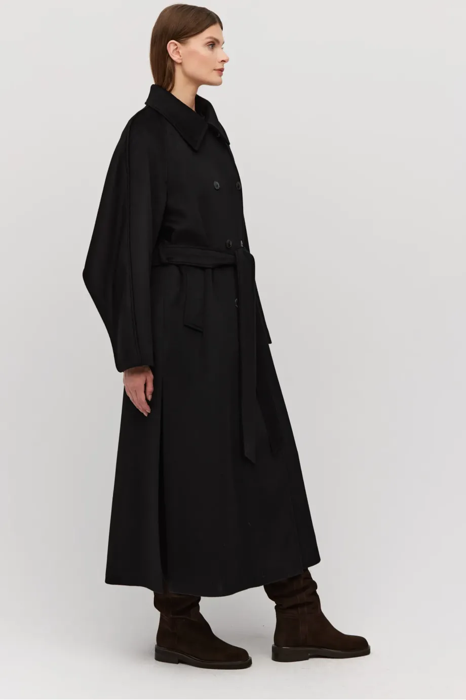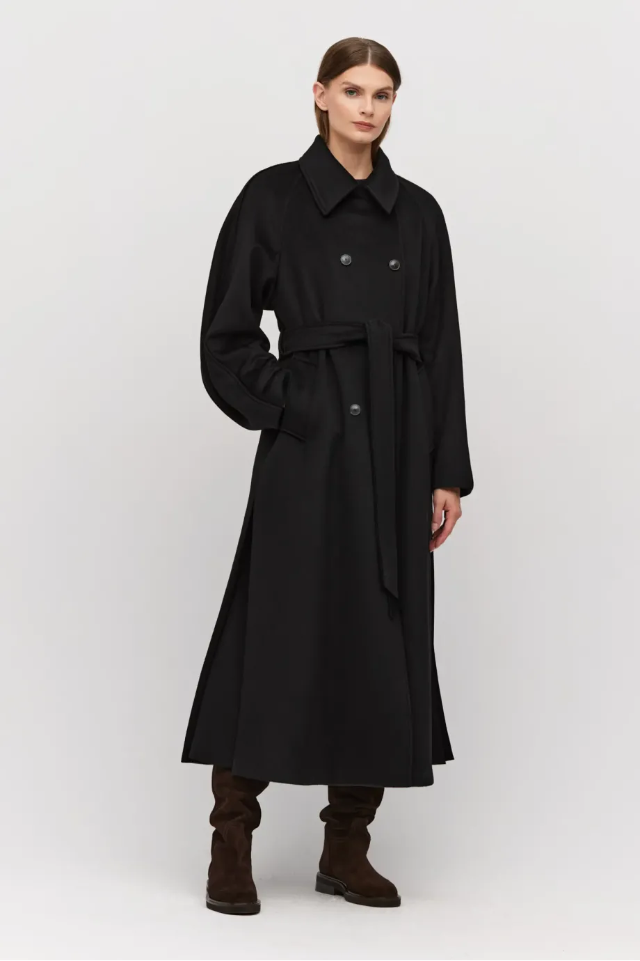 Palton negru, cu două rânduri de nasturi, din amestec de mătase și cașmir. Croială lejeră, cu cordon în talie, mâneci raglan și guler clasic. Nasturi din corn natural și nuc. Căptușit, cu paspoal decorativ.