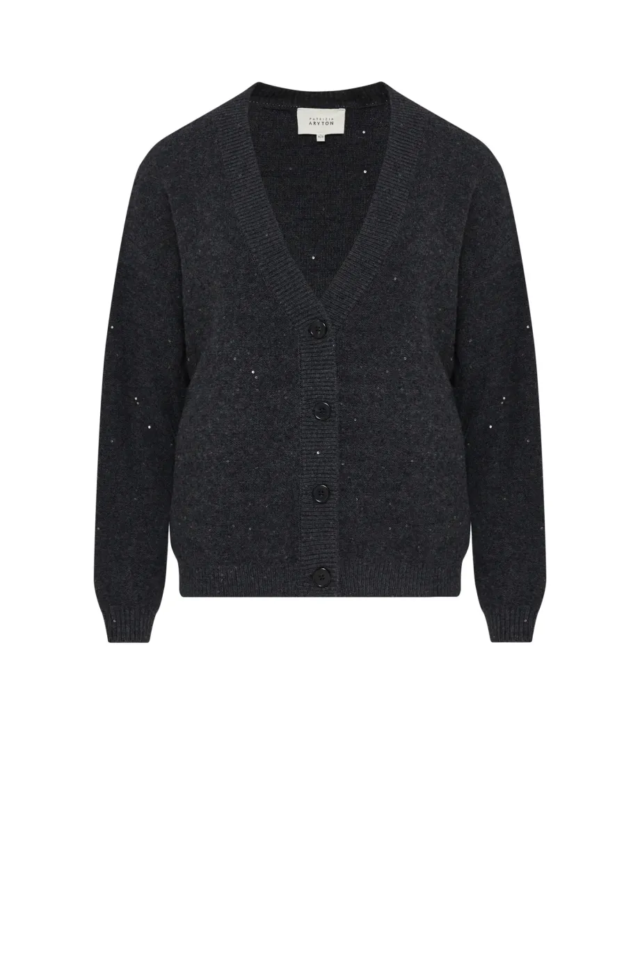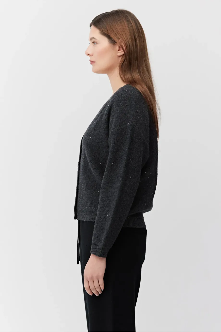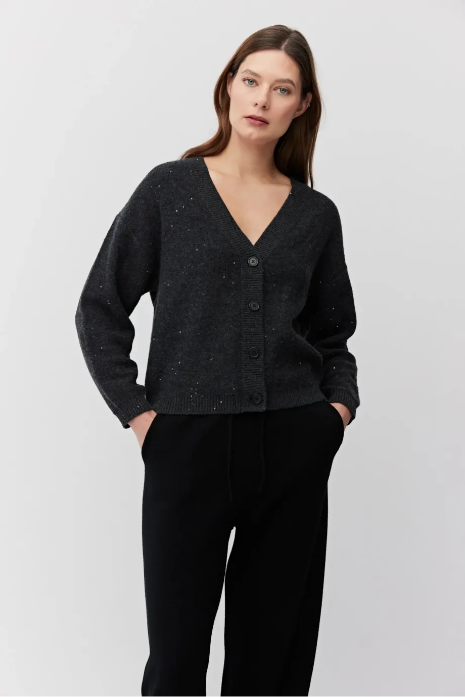 Cardigan din amestec de lână, închis cu nasturi naturali. Mâneci lungi, decolteu în V. Paiete argintii integrate lejer în material. Tricot moale, reverse-jersey, confecționat la mașină de calibru 7 GG. Culoare: gri închis.