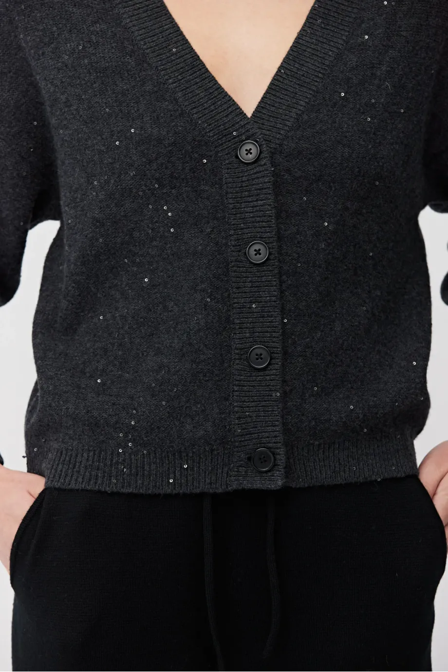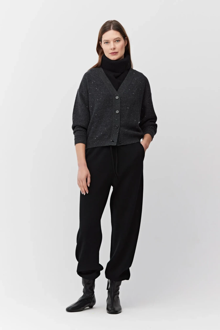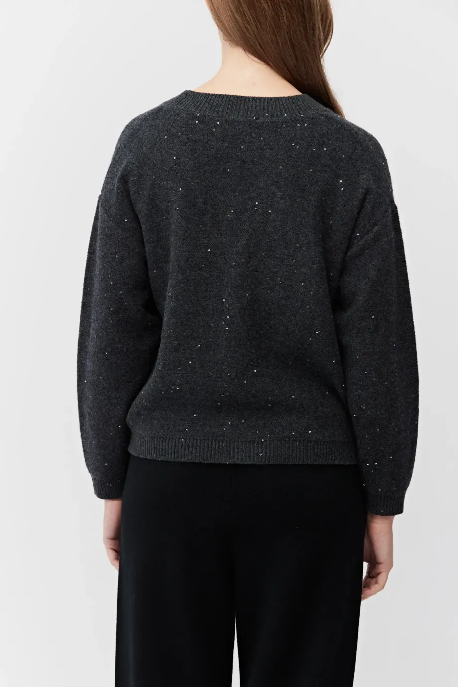 Cardigan din amestec de lână, închis cu nasturi naturali. Mâneci lungi, decolteu în V. Paiete argintii integrate lejer în material. Tricot moale, reverse-jersey, confecționat la mașină de calibru 7 GG. Culoare: gri închis.