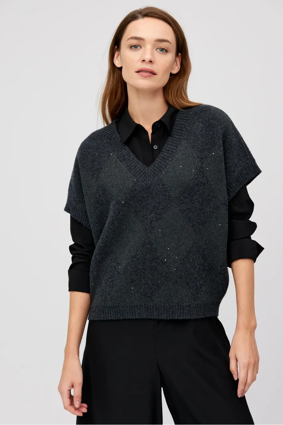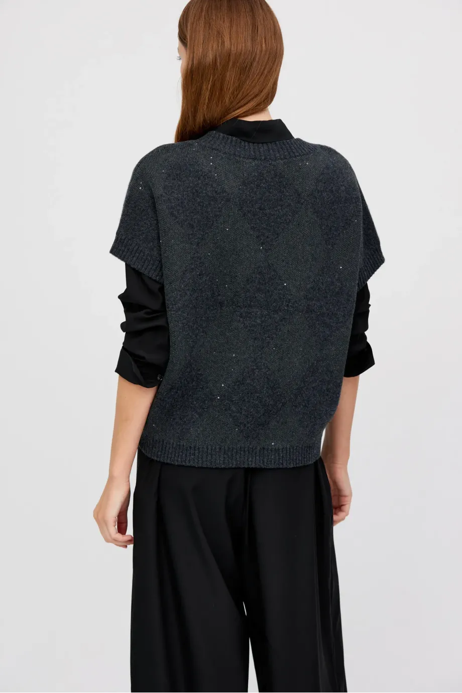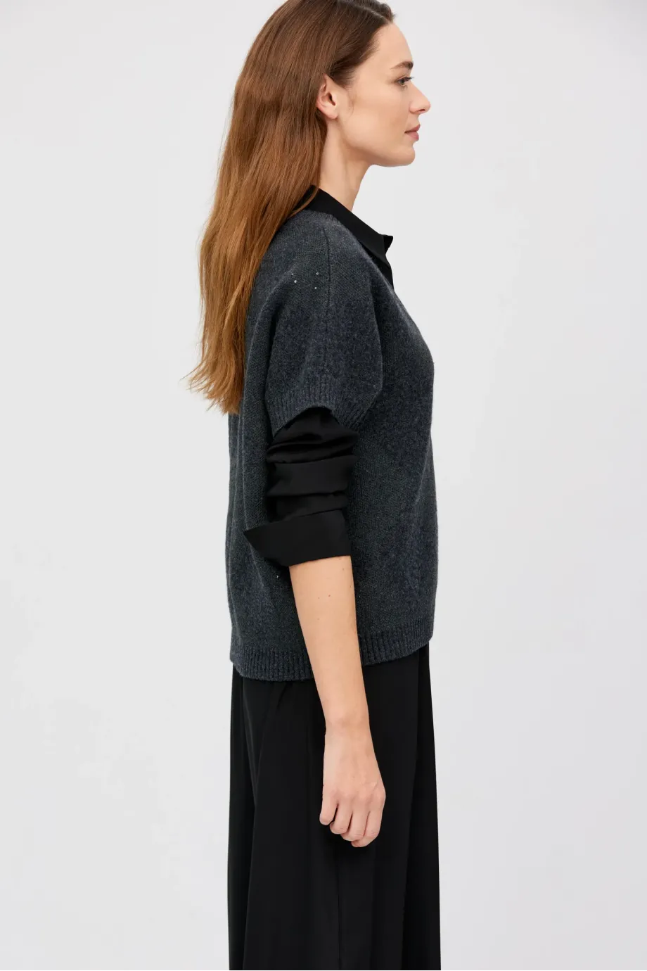 Pulover dintr-un amestec de bumbac și lână merinos. Mâneci scurte, decolteu în V. Formă simplă. Tricot moale cu țesătură jacquard realizat pe o mașină cu uiglenie de 7 GG. Culoare gri.