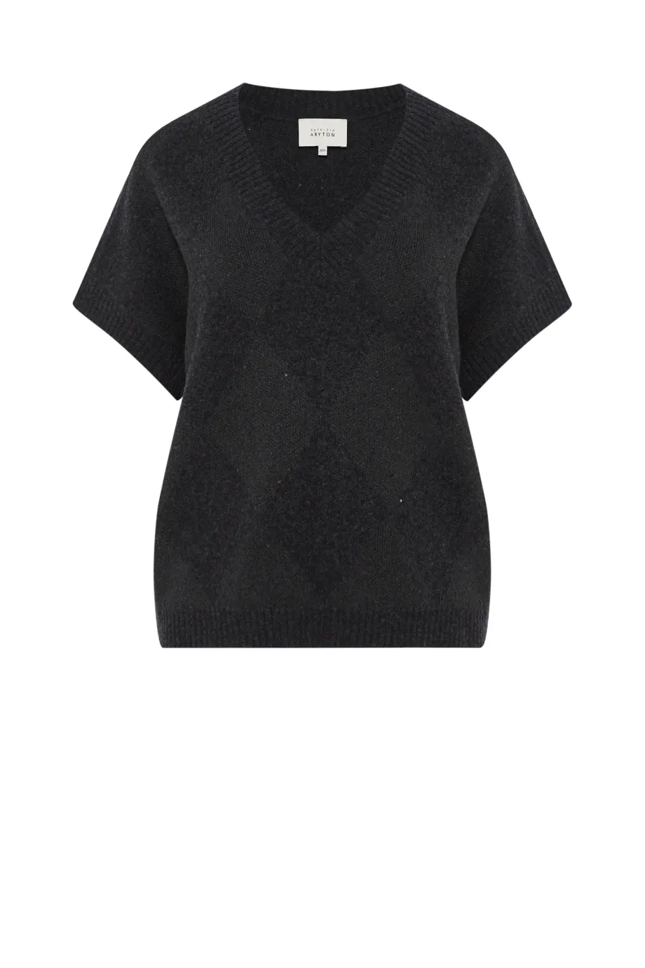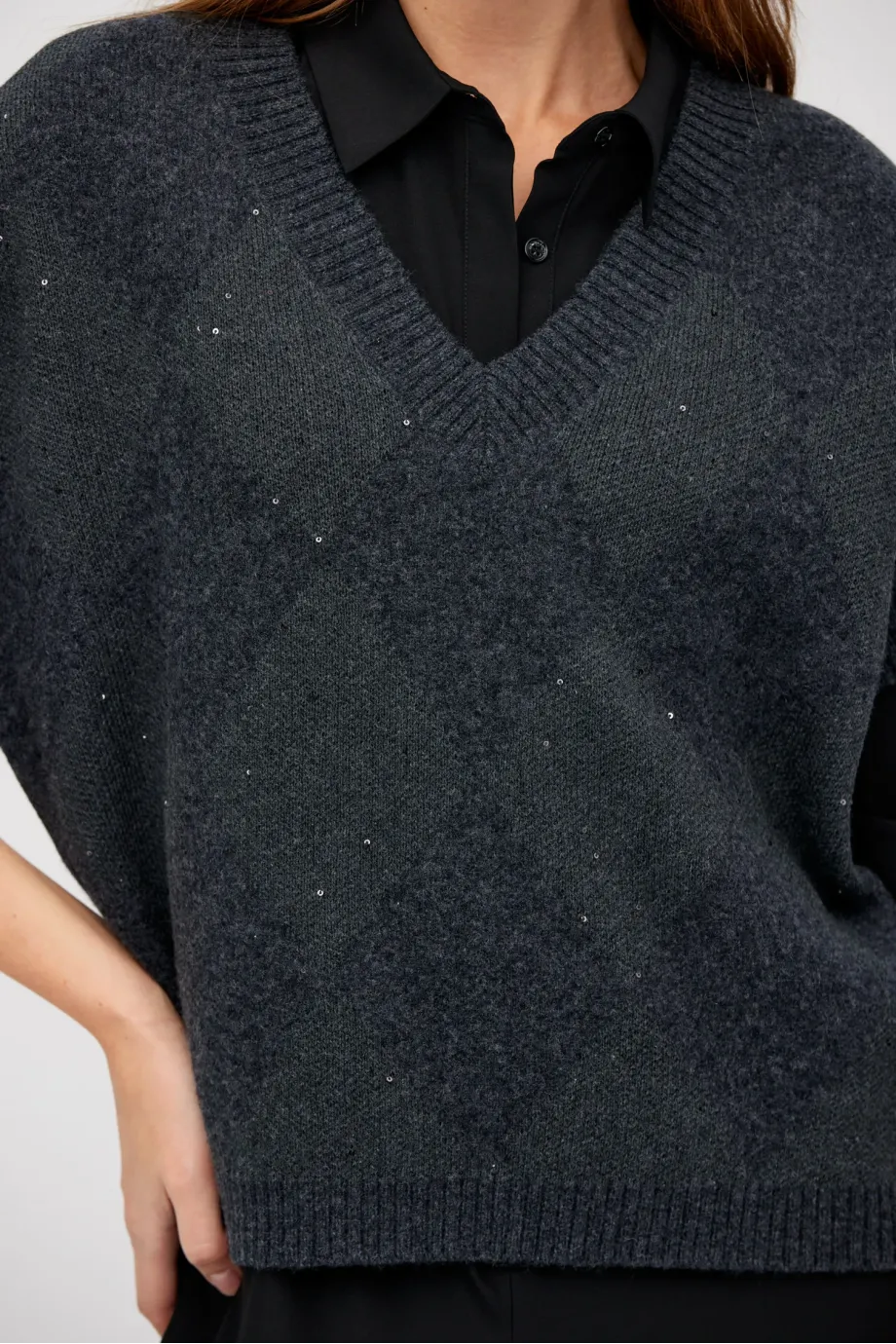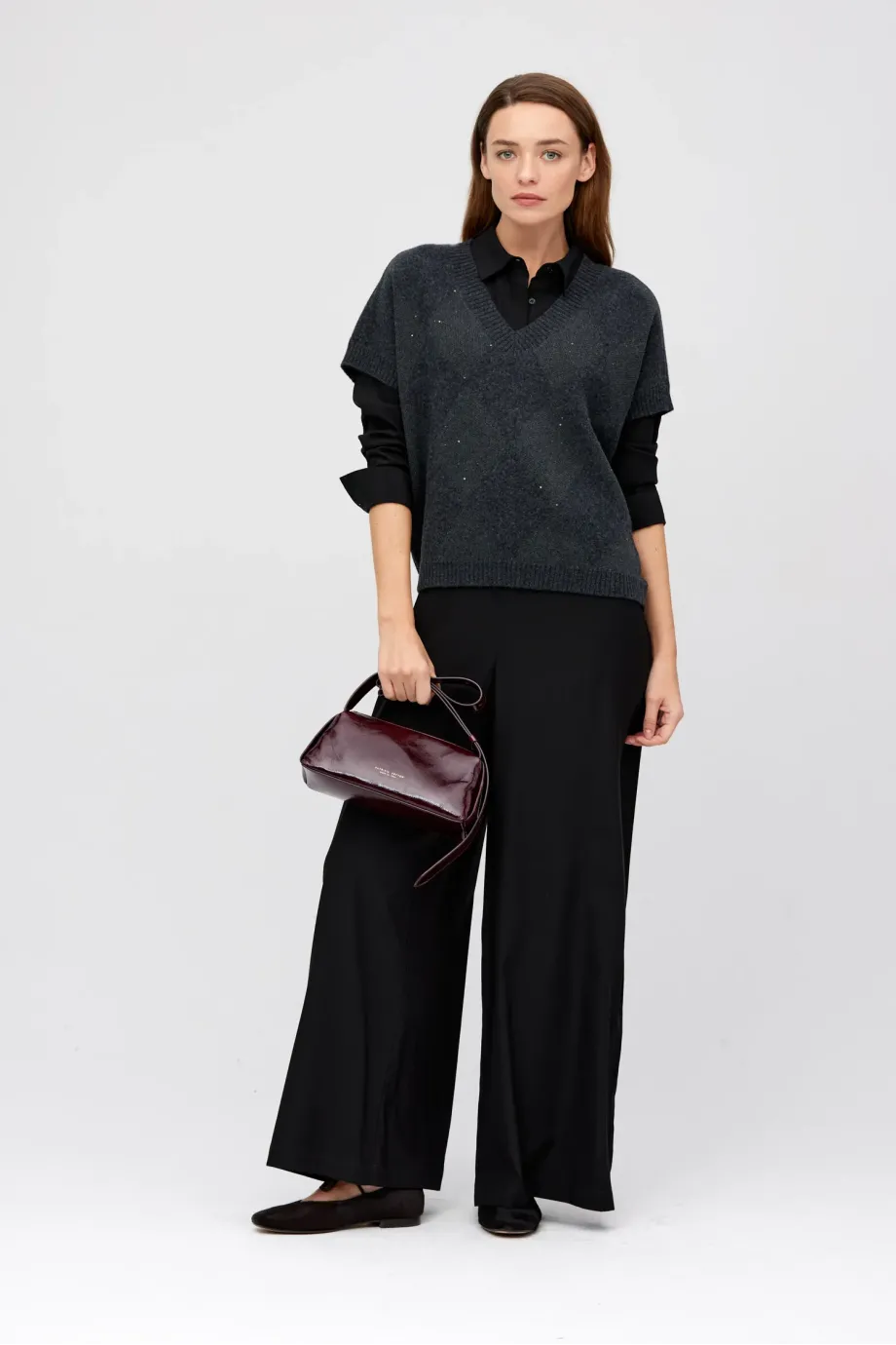 Pulover dintr-un amestec de bumbac și lână merinos. Mâneci scurte, decolteu în V. Formă simplă. Tricot moale cu țesătură jacquard realizat pe o mașină cu uiglenie de 7 GG. Culoare gri.