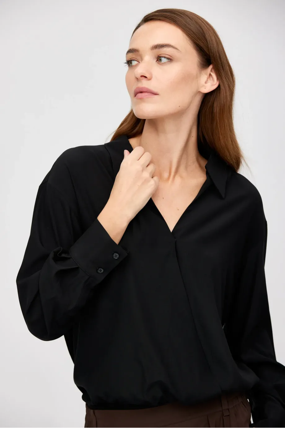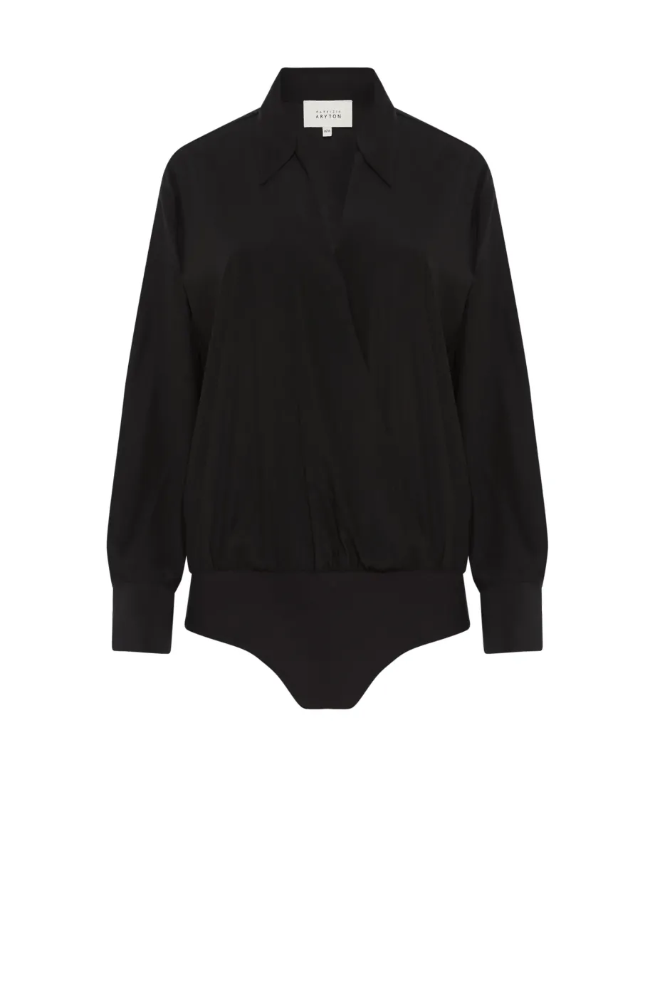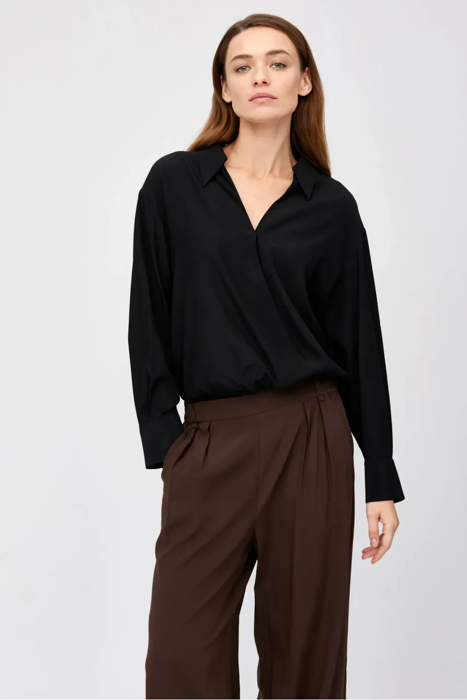 Body negre din mătase. Mâneci lungi cu manșetă, guler. Partea de sus lejeră, tip înfășurare.