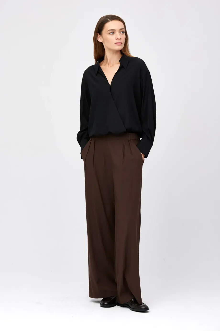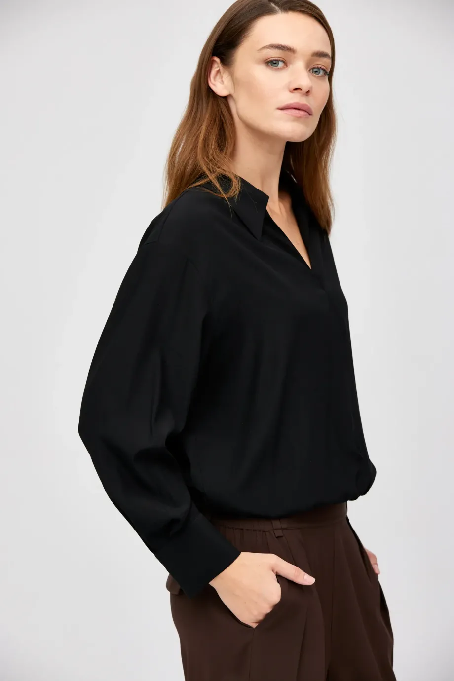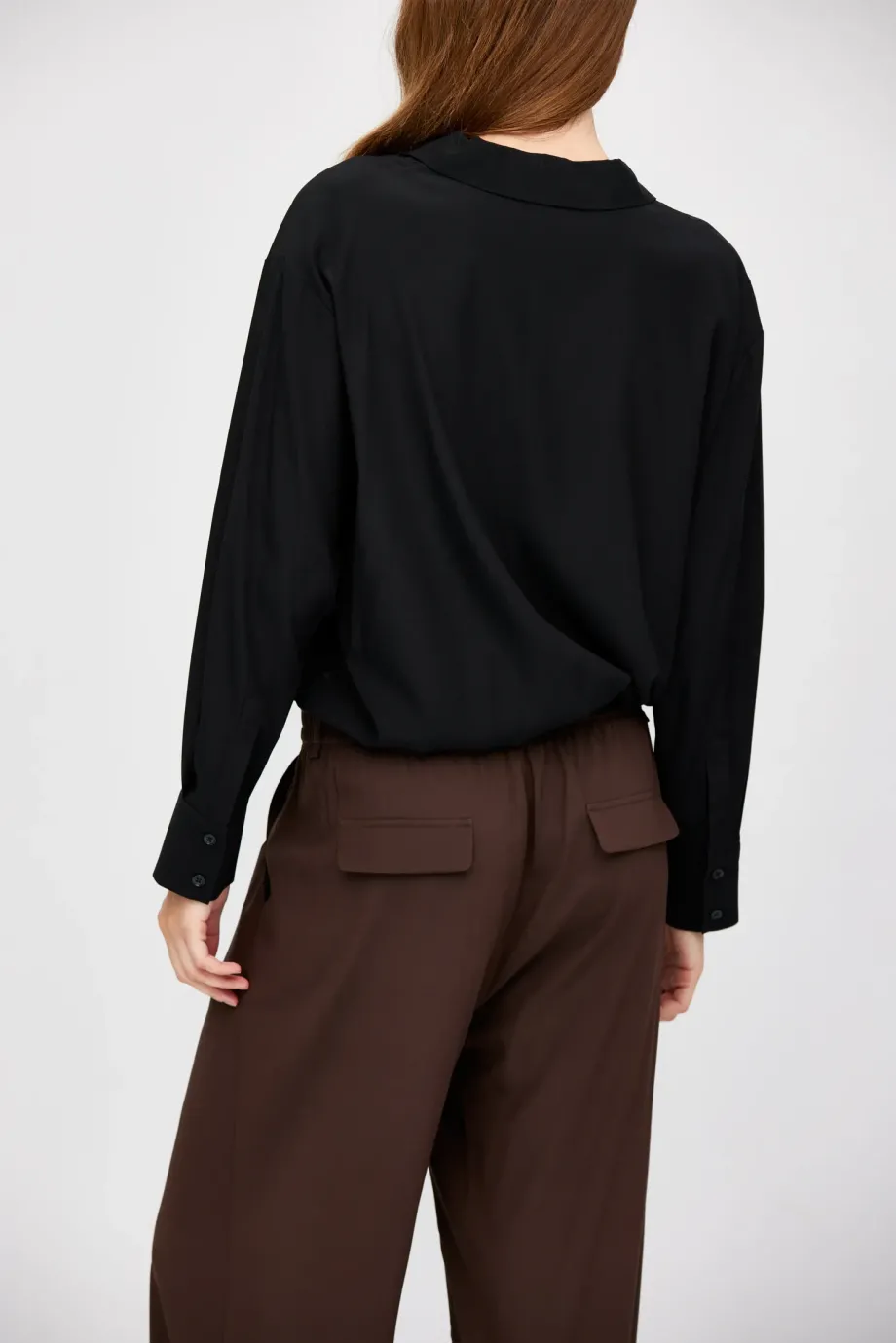 Body negre din mătase. Mâneci lungi cu manșetă, guler. Partea de sus lejeră, tip înfășurare.