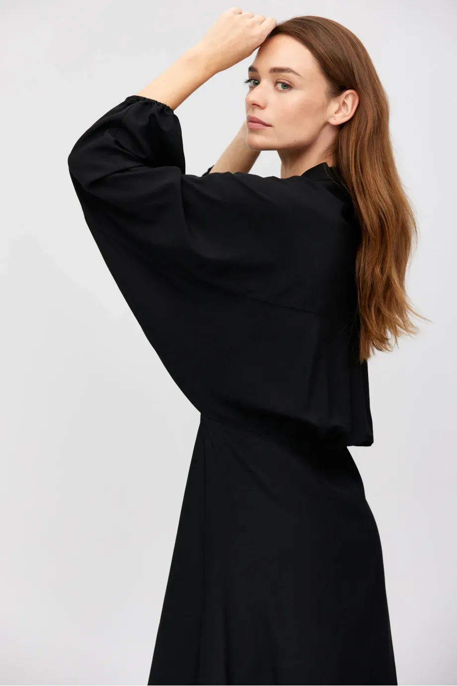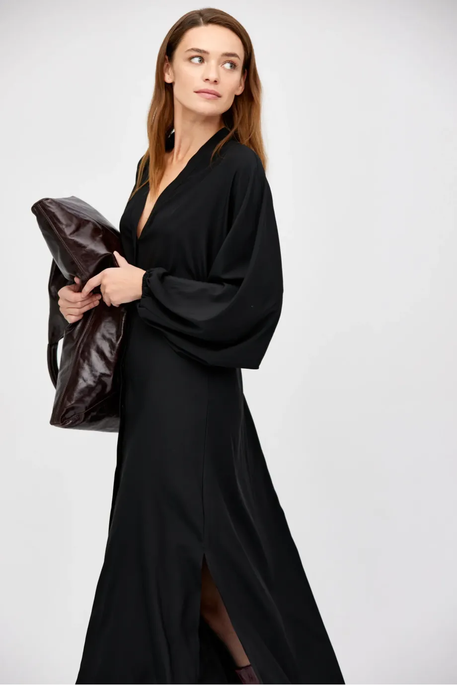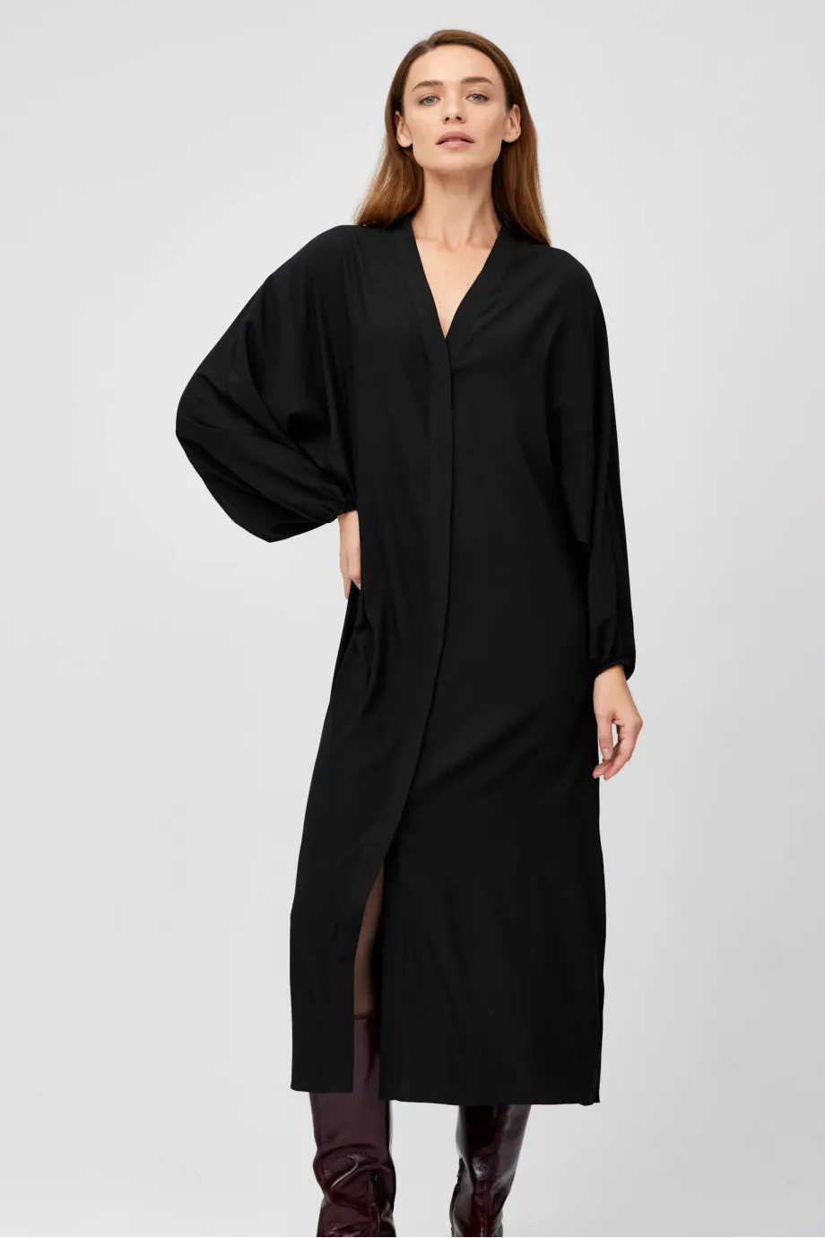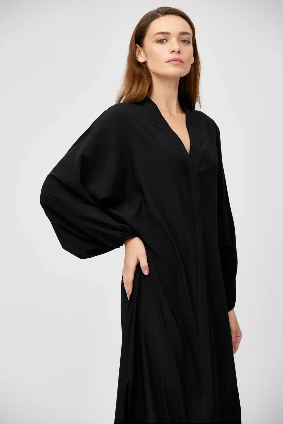 Rochie din mătase. Decolteu în V. Mâneci lungi, largi. Lungime midi. Culoare neagră.