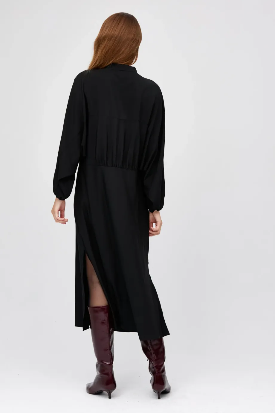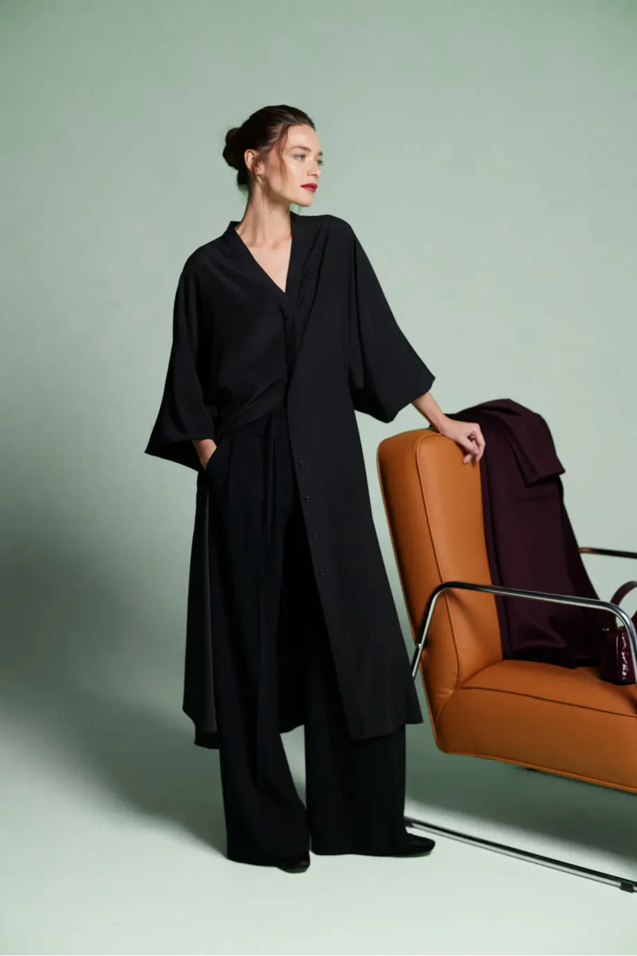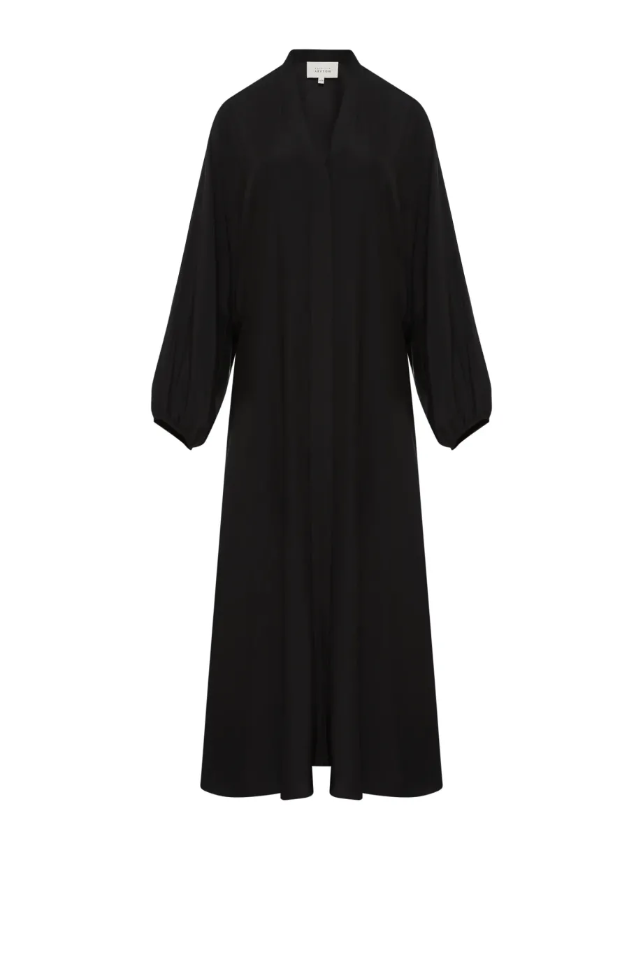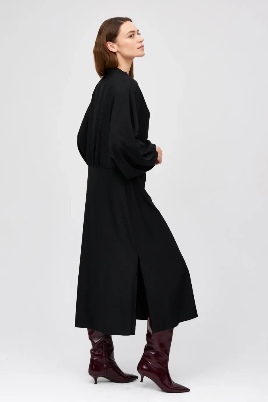 Rochie din mătase. Decolteu în V. Mâneci lungi, largi. Lungime midi. Culoare neagră.