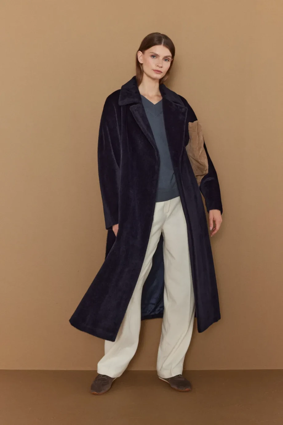 Palton de culoare albastru royal închis, lungime midi, din material moale cu adaos de alpaca baby Suri. Cordon în talie, mâneci și guler kimono. Complet căptușit, cu cusături decorative, paspoal și bordură interioară. Închidere cu nasture corozo la interior și nasture din corn natural la exterior.