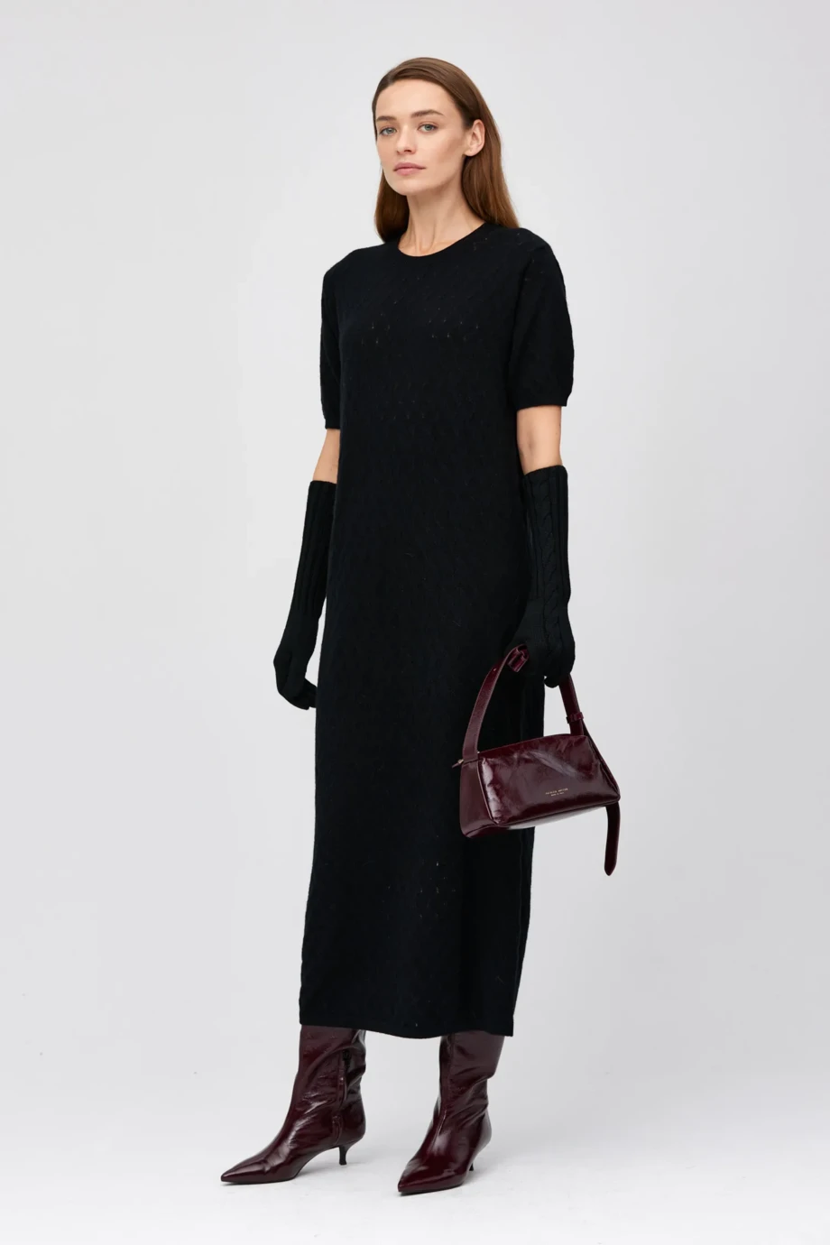 Rochie din lână merinos și amestec de lână de alpaca. Decolteu rotund, mânecă scurtă, croială simplă. Lungime midi. Culoare neagră.