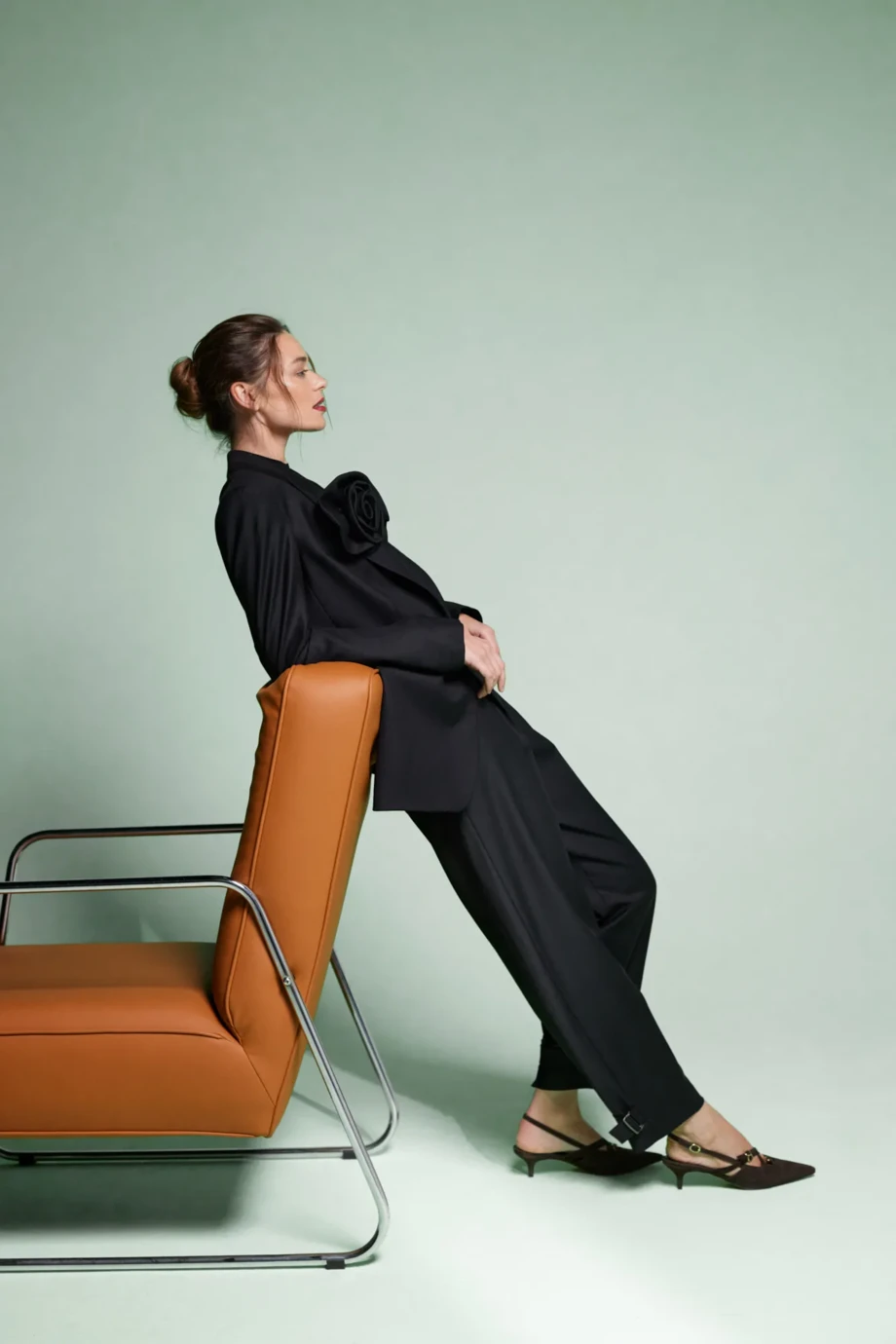 Sacou pentru costum din lână de miel. Se închide cu un nasture, ușor ajustat, cu linia umerilor evidențiată. Mâneca lungă. Model căptușit, cu piping decorativ. Culoare neagră. În set cu floare detașabilă. Pentru completarea stilizării, pantaloni din aceeași țesătură.