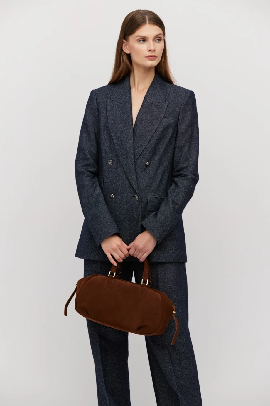 Sacou de culoarea albastru royal închis, complet căptușit, cu croială ușor cambrată. Închidere cu două rânduri de nasturi, guler din fetru și broderie pe dedesubt, finisat cu paspoal decorativ. Din amestec de lână de miel, in și cașmir.