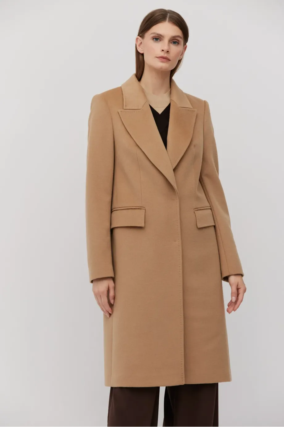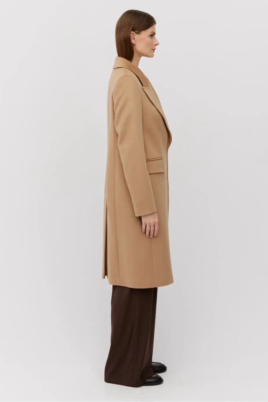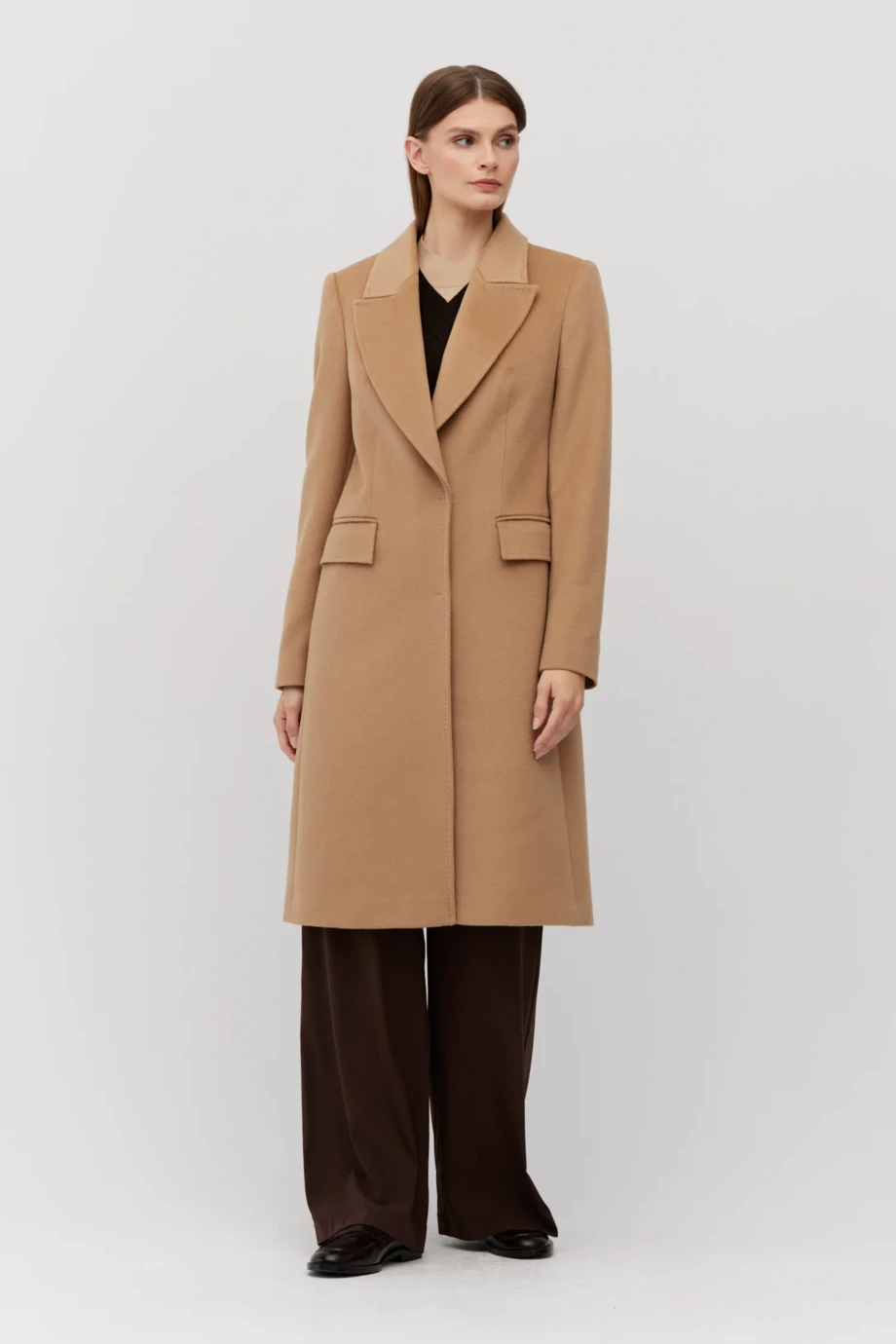 Pardesiu de culoarea camel, model diplomat, căptușit. Croială cambrată, lungime midi, cu guler mare, un singur nasture, buzunare și mâneci montate. Interior cu paspoal decorativ.