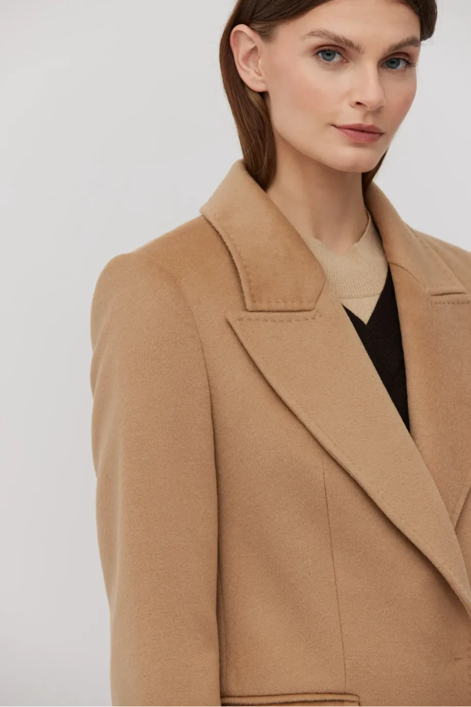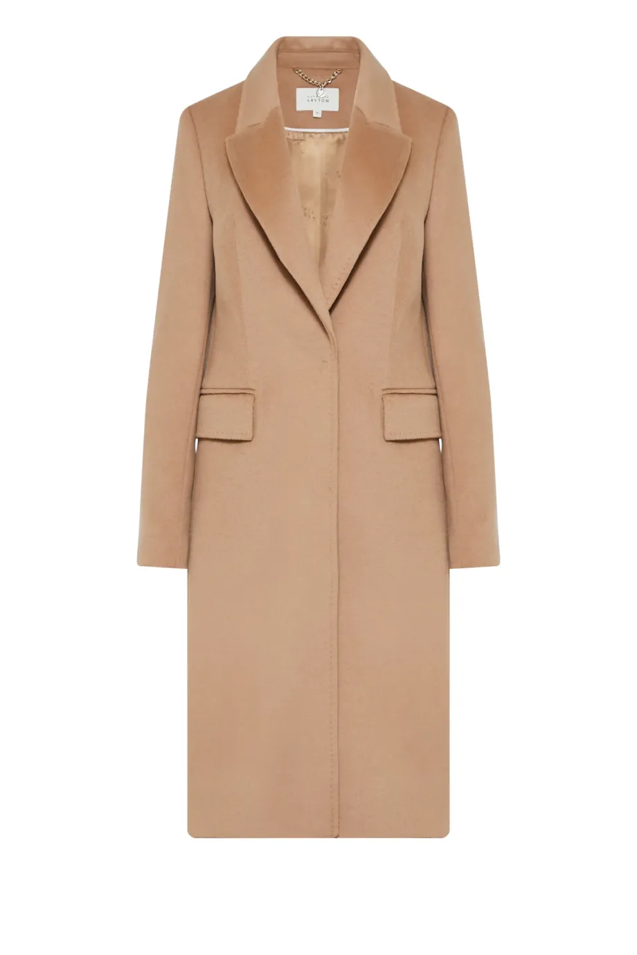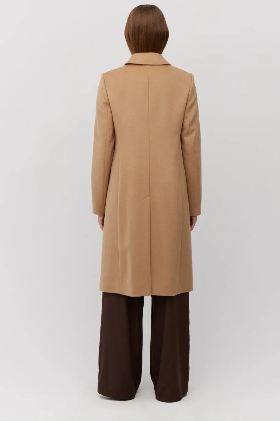 Pardesiu de culoarea camel, model diplomat, căptușit. Croială cambrată, lungime midi, cu guler mare, un singur nasture, buzunare și mâneci montate. Interior cu paspoal decorativ.