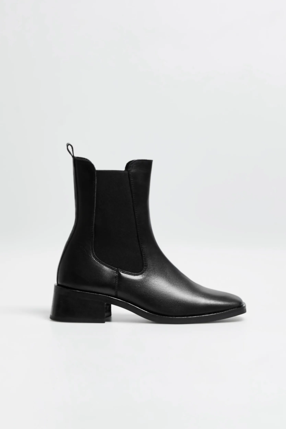 Ghete de culoarea neagră, până la gleznă, cu vârf pătrat. Partea superioară înaltă din piele naturală, toc jos și bandă elastică pe laterale. Confecționate manual într-un atelier portughez.