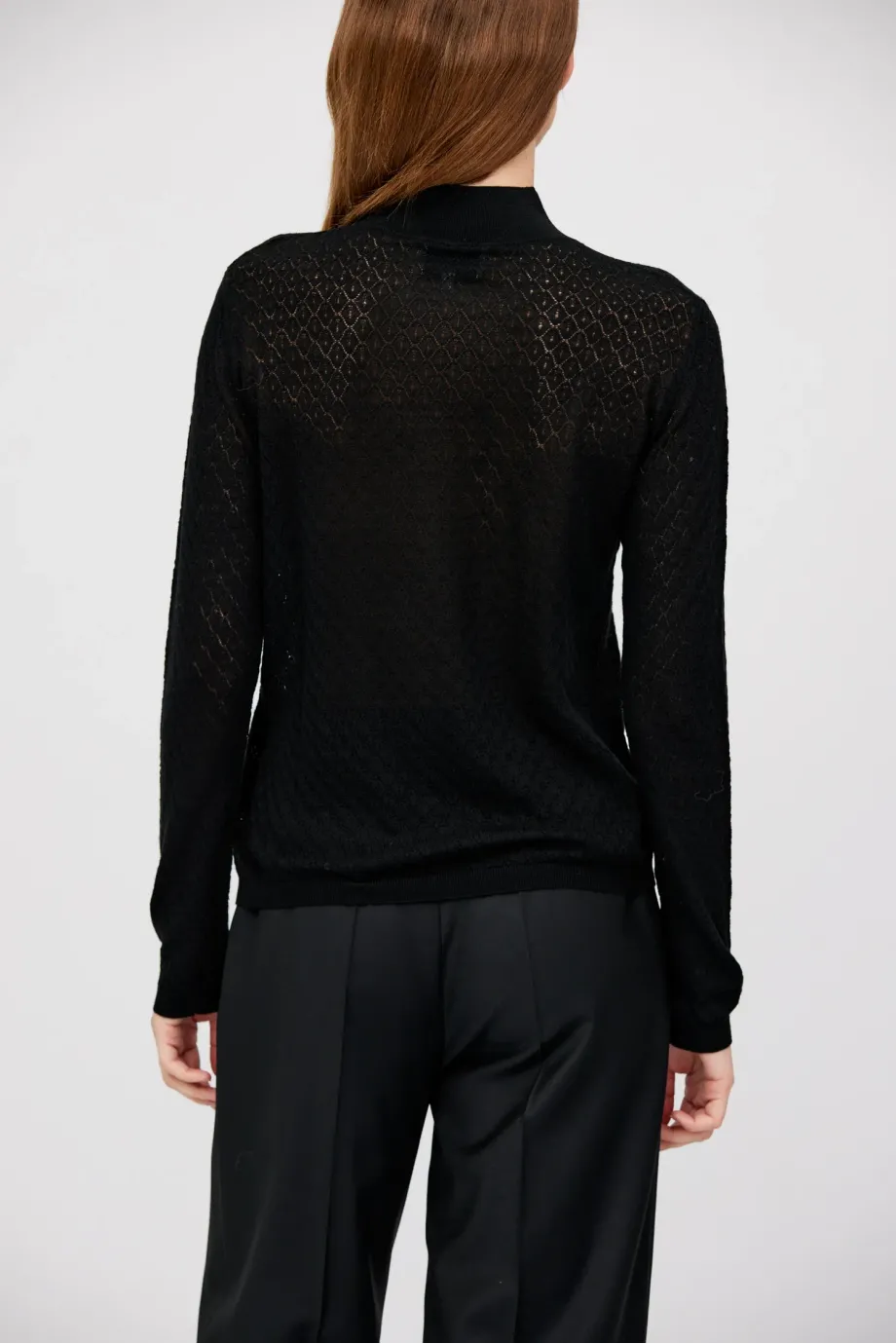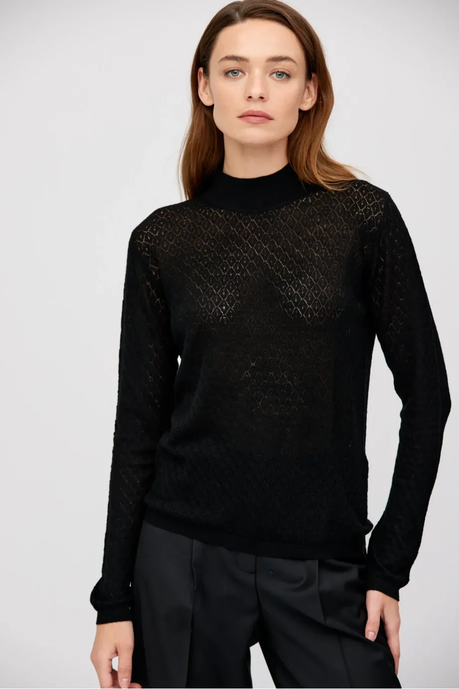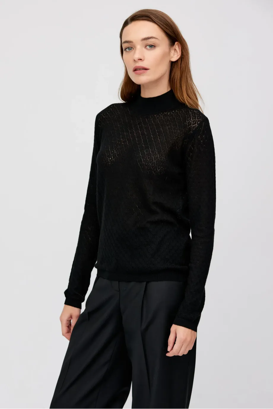 Pulover cu guler înalt din lână merinos. Croială mai apropiată de corp. Material moale, tricotat cu un model fin pointelle, realizat pe o mașină cu o densitate de 18 GG. Culoare neagră.