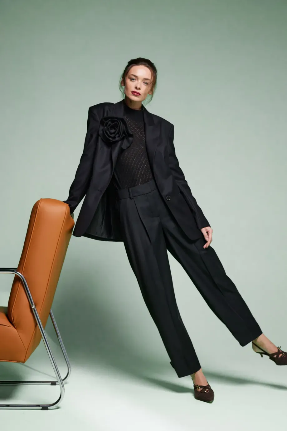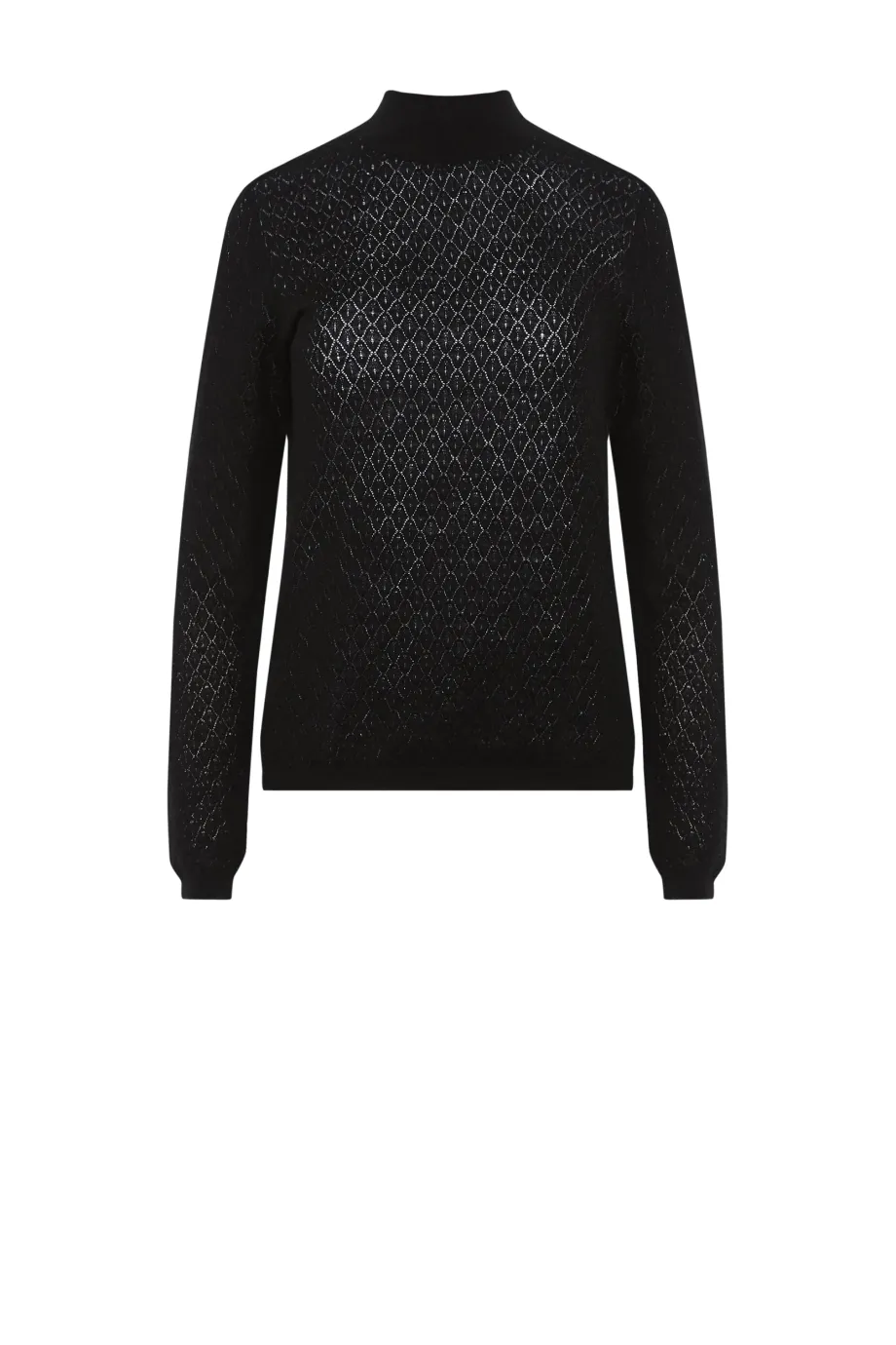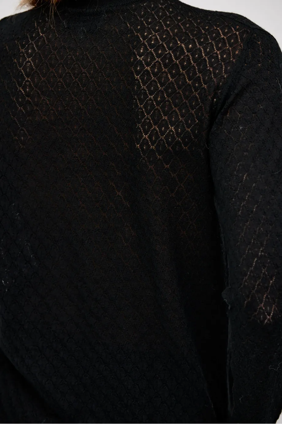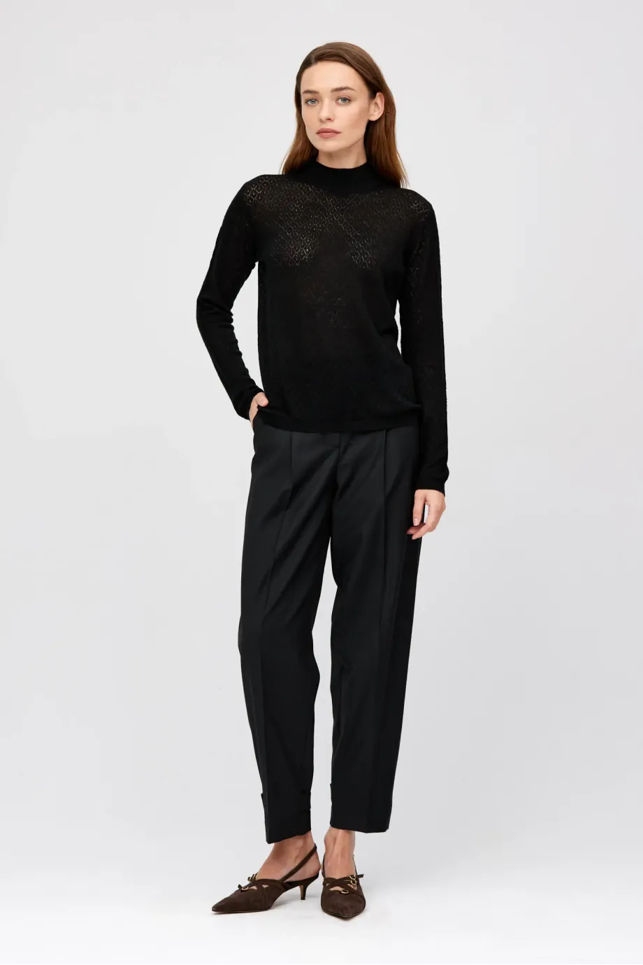 Pulover cu guler înalt din lână merinos. Croială mai apropiată de corp. Material moale, tricotat cu un model fin pointelle, realizat pe o mașină cu o densitate de 18 GG. Culoare neagră.