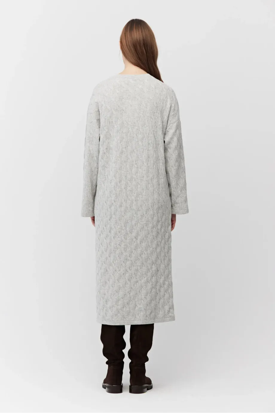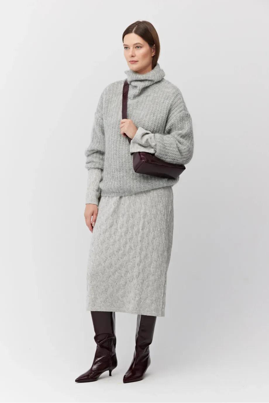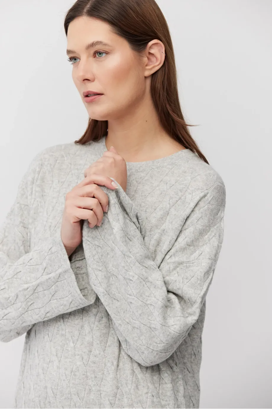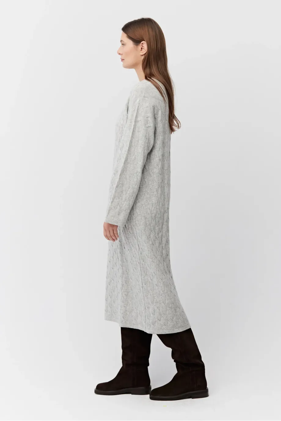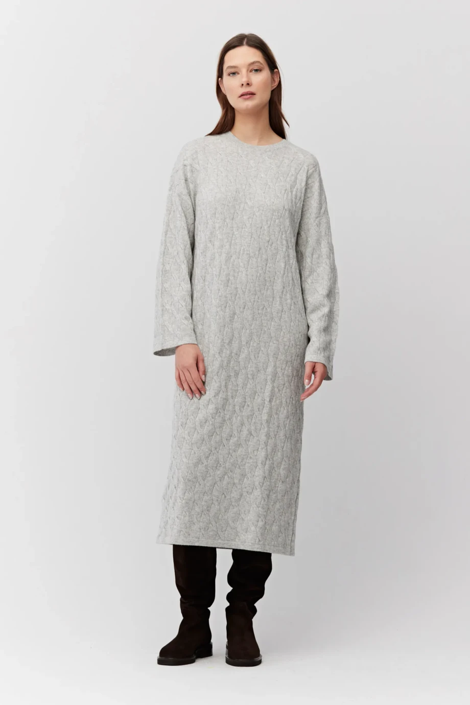 Rochie de culoarea gri, din lână merinos și cașmir. Mâneci lungi, decolteu rotund, lungime midi. Tricot moale, cable-knit fin, confecționat la mașină de calibru 12 GG.