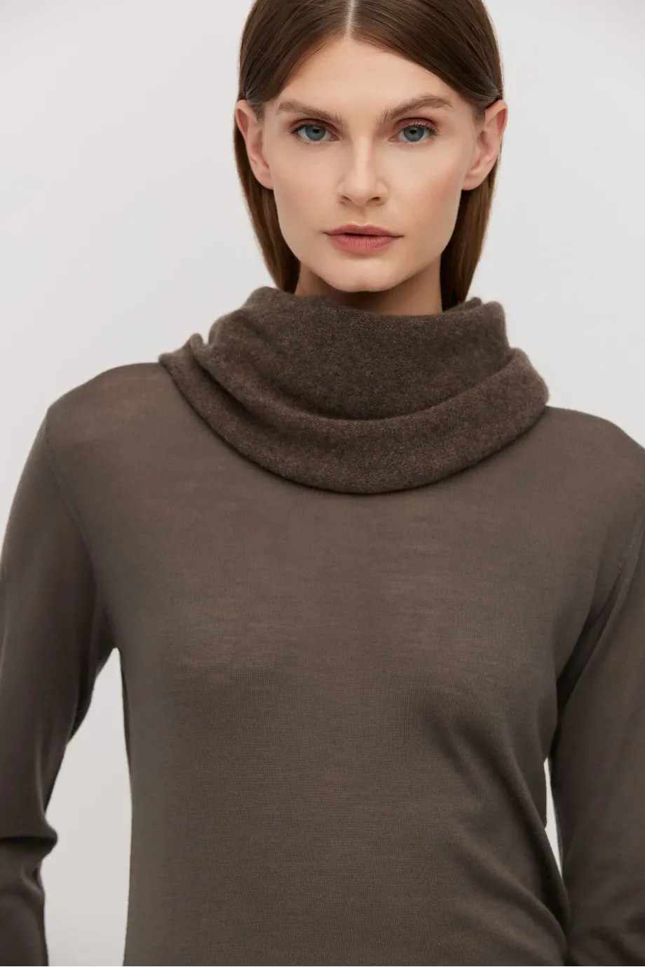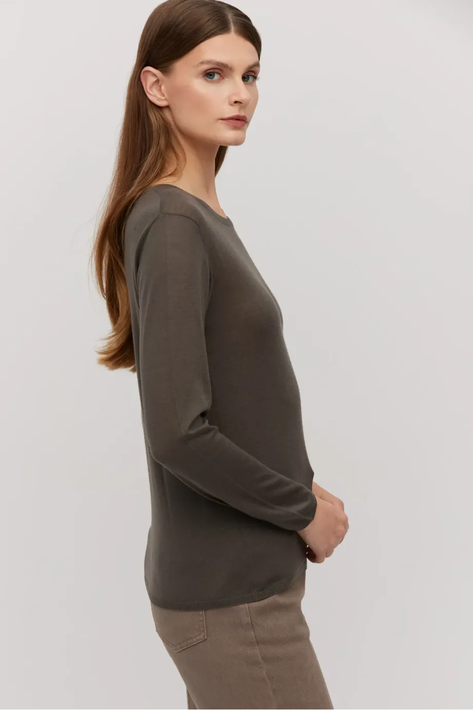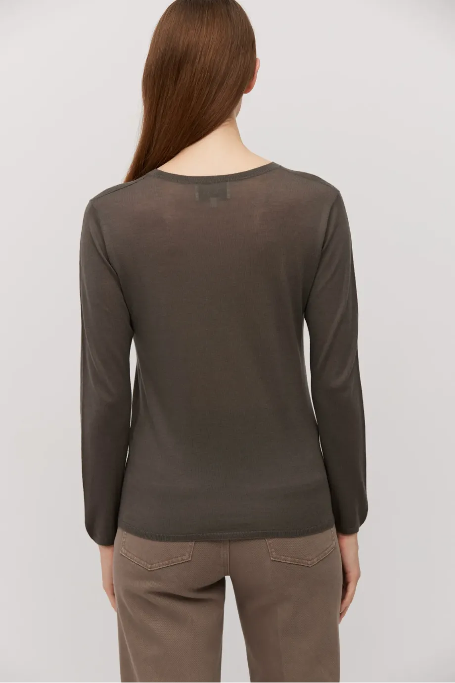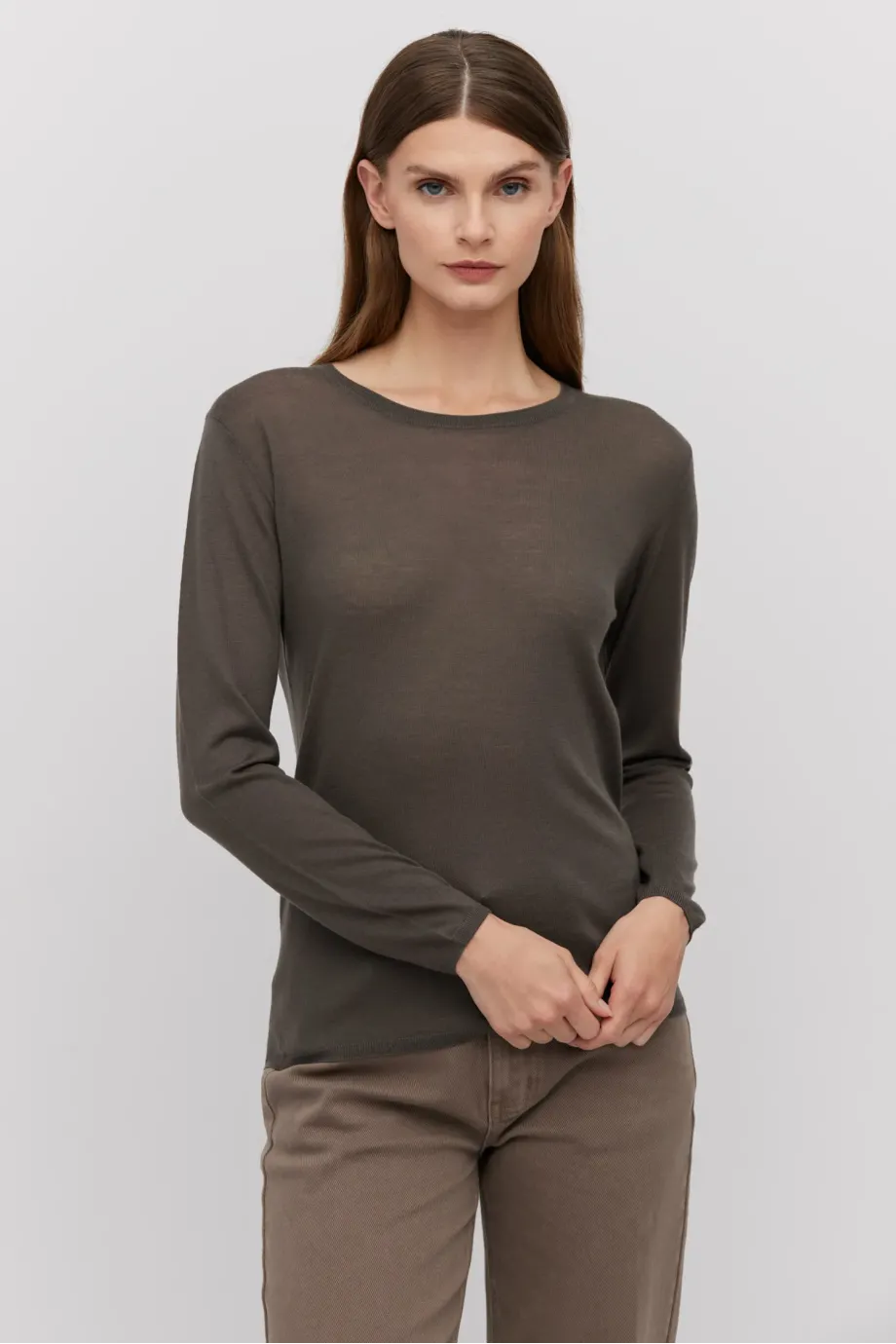 Bluză de culoarea maro, din lână merinos. Decolteu rotund, mâneci lungi, croială mulată. Tricot single-jersey foarte fin, confecționat la mașină de calibru 18 GG.