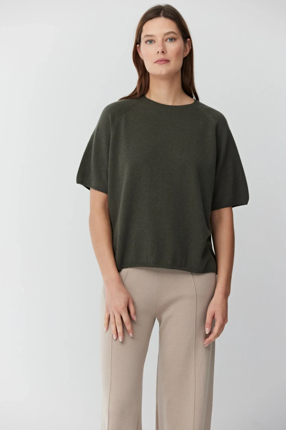 Tricou de culoarea verde măsliniu, din lână merinos și cașmir. Croială simplă, lejeră, mâneci scurte. Tricot jersey, confecționat la mașină de calibru 14 GG.