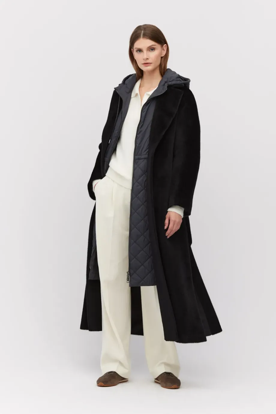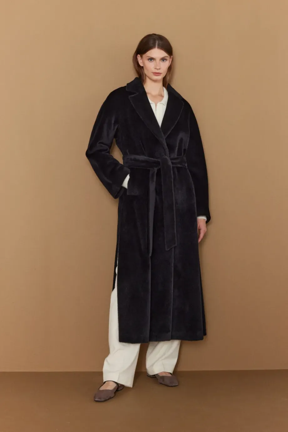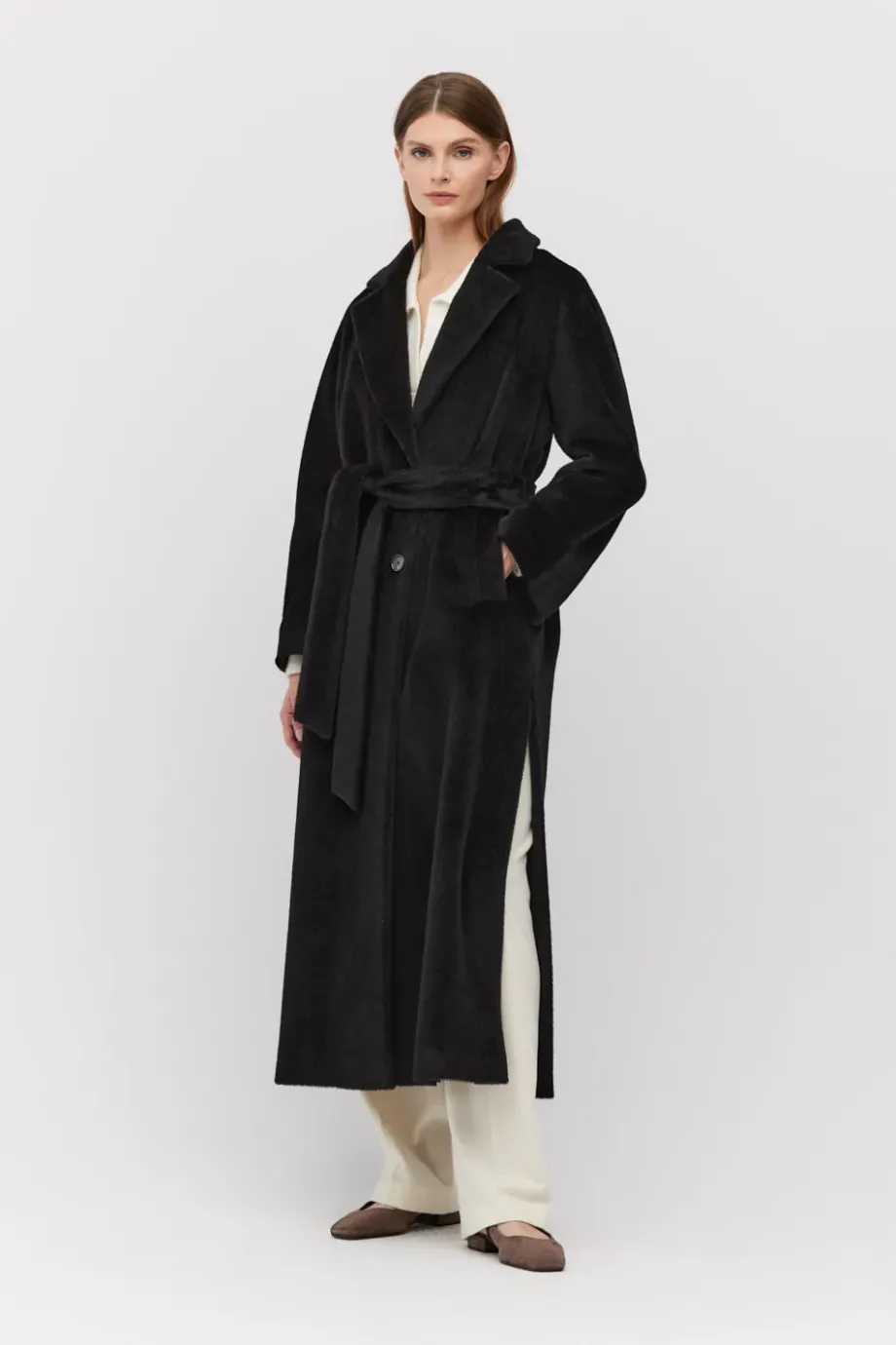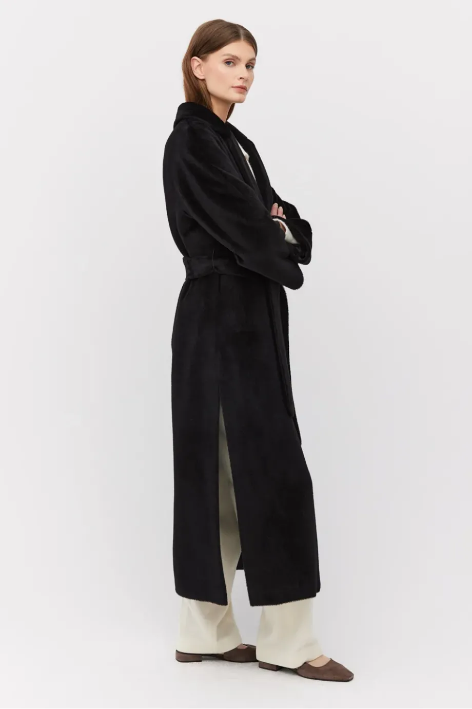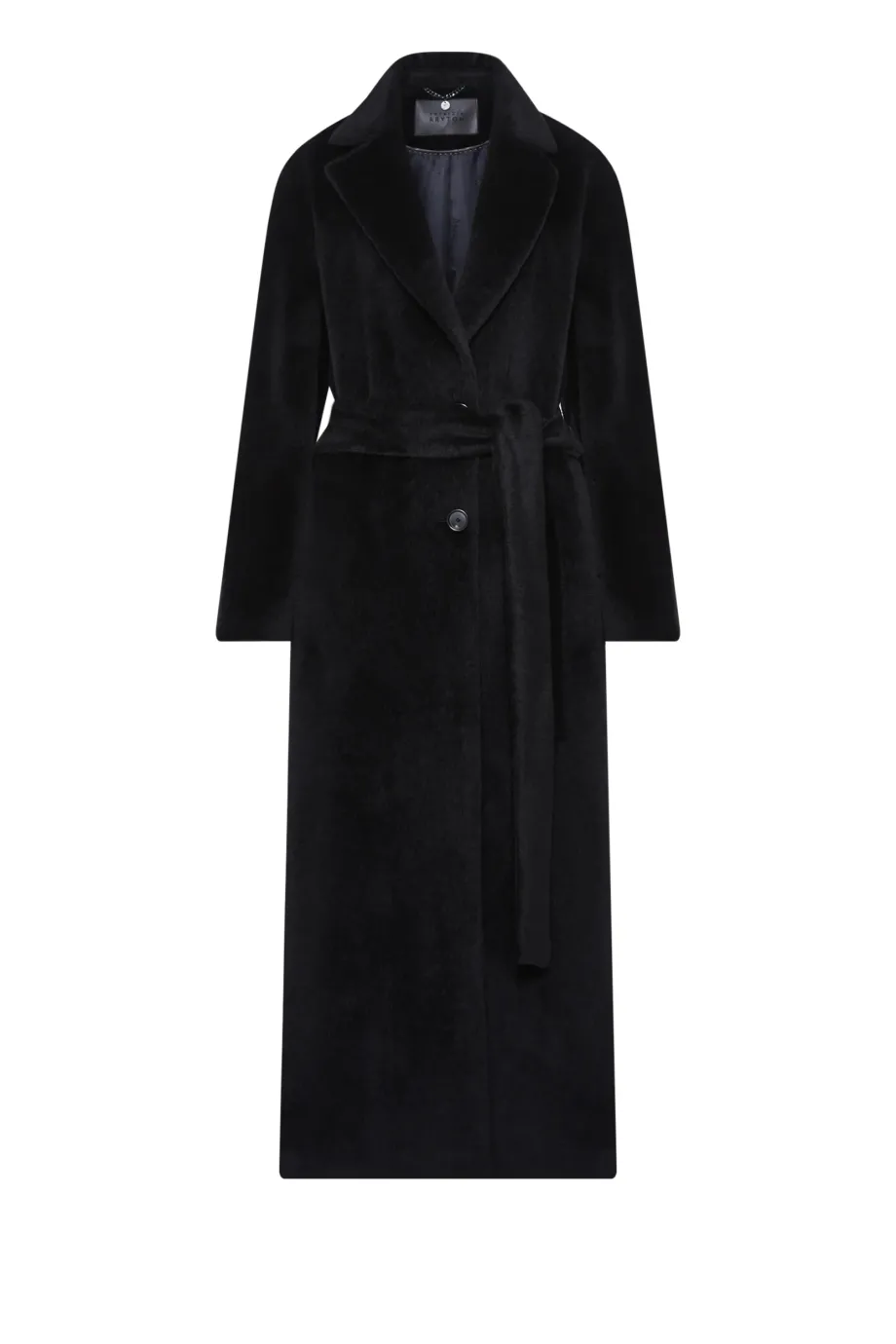 Palton midi negru cu curea din suri alpaca