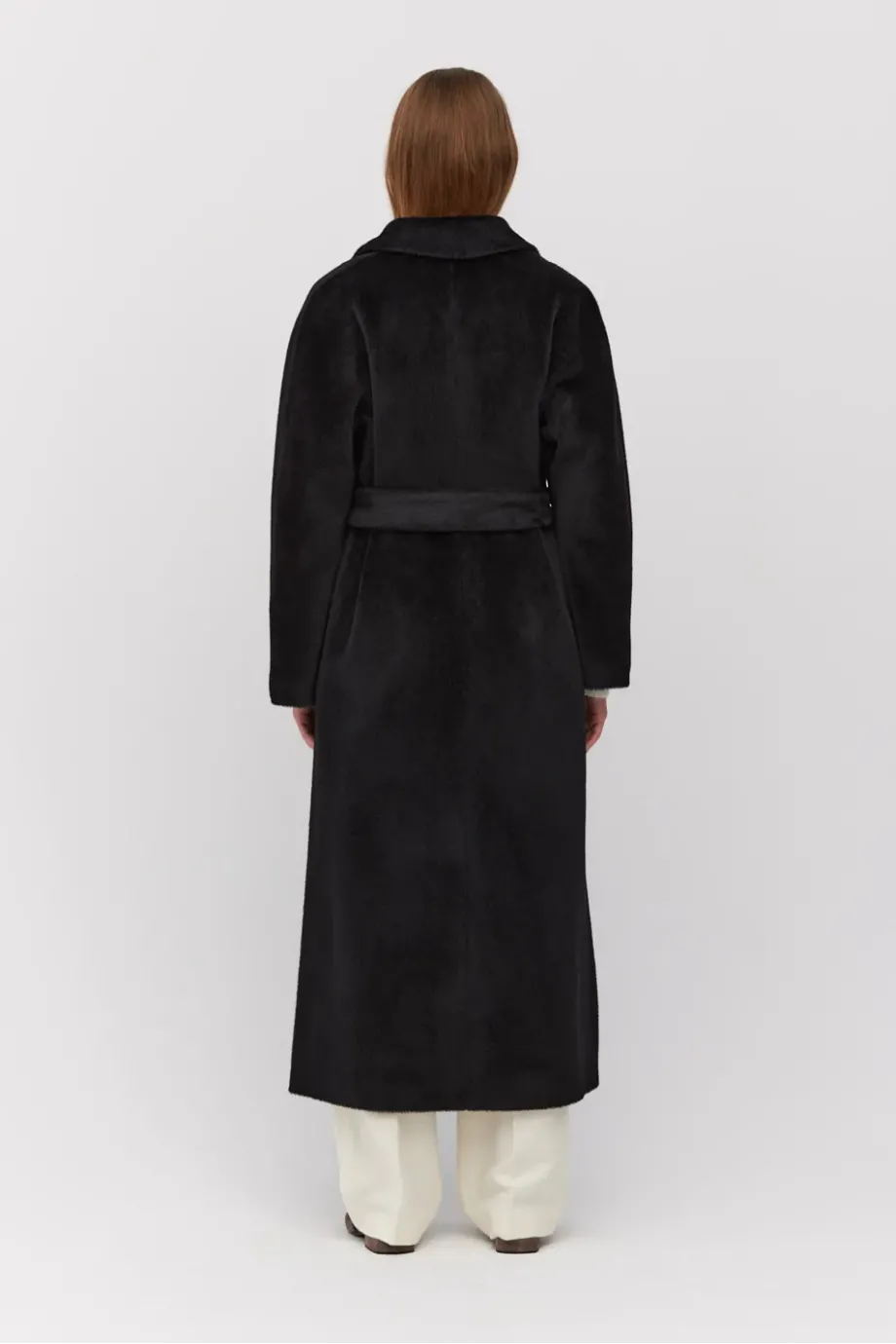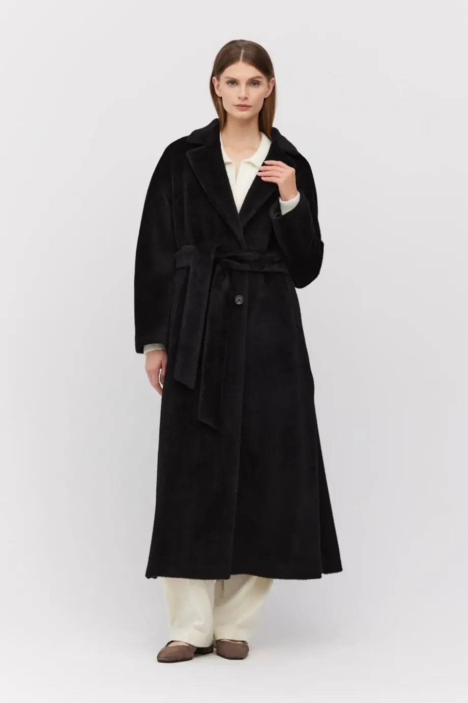 Palton midi, de culoare neagra, din material de lână alpaca Suri. Cordon în talie, mâneci și guler kimono. Complet căptușit, cu cusături decorative și paspoal interior. Închidere cu nasture corozo la interior și nasture din corn la exterior.