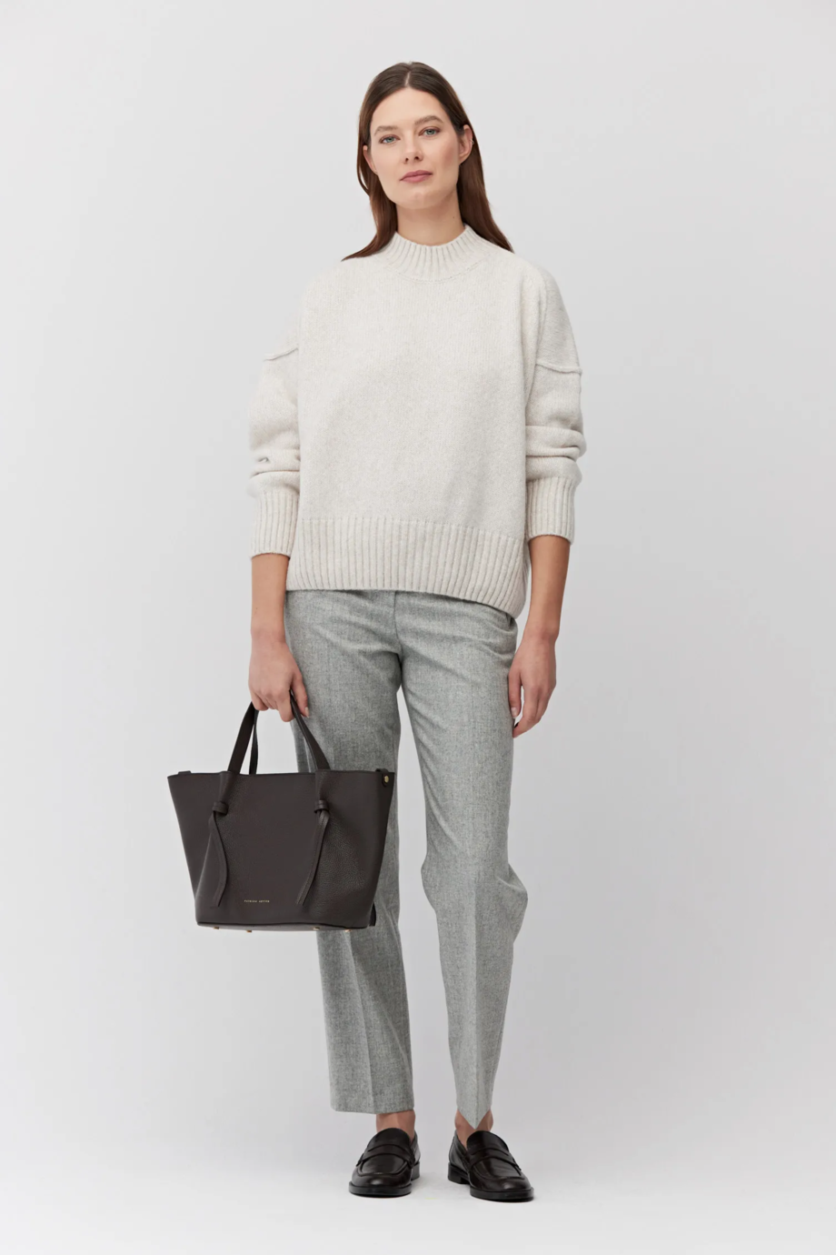 Pulover de culoare bej, din lână merinos și bumbac. Guler înalt, mâneci lungi, croială lejeră. Tricot single-jersey lejer, confecționat la mașină de calibru 2 GG.