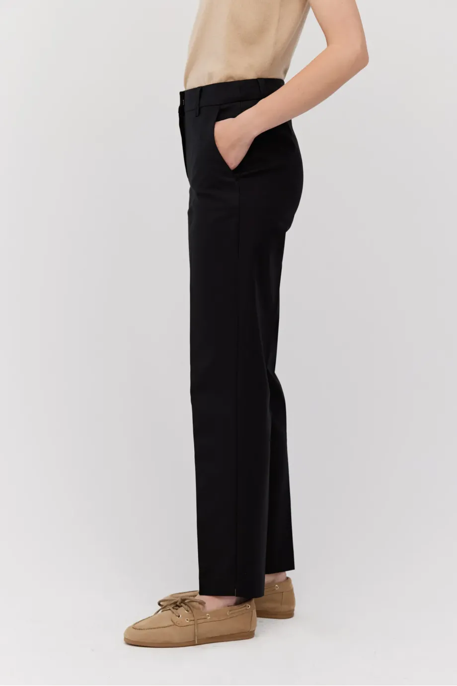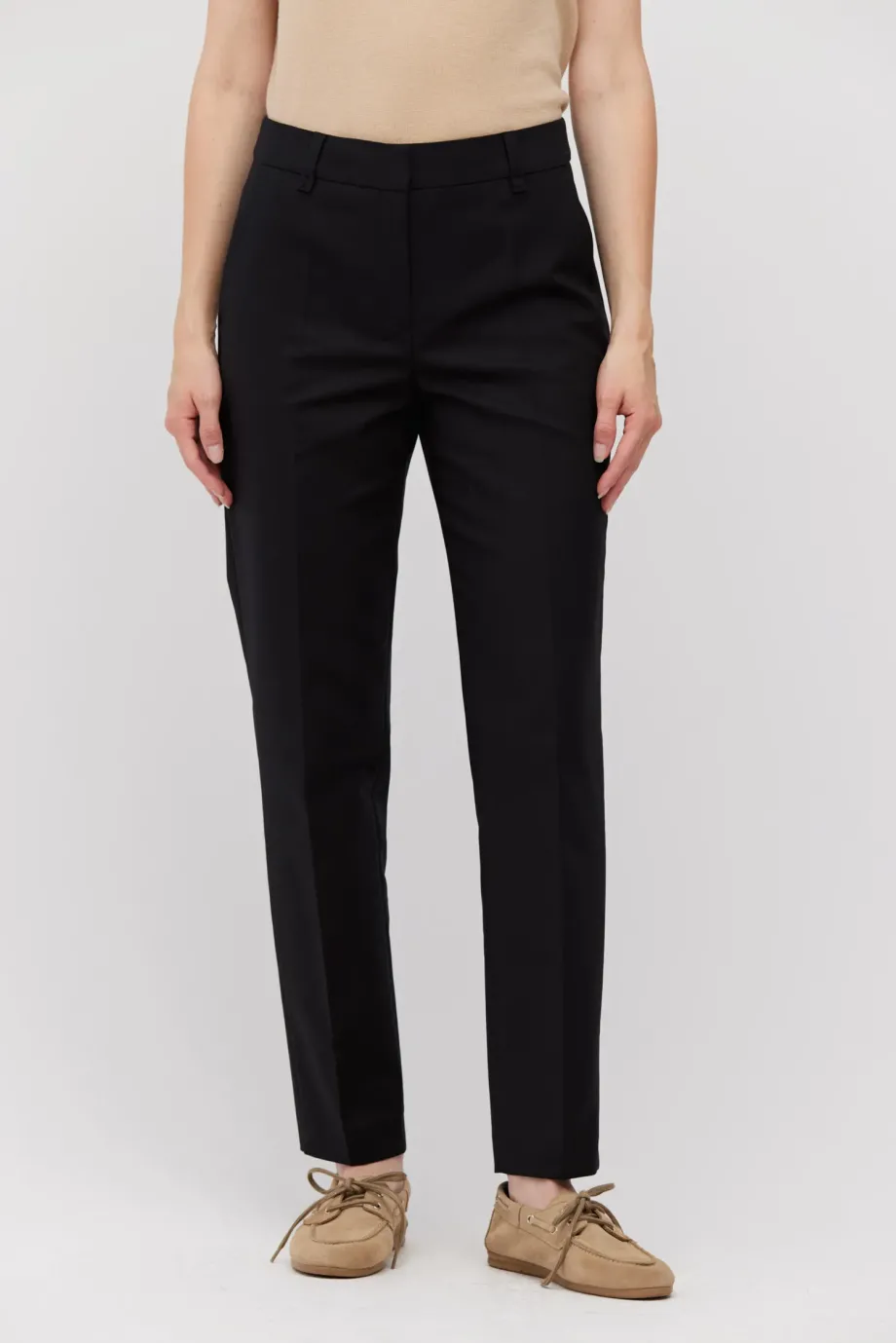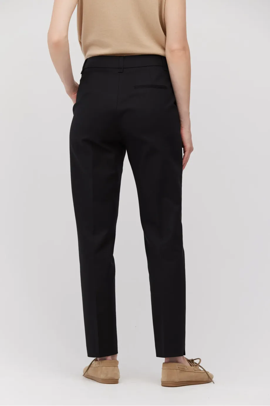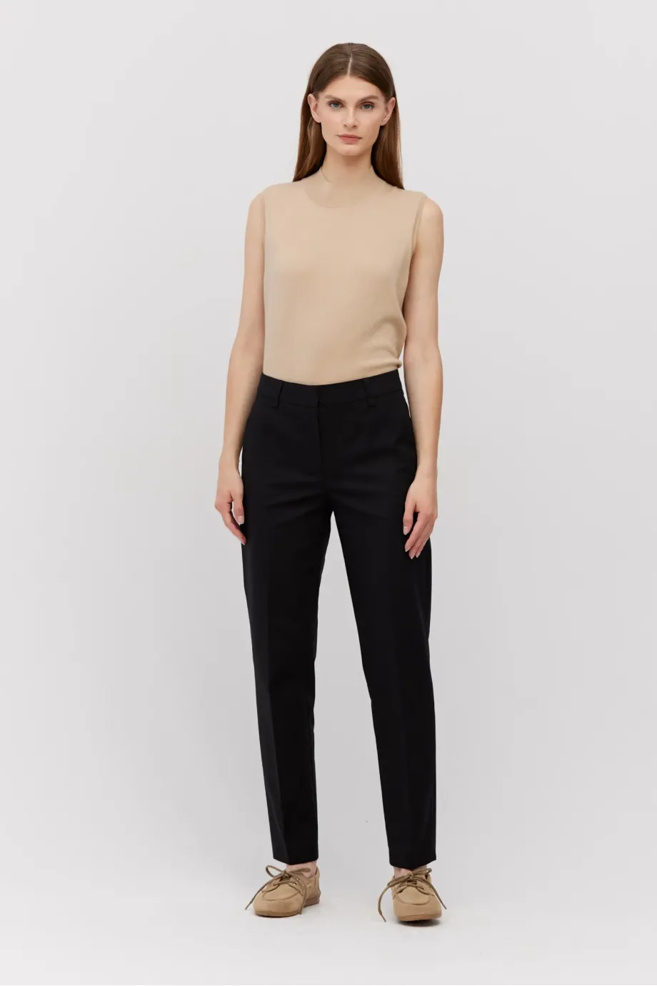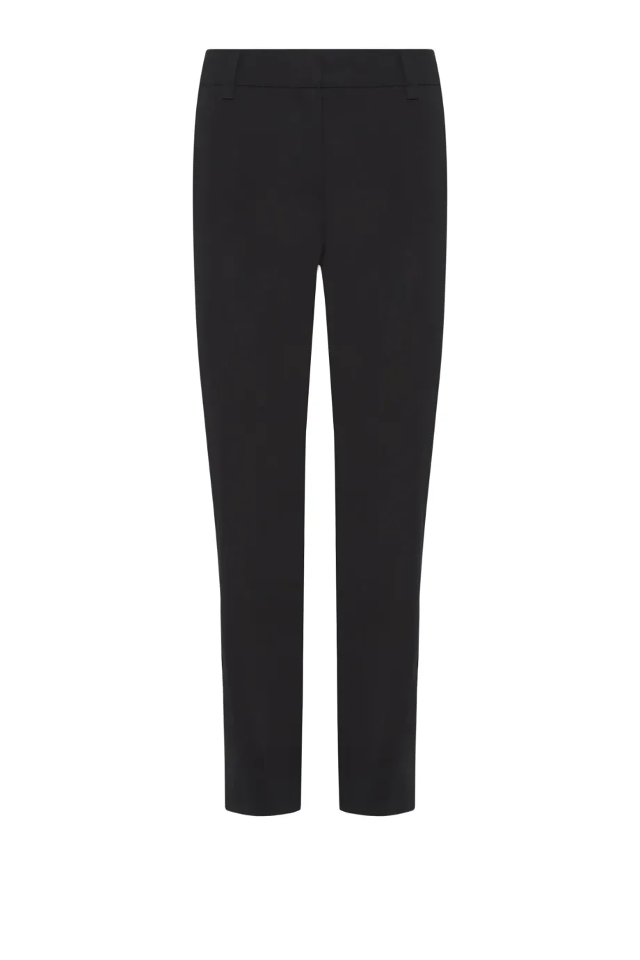 Pantaloni din bumbac cu croială conică pe picioare. Închidere cu fermoar, cârlig și nasture pe interior. Gaici pentru curea, buzunare. Paspoal decorativ pe interior. Negri.