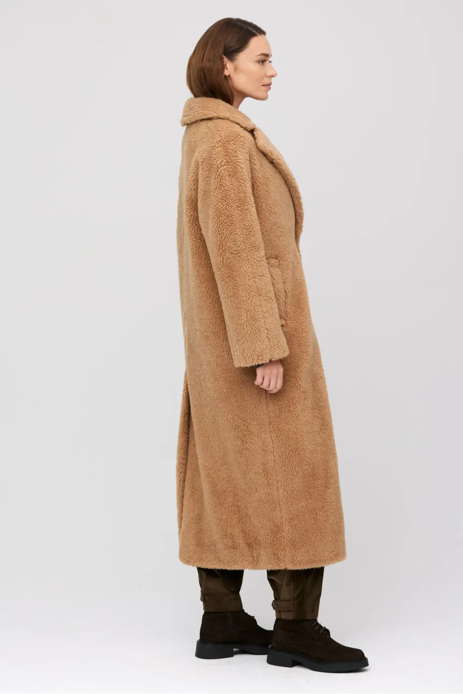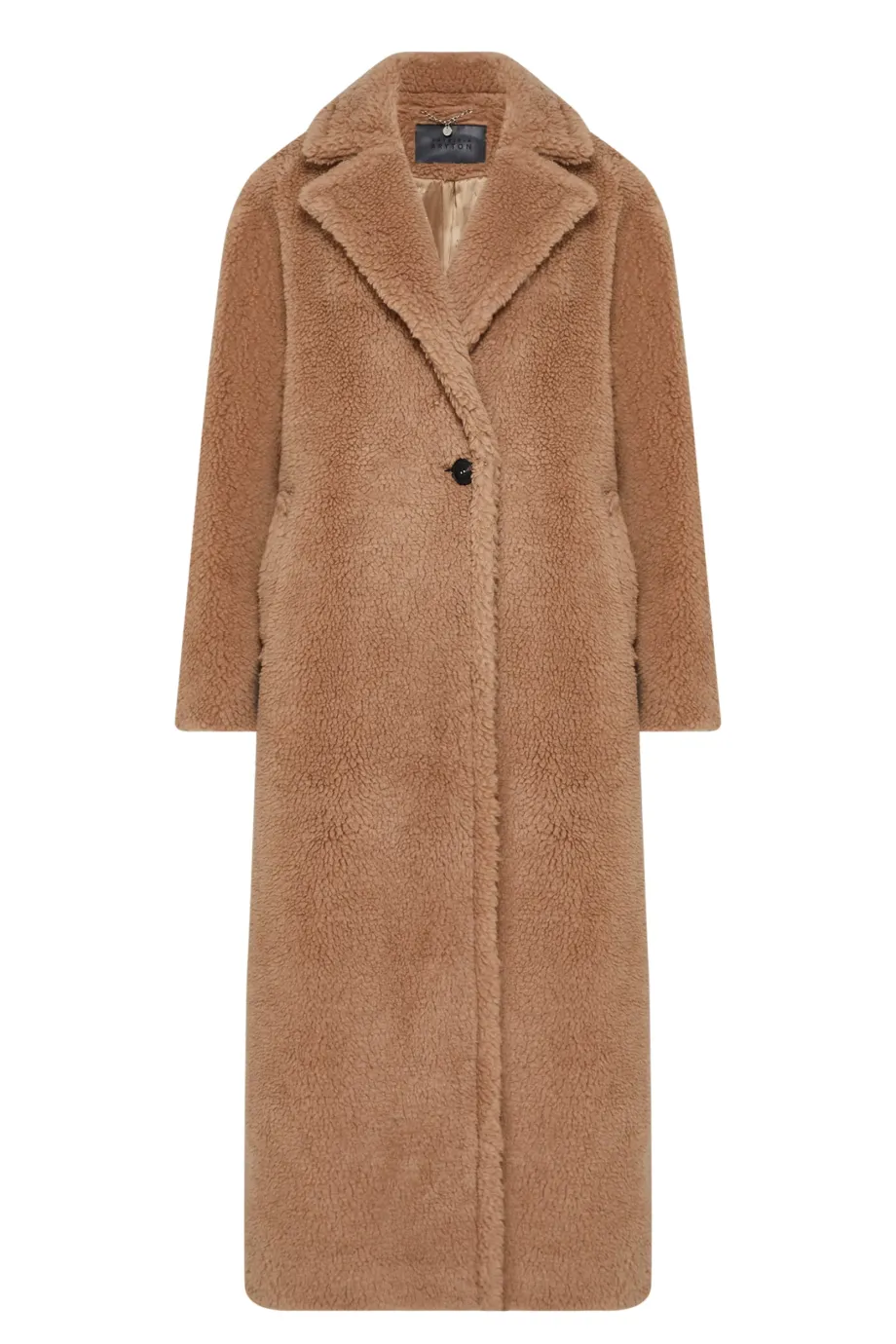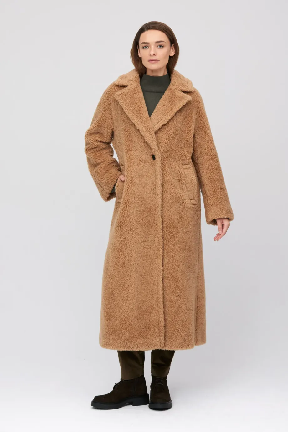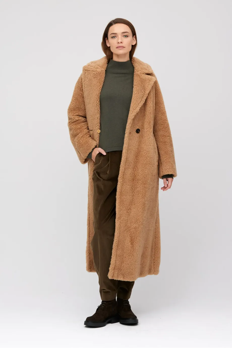 Palton teddy bear, de culoarea camel, din lână de cămilă și mătase. Croială dreaptă și lejeră, lungime midi. Model cu două rânduri de nasturi — nasture din corn la exterior și nasture din nucă în interior. Mâneci lungi, guler clasic și buzunare. Căptușit.