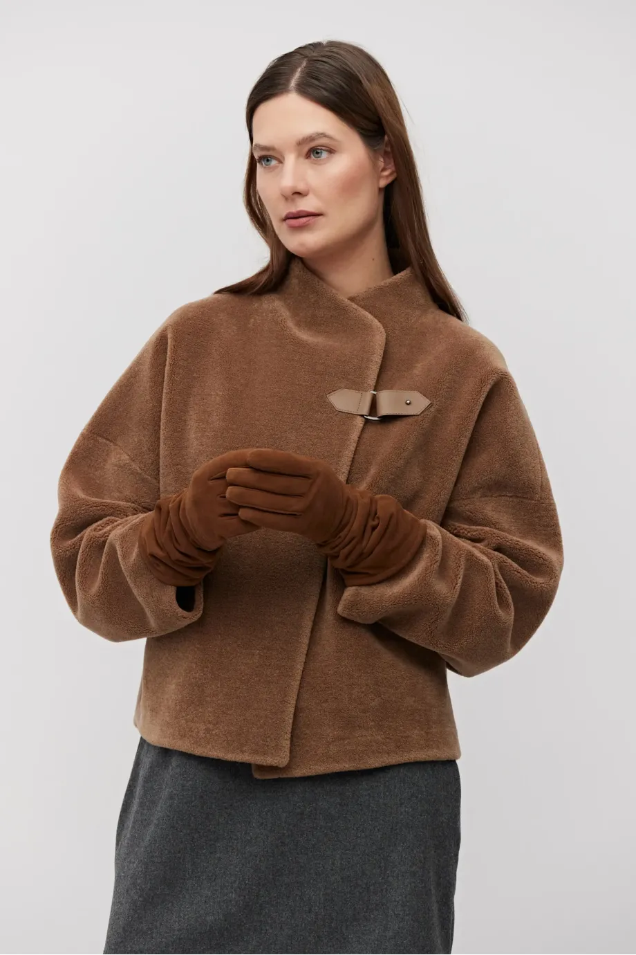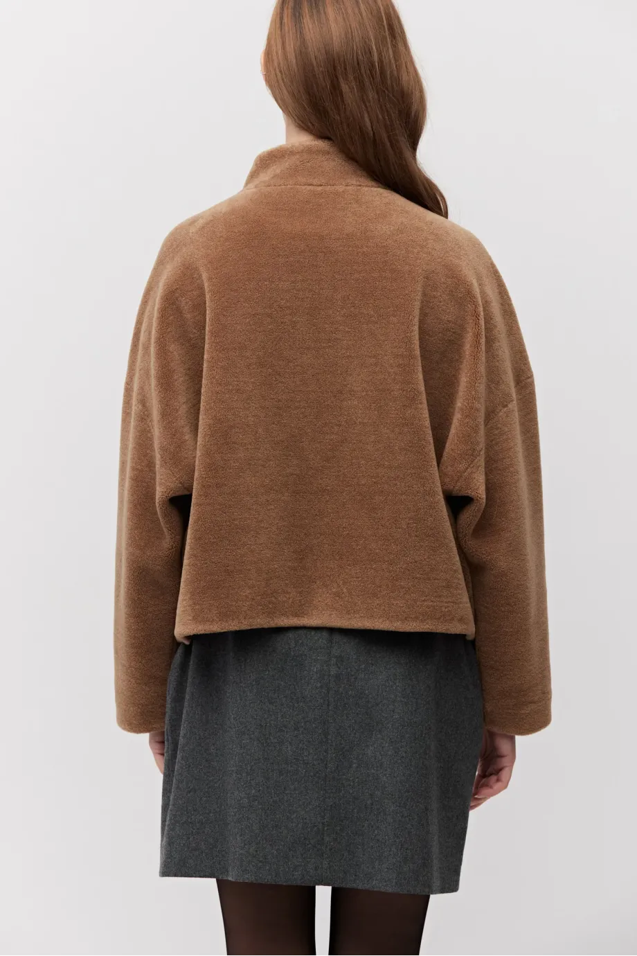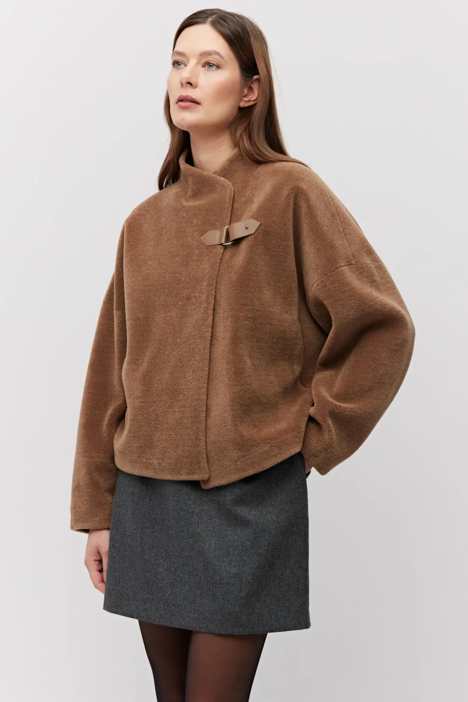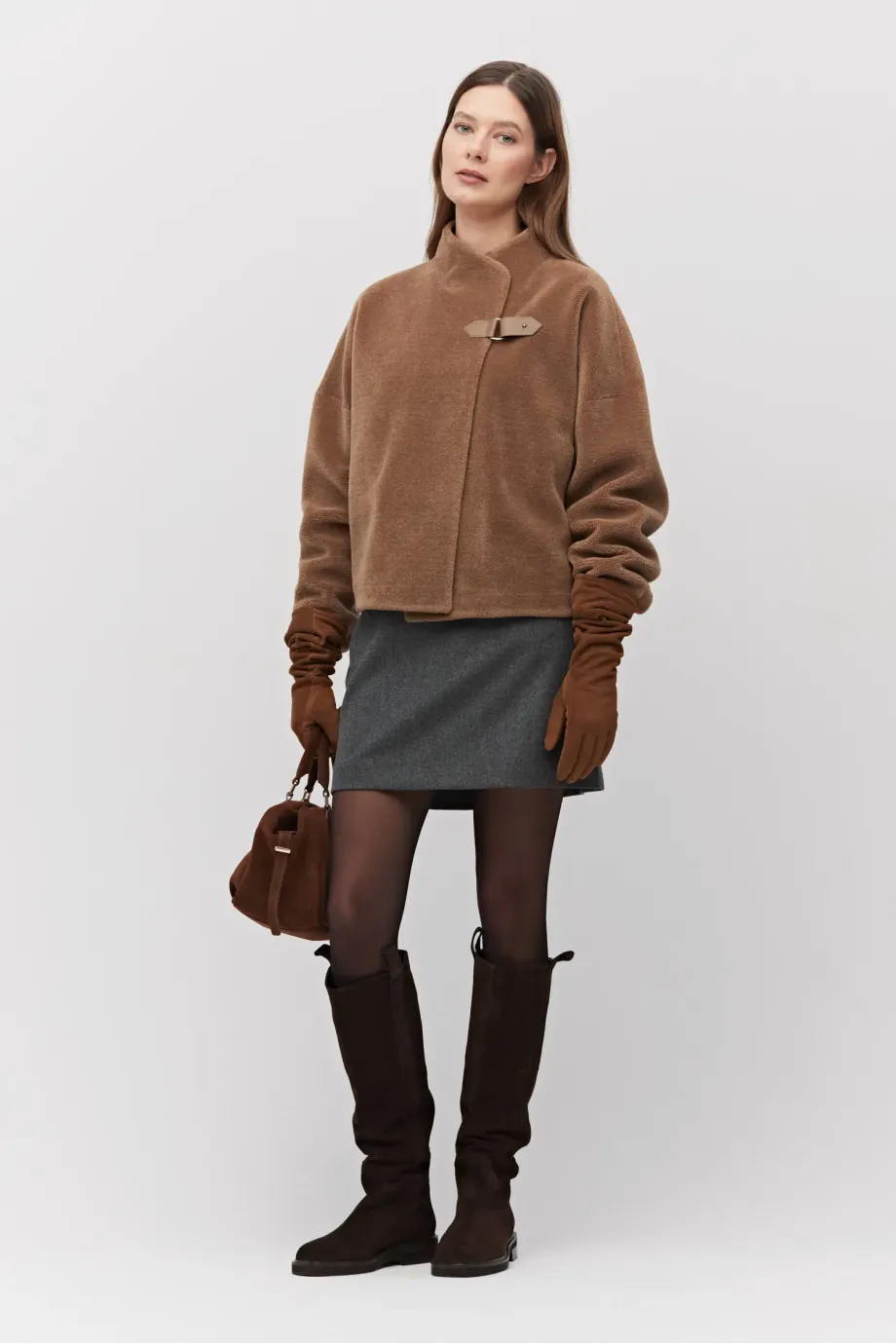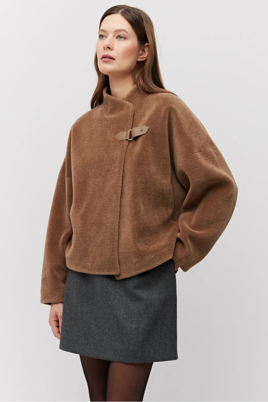Palton din lână teddy bear, croială scurtă, cu guler ridicat și închidere din piele. Mâneci lungi și buzunare. Culoarea maro.